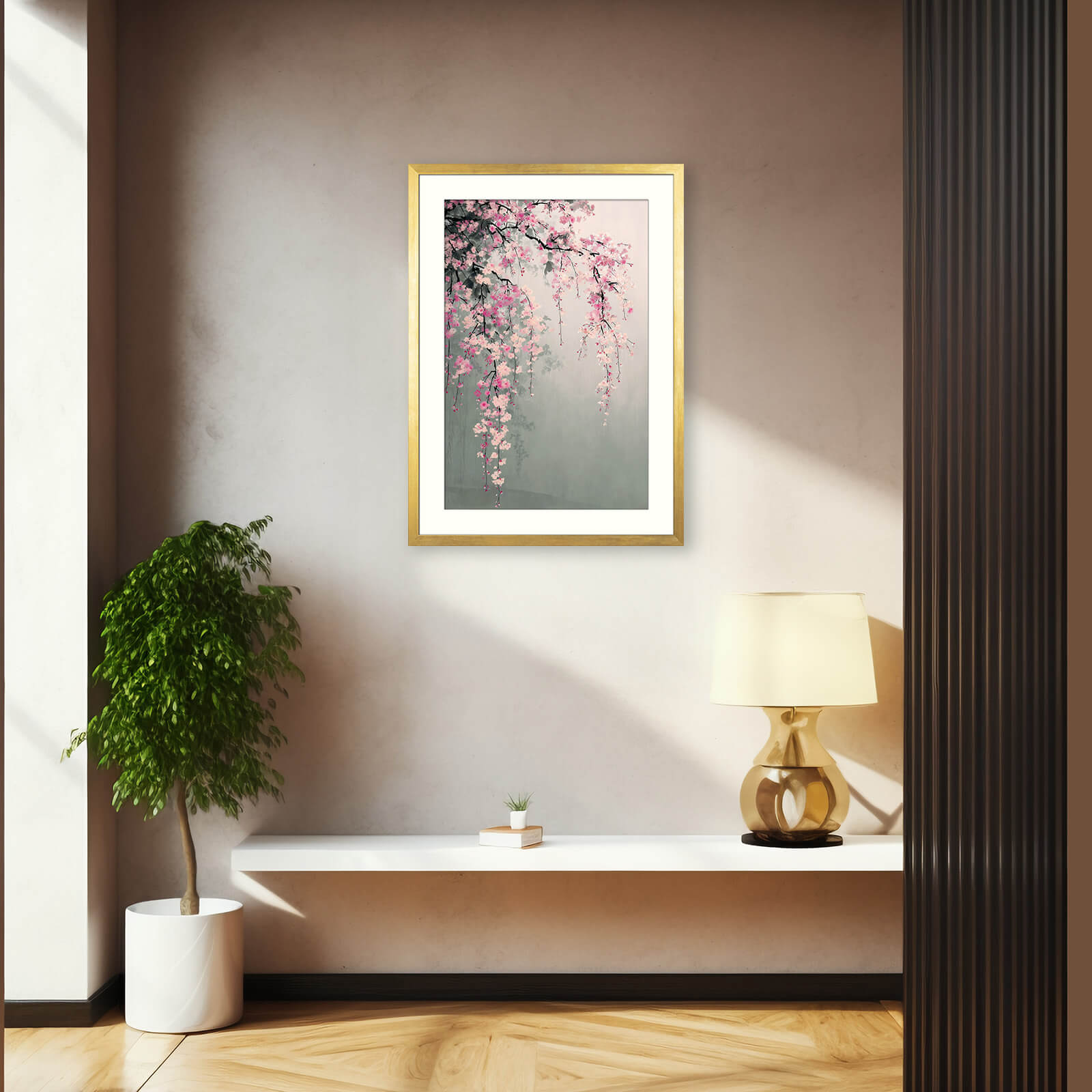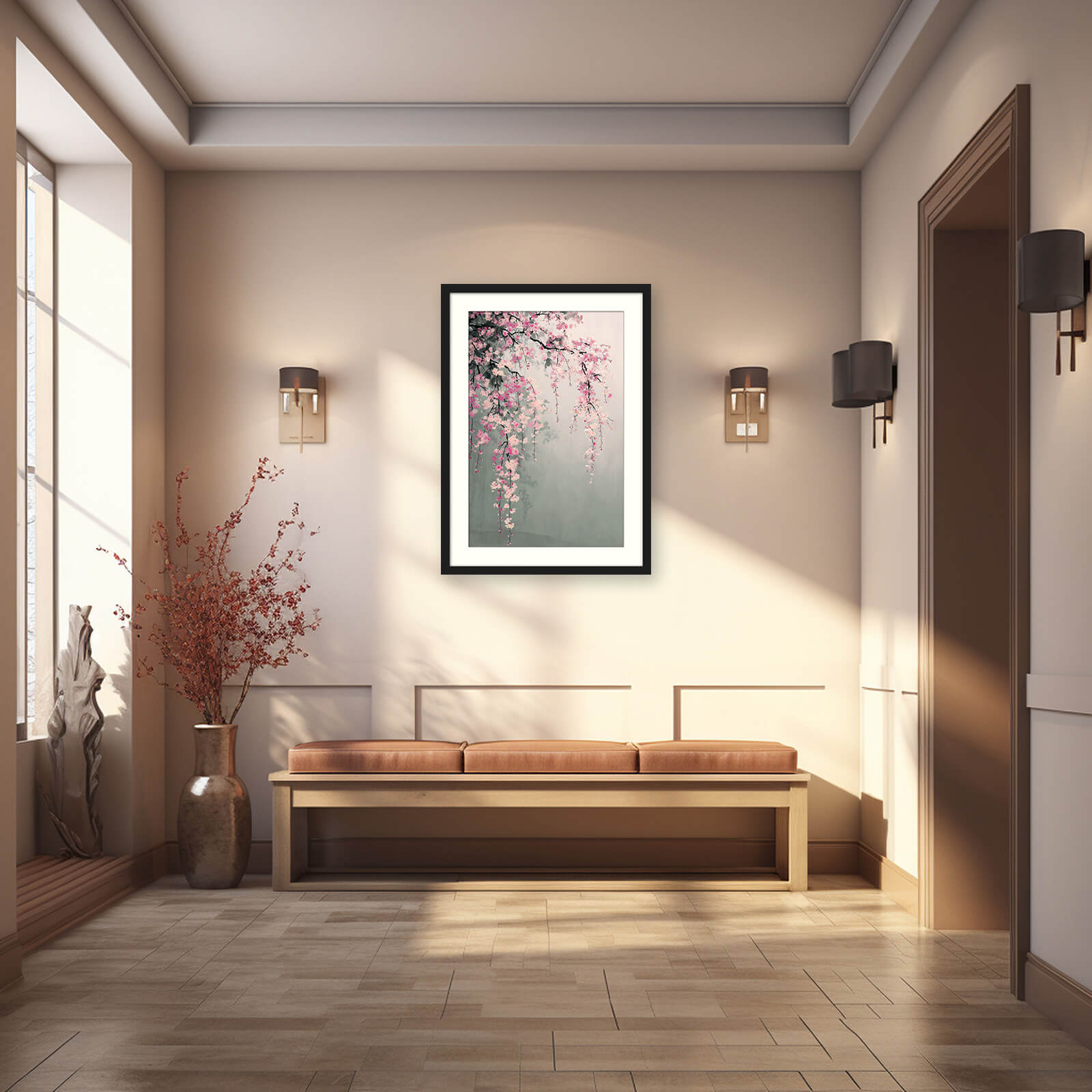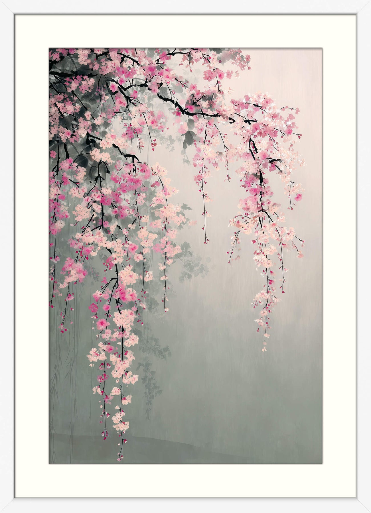 Graceful cherry blossom branches cascade across a soft, misty background in this delicate composition. The pale pink and magenta petals appear to float gently in the air, contrasted by fine black branches and subtle leafy shadows. This piece echoes the poetic elegance of Sumi-e (Ink Wash) art with a refined Minimalist aesthetic, creating a tranquil and meditative presence on any wall.