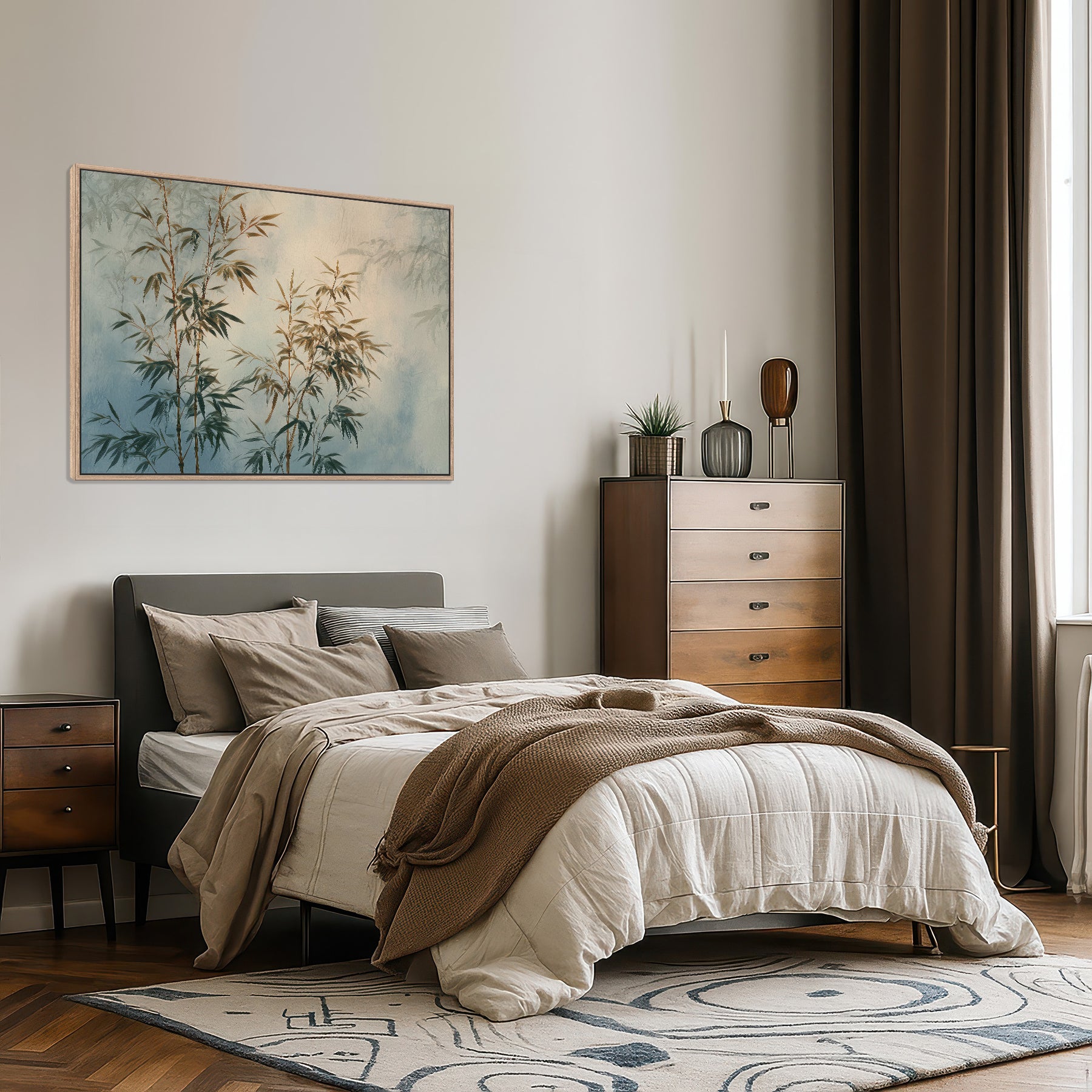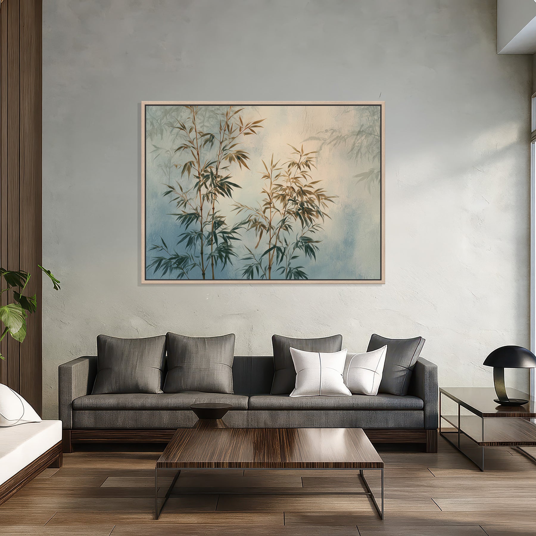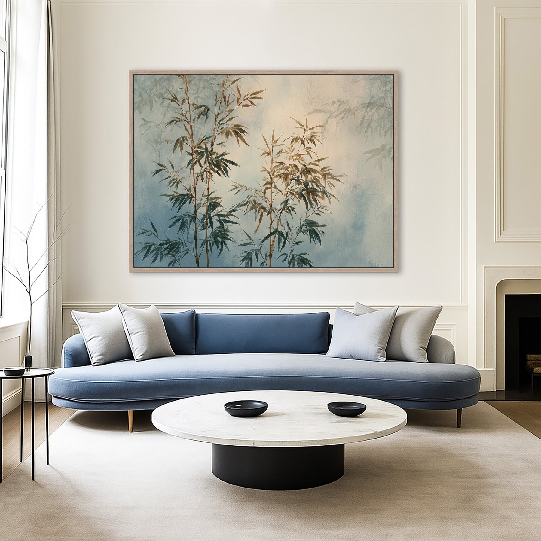 Large canvas art featuring bamboo stalks with delicate leaves against a soft, misty background. Rendered in gentle tones of sage green, warm beige, cream, and slate blue, this bamboo wall art captures a serene Asian-inspired scene with graceful, natural forms. Perfect for living rooms, bedrooms, or spa-inspired spaces. Ideal for lovers of bamboo forest art, Zen wall art themes, and sage green wall decor.