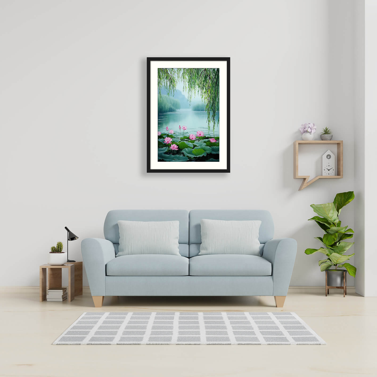 Lotus flower wall art showcasing delicate lotus blossoms and broad lily pads floating on serene water, with graceful willow-style foliage cascading above. This Japanese lotus print is a harmonious piece of botanical water lily art, blending soft pastel tones, gentle reflections, and calm natural motifs. Ideal for bathrooms, bedrooms, living rooms, or yoga & meditation spaces where tranquility and nature are desired. Complements Minimalist, Japandi, or Botanical interior styles.