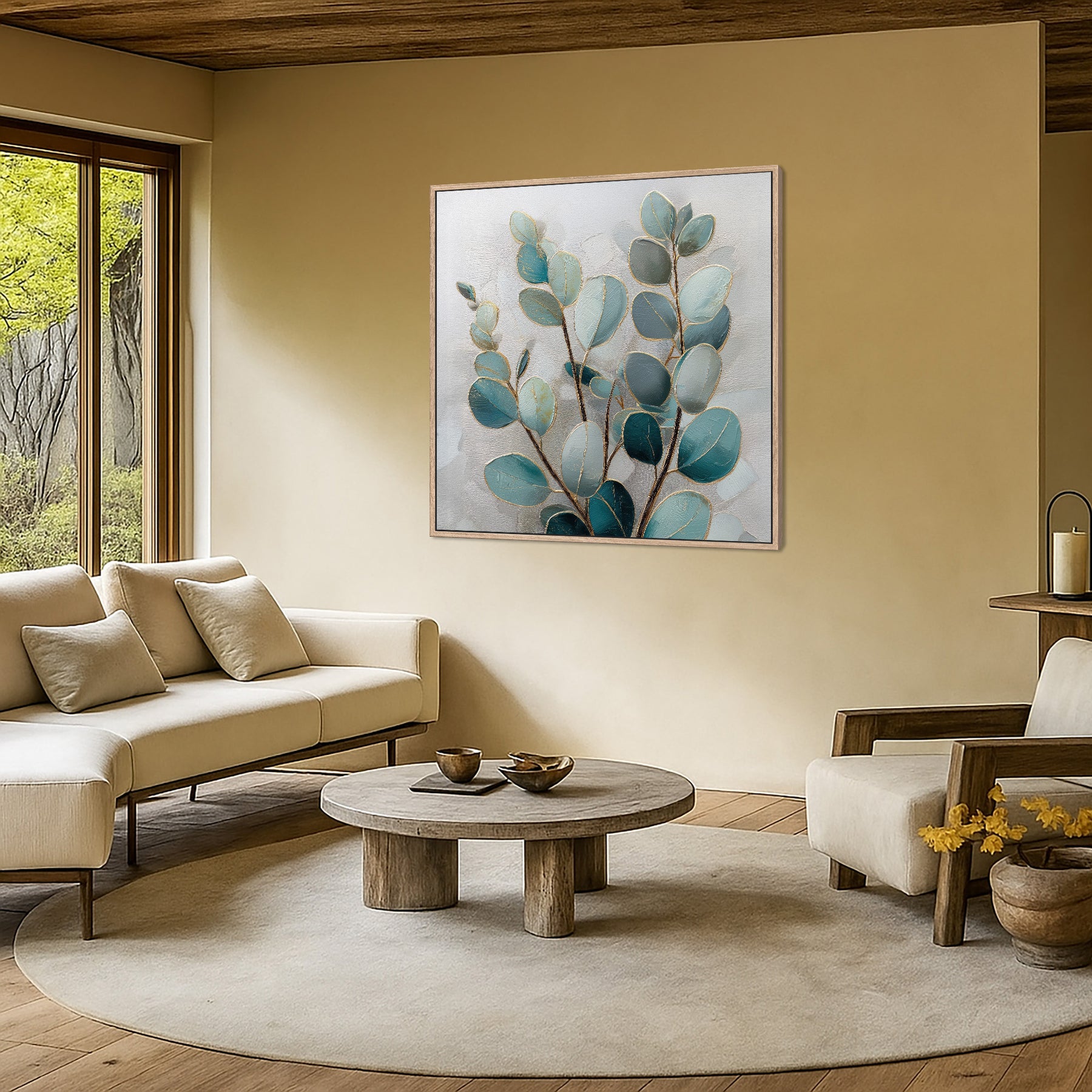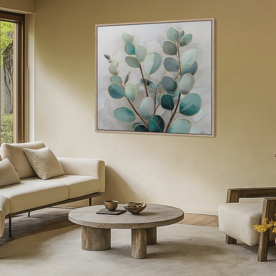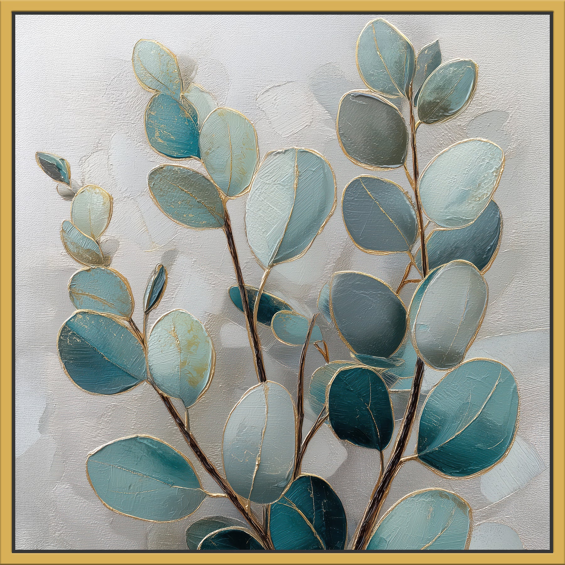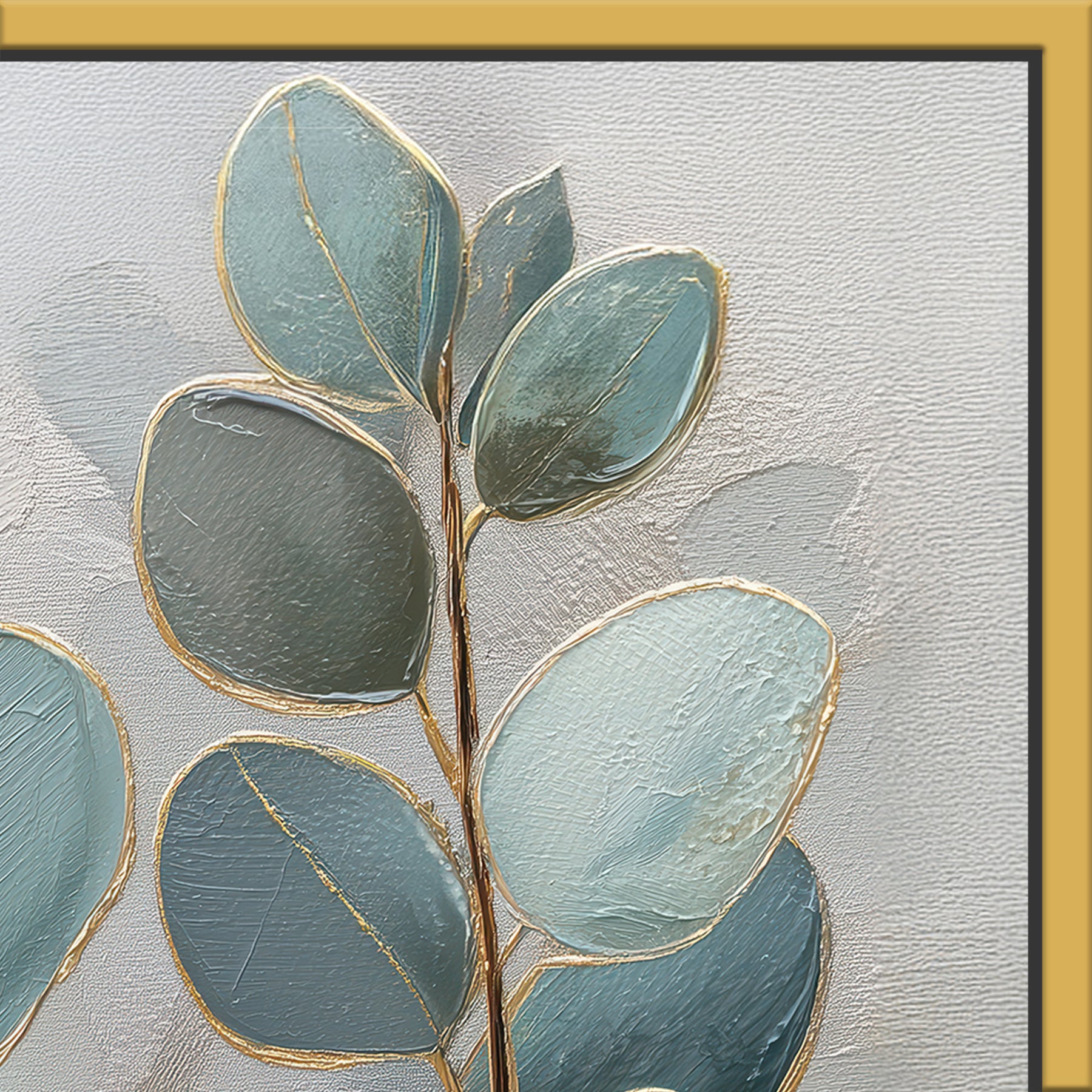 Large canvas wall art featuring eucalyptus leaves in shades of teal, sage, and deep green, each outlined with delicate gold detailing against a soft gray textured background. This botanical decor creates a sophisticated focal point with its layered leaves and metallic touches. The natural elegance and calming color palette make it perfect for living rooms, bedrooms, or nature-inspired spaces. Ideal for lovers of green leaf or botanical wall art themes and eucalyptus wall art decor.