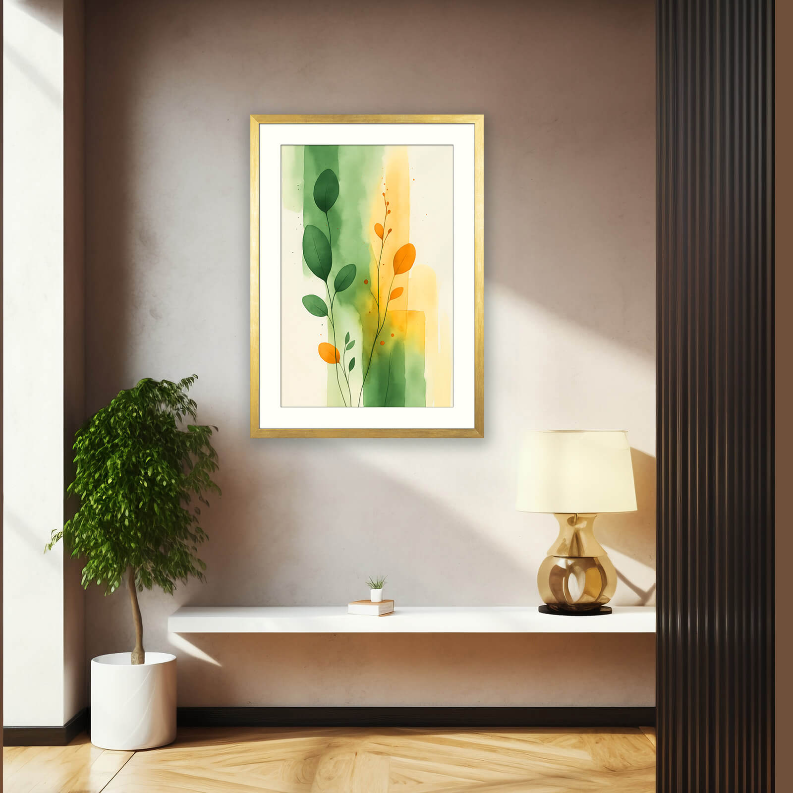 This green botanical wall art showcases tall watercolor leaves and branches in soft gradients of green, gold, and orange. The vertical brushstrokes evoke natural growth and calm movement, making this a beautiful minimalist leaf print that blends organic form with fluid design.