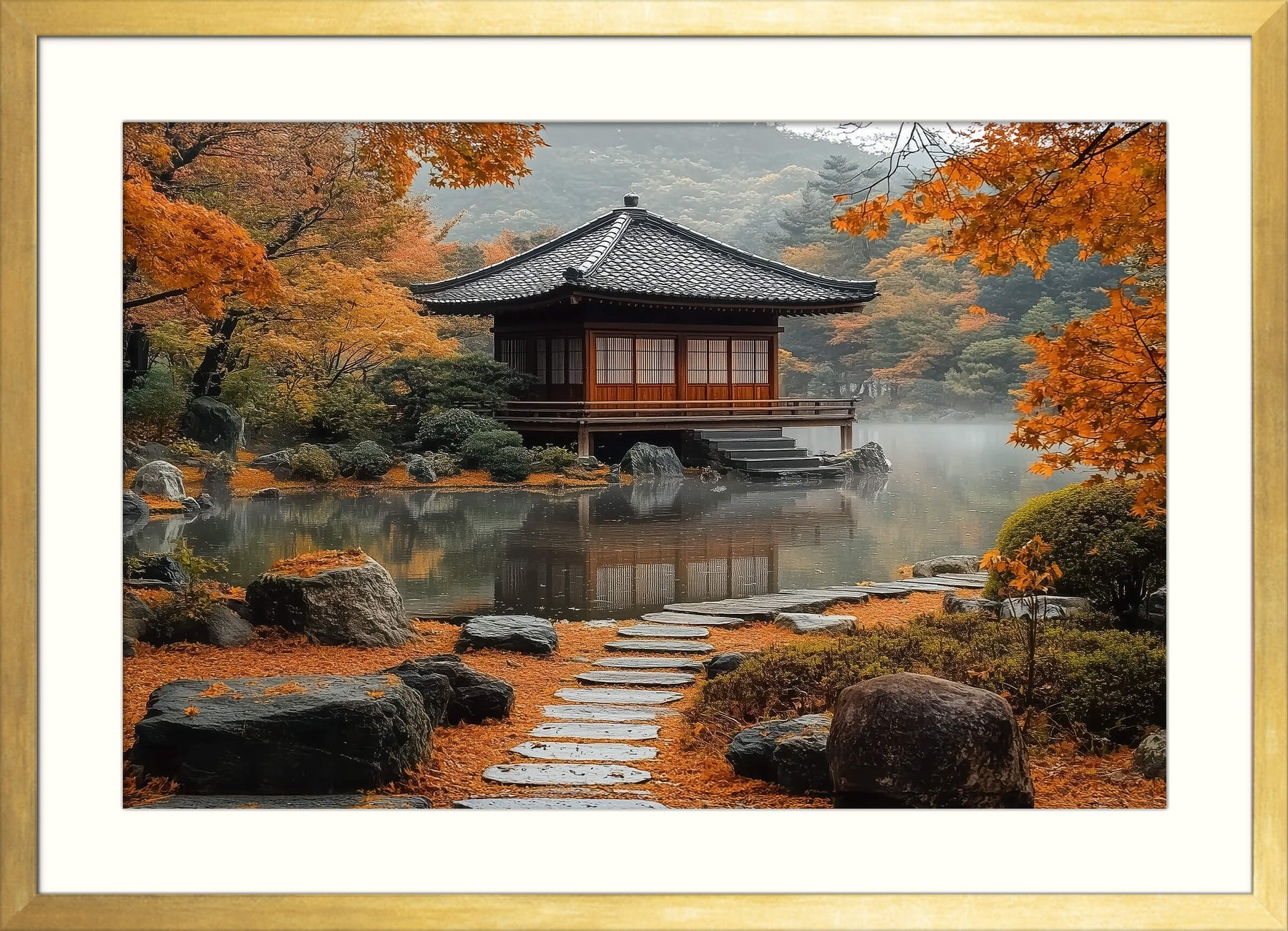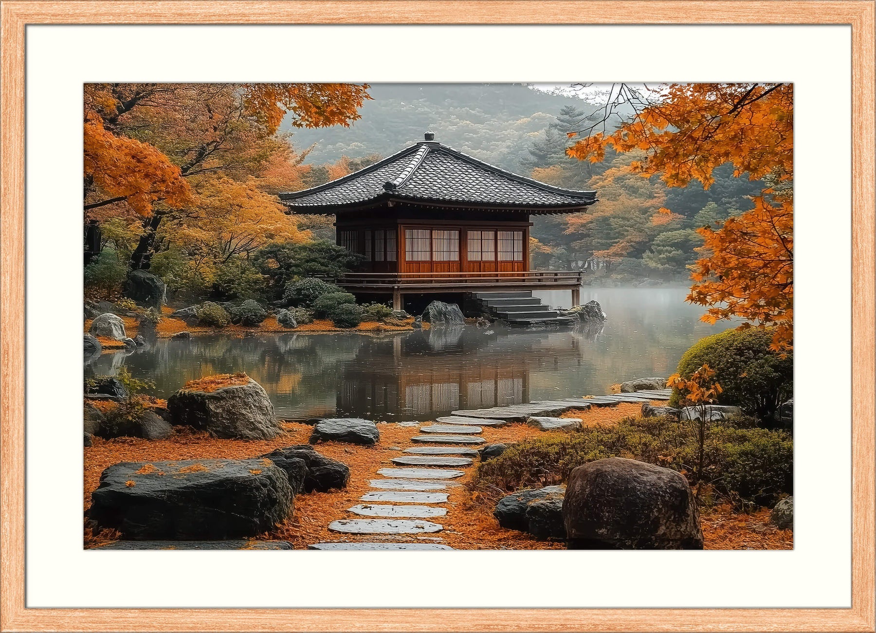 Notice the rich reds and oranges of the falling leaves, the smooth reflection in the water, the step‑stones leading into the scene, and the peaceful structure of the traditional wooden house set against soft mist and distant trees. Adds colour and depth without overwhelming surrounding décor.