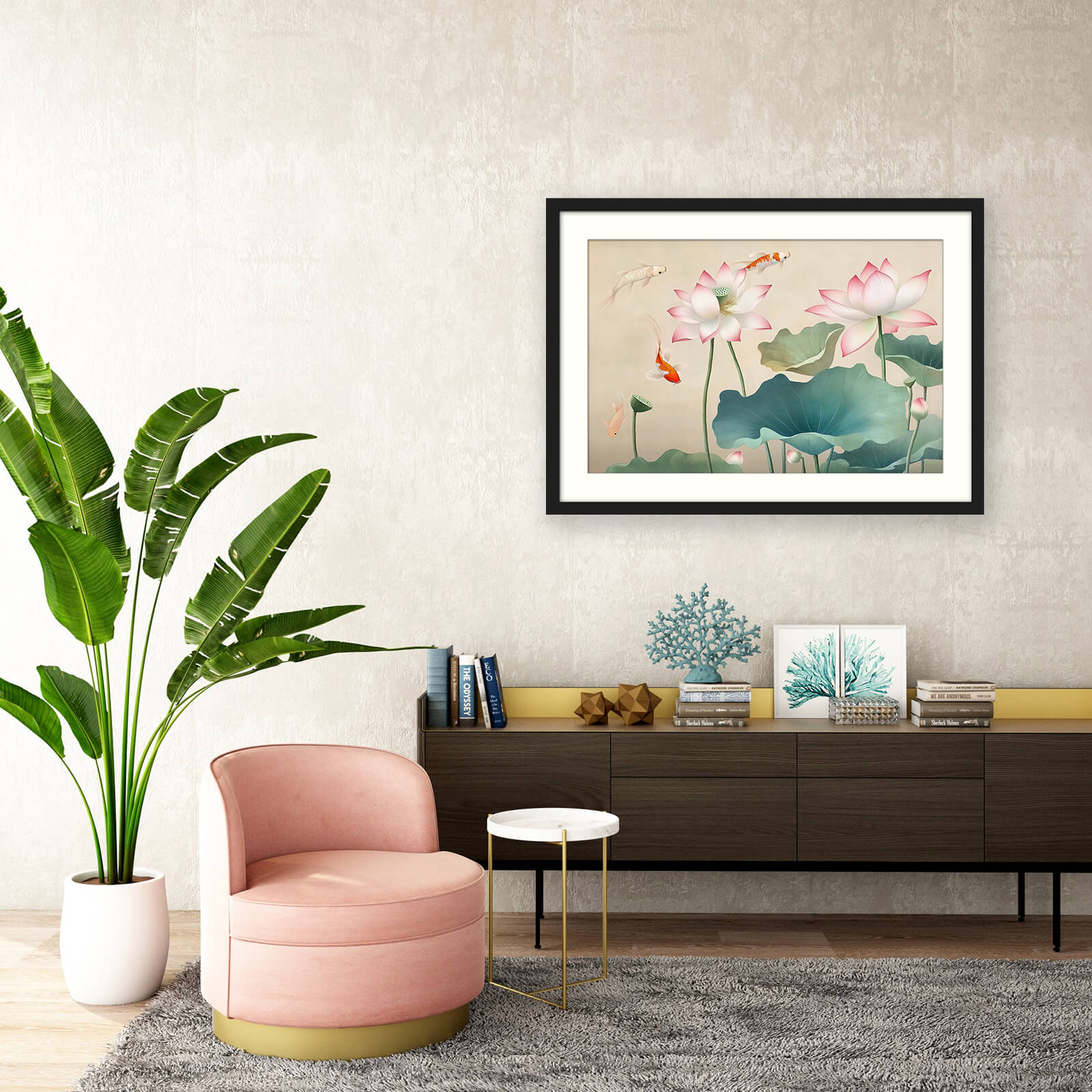 - Balances vibrant koi with soft lotus tones for visual harmony