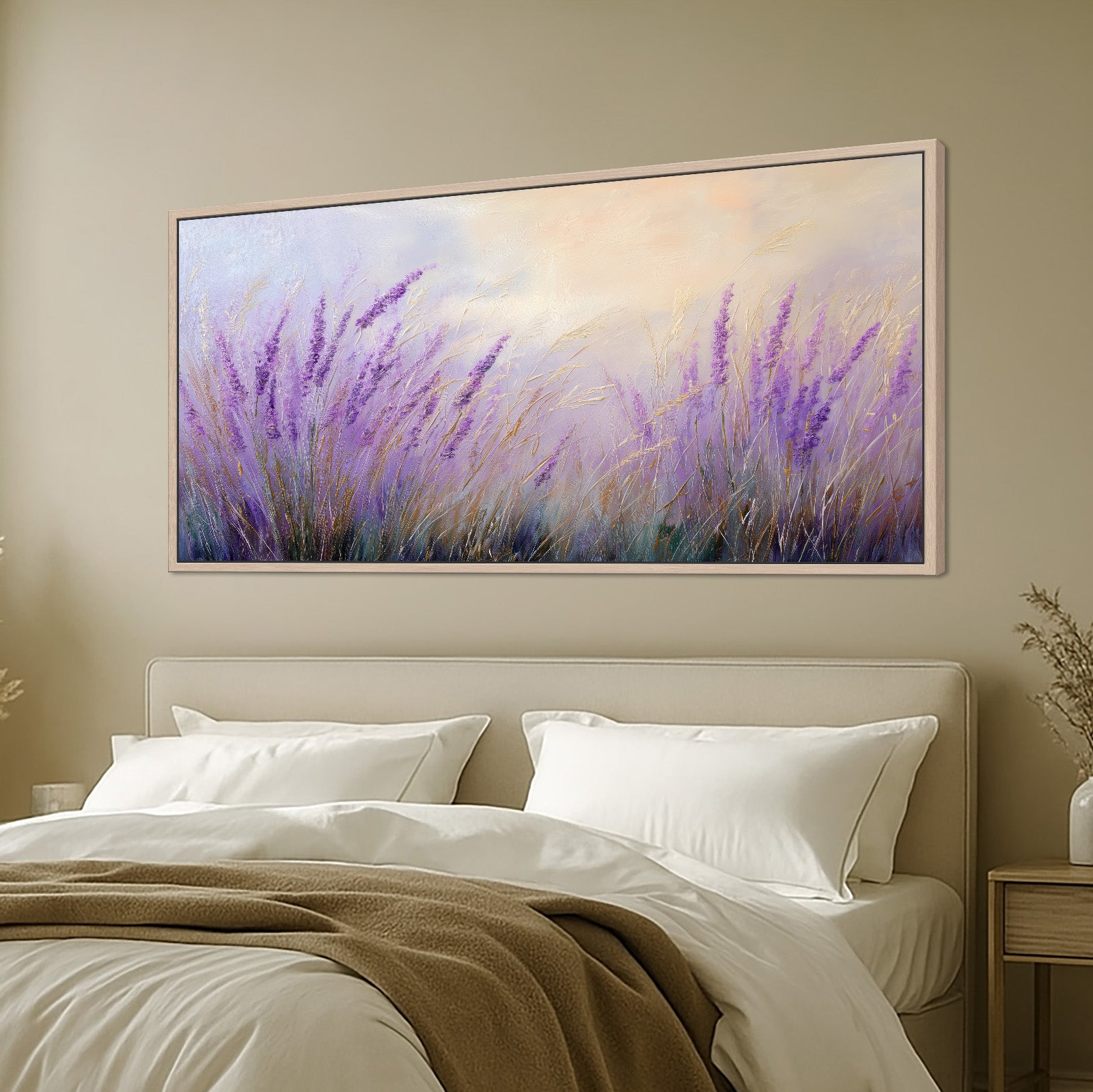 Panoramic canvas wall art featuring lavender and golden grasses swaying in a dreamy meadow. Rendered in soft shades of purple, lilac, cream, and gold, this lavender wall art landscape is perfect for living rooms, bedrooms, or nature-inspired spaces. Ideal for lovers of lavender art themes, countryside nature landscapes, and purple decor.