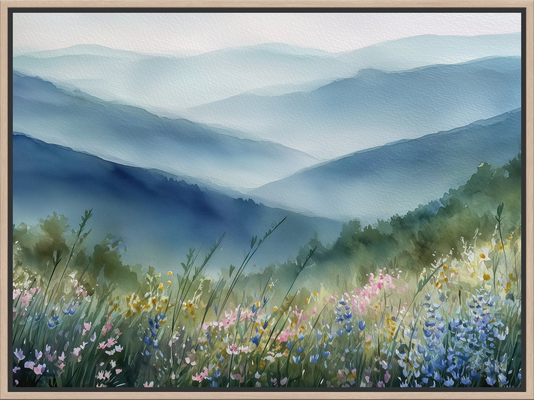Large canvas wall art featuring a wildflower meadow in the foreground with misty mountains in the the distance. This piece showcases colorful blooms in pink, blue, yellow, and white against lush green grasses, set beneath soft blue mountain ranges and a pale sky. Perfect for living rooms and bedrooms, this panoramic nature scene brings the beauty of natural scenery indoors with its peaceful composition and fresh color palette. Ideal for lovers of mountain wall art themes or floral landscape decor.