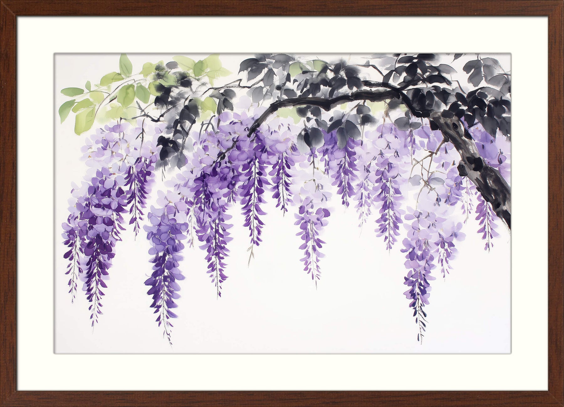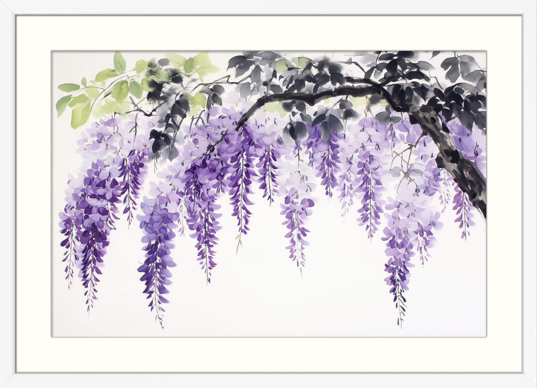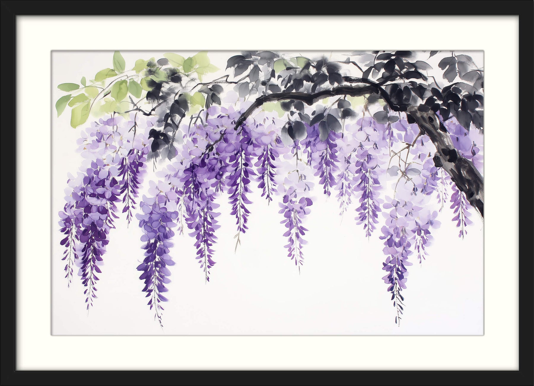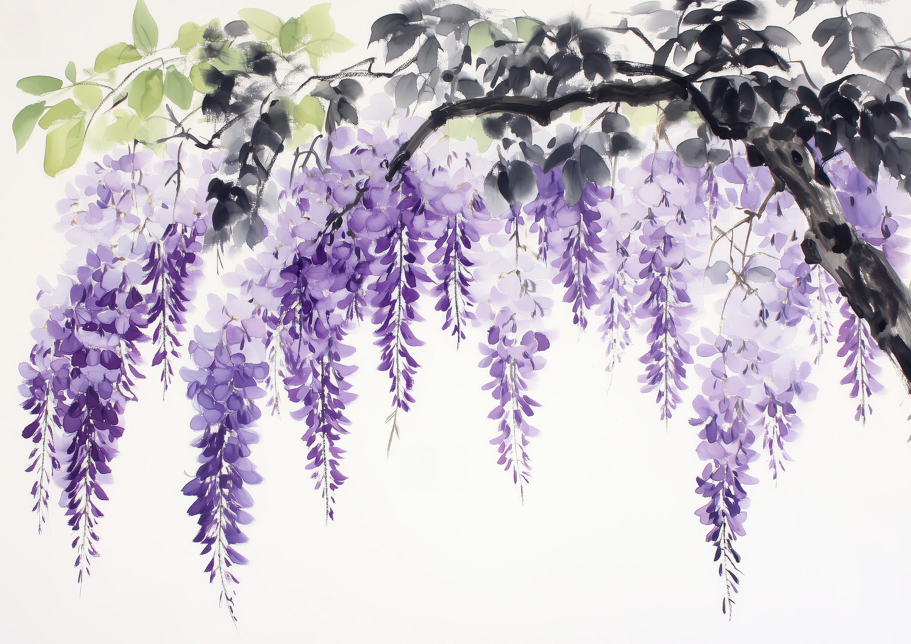 A delicate branch of cascading purple wisteria blooms arches gracefully across the canvas, painted in the soft, fluid style of traditional Japanese sumi-e. Light green and charcoal-black leaves offer gentle contrast to the violet flowers, creating a tranquil composition that evokes the beauty of spring gardens in Japan.