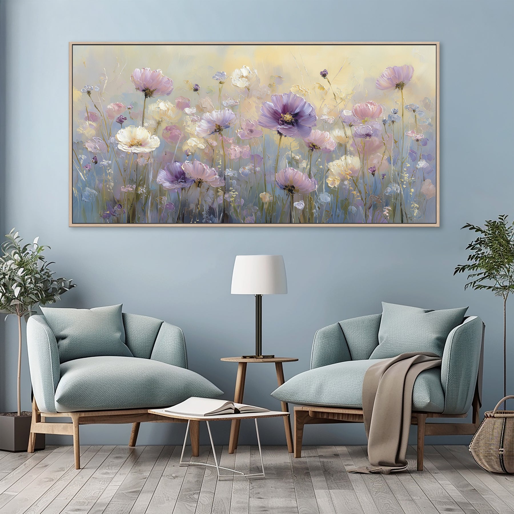 Panoramic wall art canvas featuring purple and white wildflowers swaying in a dreamy meadow. Rendered in soft shades of lavender, lilac, cream, and pale blue, this floral landscape canvas captures a peaceful garden moment with its elegant, impressionistic style. Perfect for living rooms, bedrooms, or nature-inspired spaces. Ideal for lovers of wildflower floral art themes, and purple wall art decor.