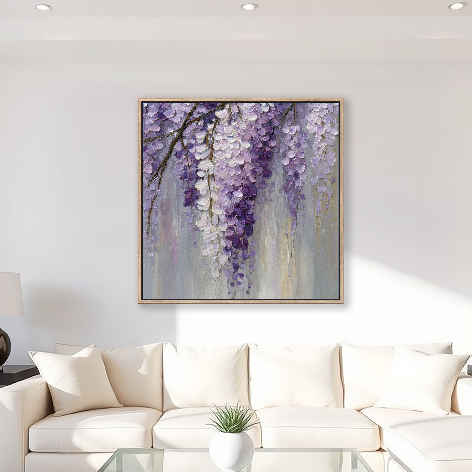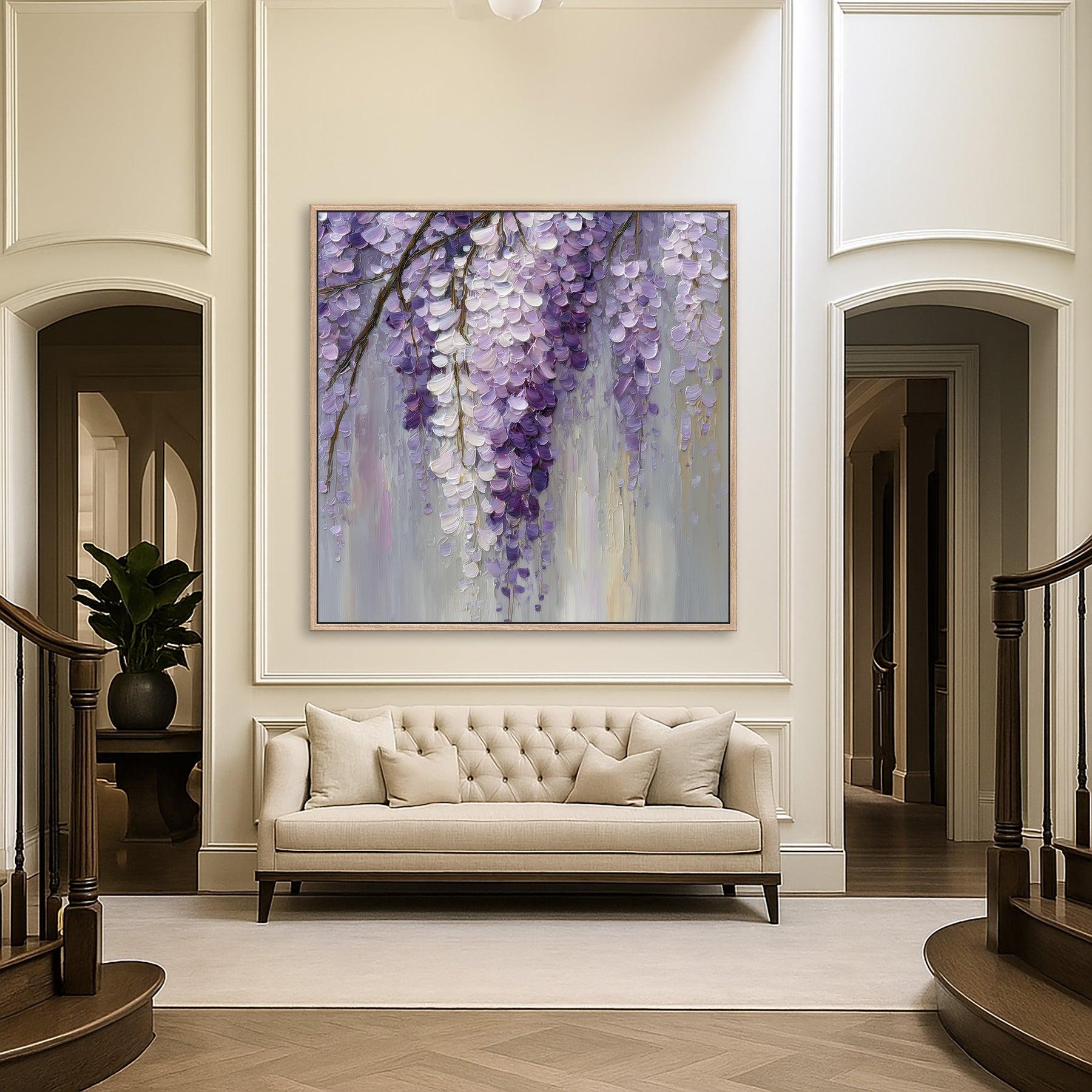 Square canvas wall art featuring cascading purple and white wisteria flowers. This floral canvas art displays hanging blooms in shades of lavender, violet, and cream against a soft gray background with olive-green stems. Perfect for bedrooms, living rooms, or botanically themed spaces. Ideal for lovers of wisteria wall art, purple wall decor, and botanical canvas art.