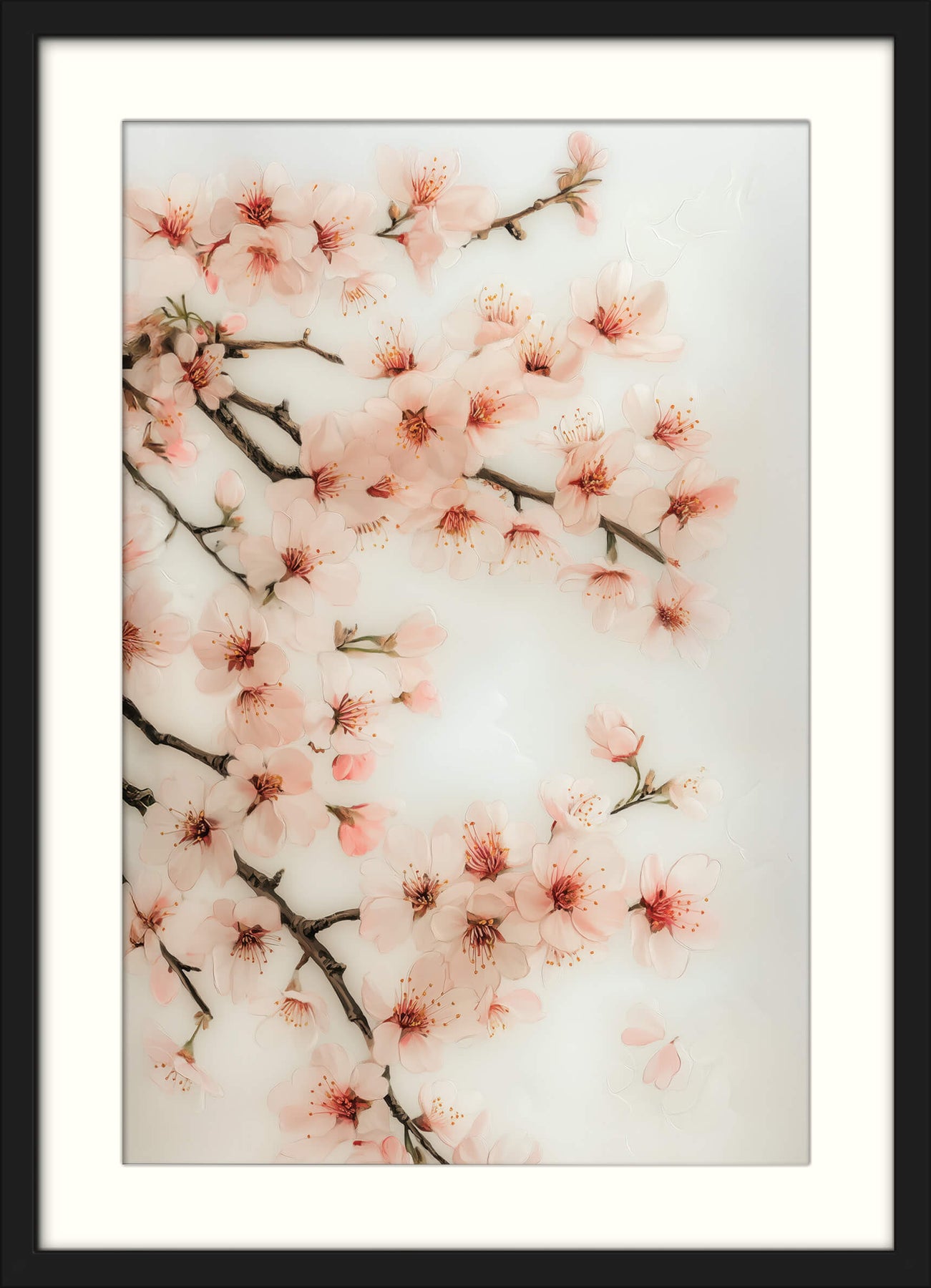 This elegant cherry blossom wall art features soft pink sakura flowers blooming across slender branches on a subtle white background. The gentle tones and delicate details make this piece ideal for creating a calm, light-filled space.