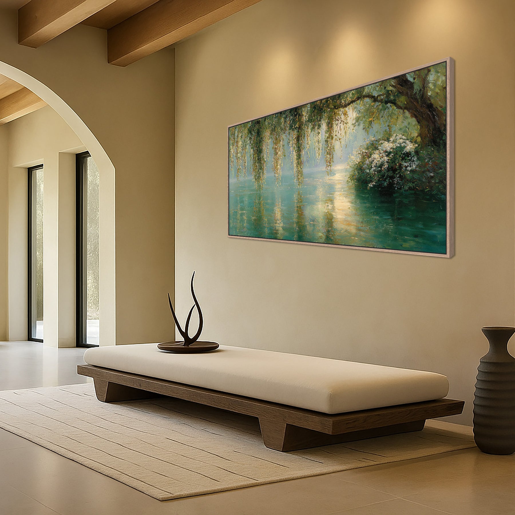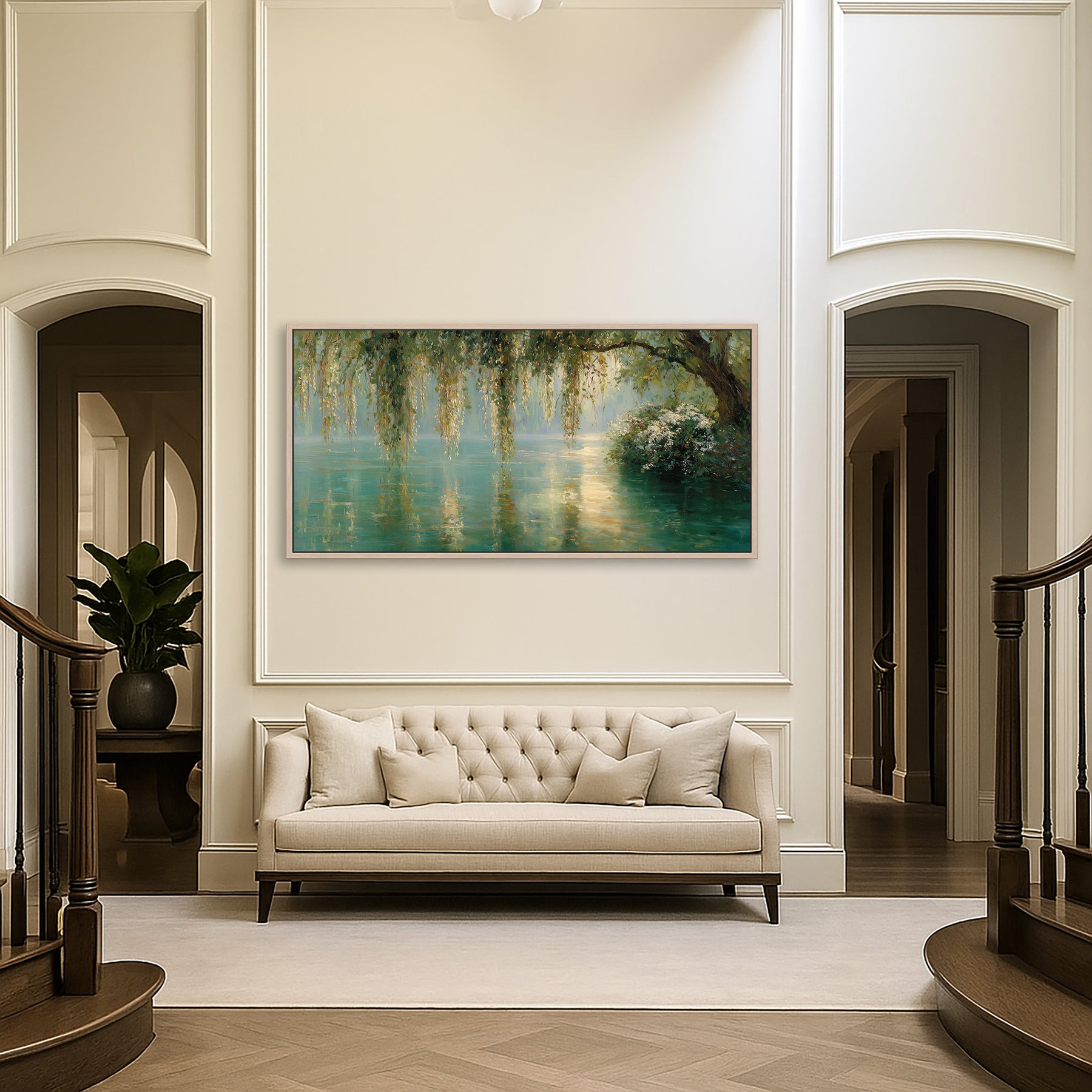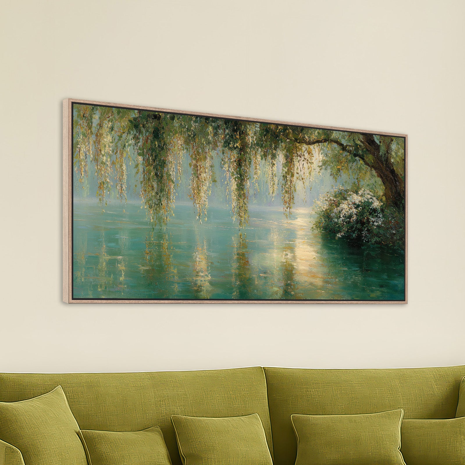 Wide format canvas wall art print featuring a weeping willow tree with branches cascading over turquoise waters. This peaceful botanical lake scene is rendered with soft green and teal tones. This beautiful artwork creates a calming focal point with its impressionistic style and reflective water composition. Perfect for living rooms, bedrooms, or meditation spaces. Ideal for lovers of botanical or leafy wall art themes, and green and gold wall decor.