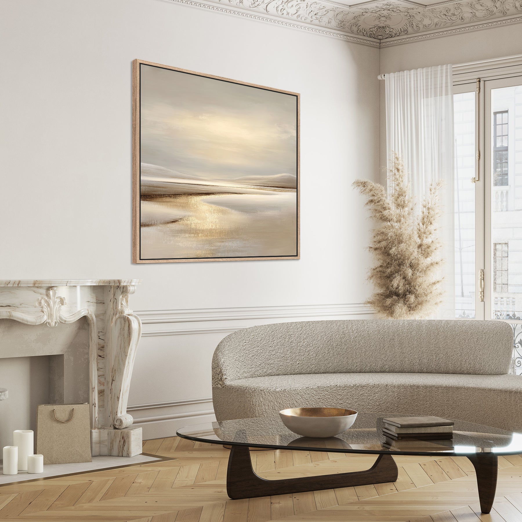 Large canvas wall art featuring an abstract coastal scene with soft neutral tones. This minimalist landscape depicts a serene shoreline with sand dunes, flowing water channels, in cream, gold, and brown against a pale sky. Perfect for living spaces and bedrooms, this contemporary canvas creates a calming focal point with its earthy palette and peaceful composition. Ideal for lovers of abstract water landscapes or Zen inspired meditation wall decor themes.