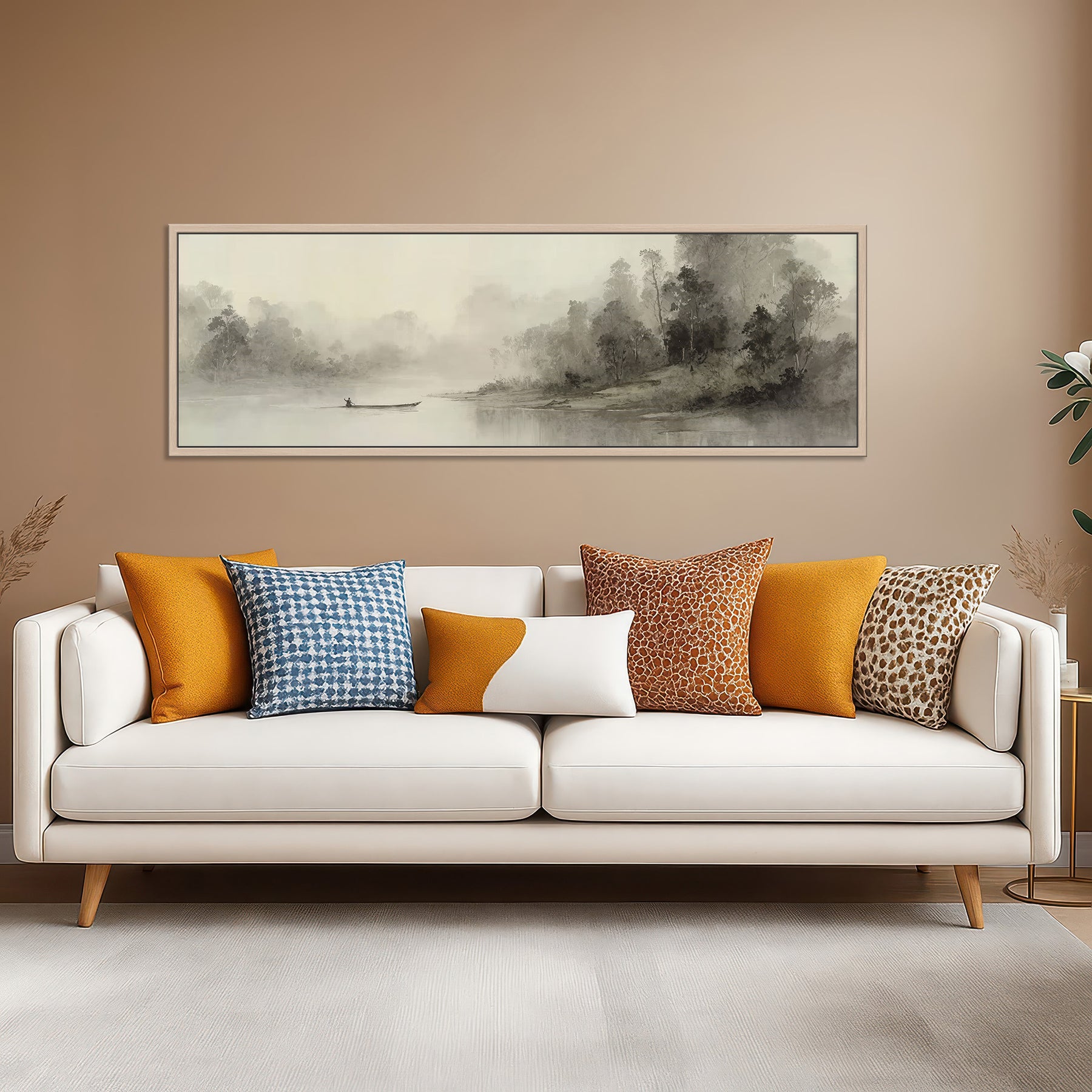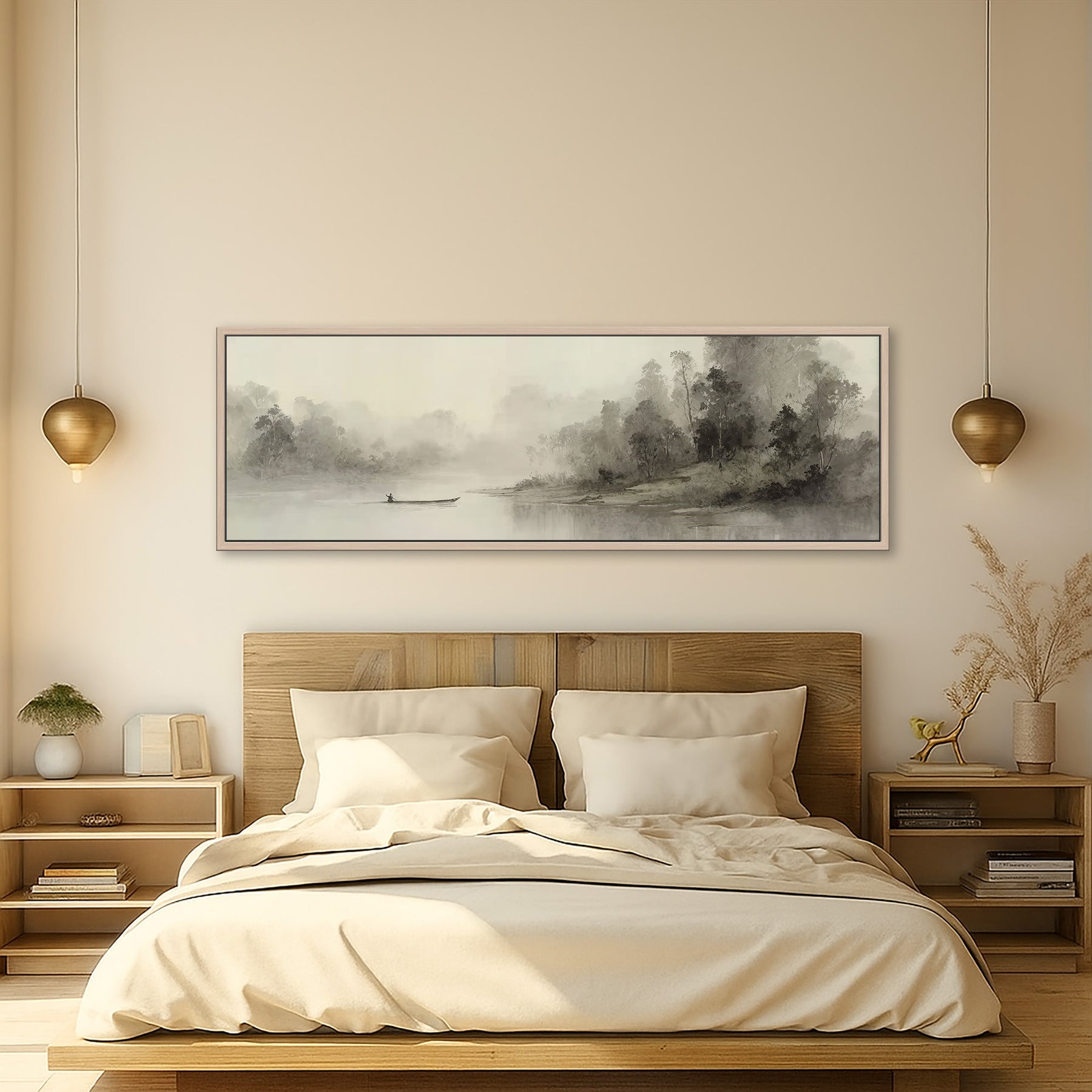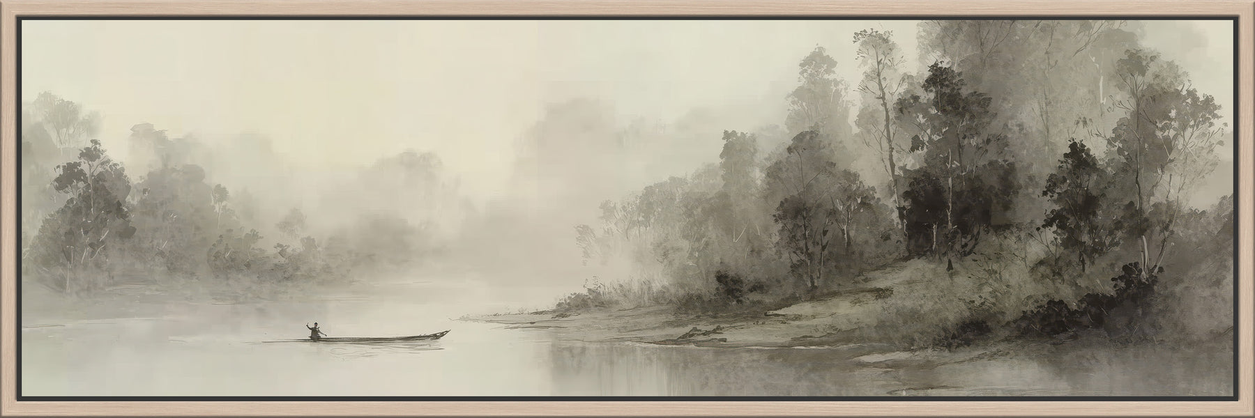 Extra wide canvas wall art featuring a  panoramic misty river scene with a solitary figure in a canoe gliding across calm waters, surrounded by trees along the shoreline in soft sepia and gray tones. This water landscape canvas art creates a peaceful focal point with its atmospheric watercolor style. Perfect for living rooms, bedrooms, or meditation spaces. Ideal for lovers of panoramic water landscape themes and neutral monochrome decor.