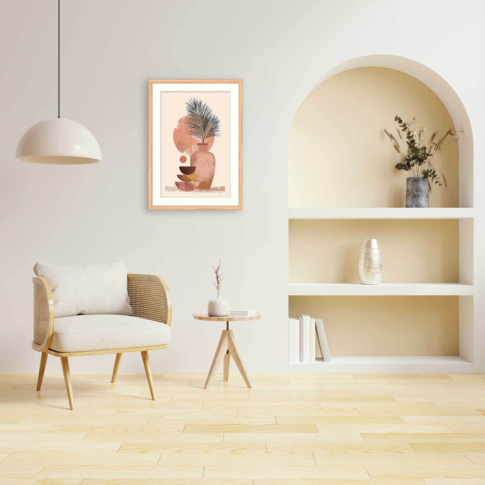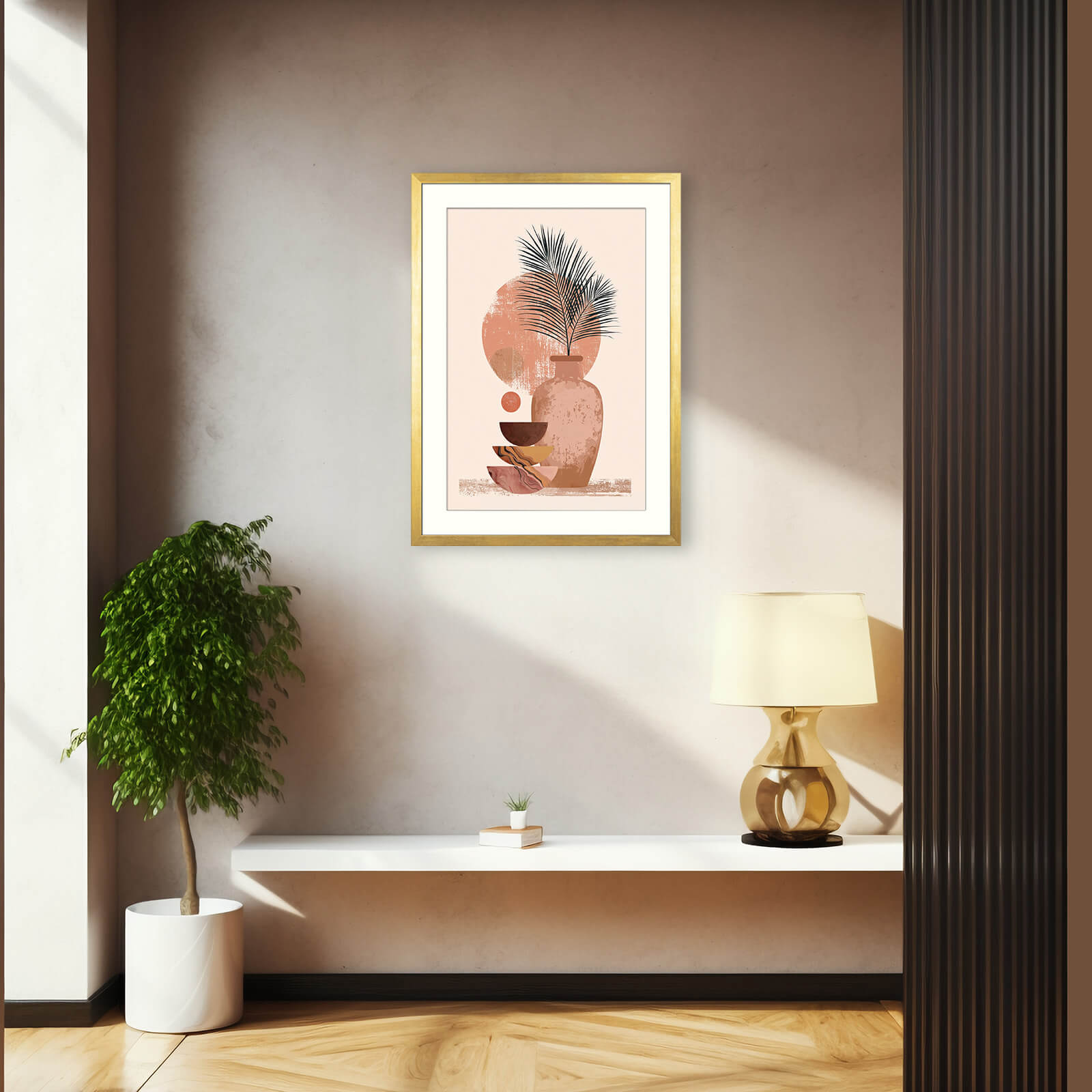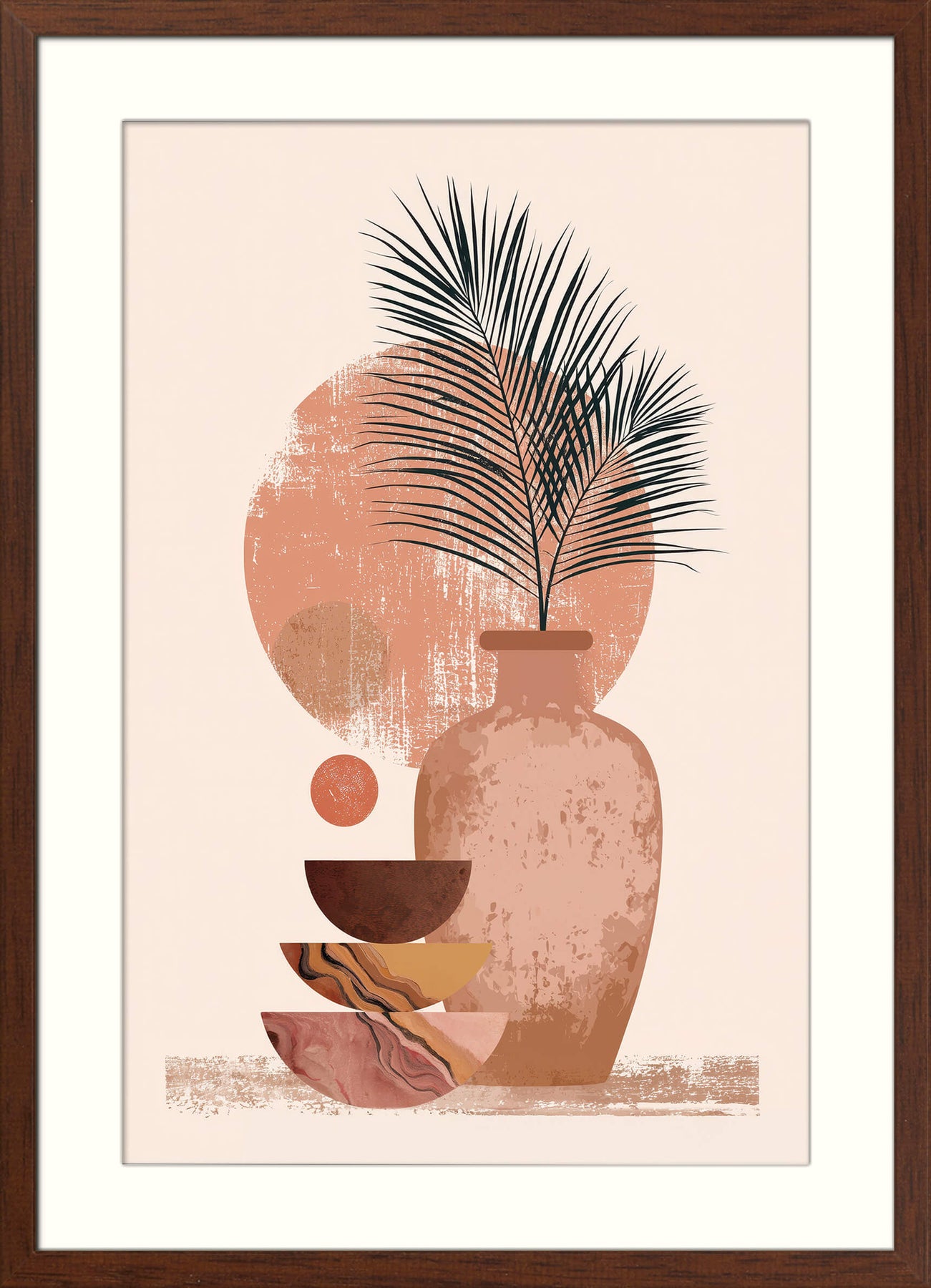 A textured clay vase holds a delicate palm frond, surrounded by softly layered circles and abstract bowls in warm terracotta, sienna, and marbled tones. With its muted palette and natural shapes, this piece blends rustic calm with modern design. It’s a refined Japandi composition with strong Minimalist overtones, perfect for soothing, earthy spaces.
