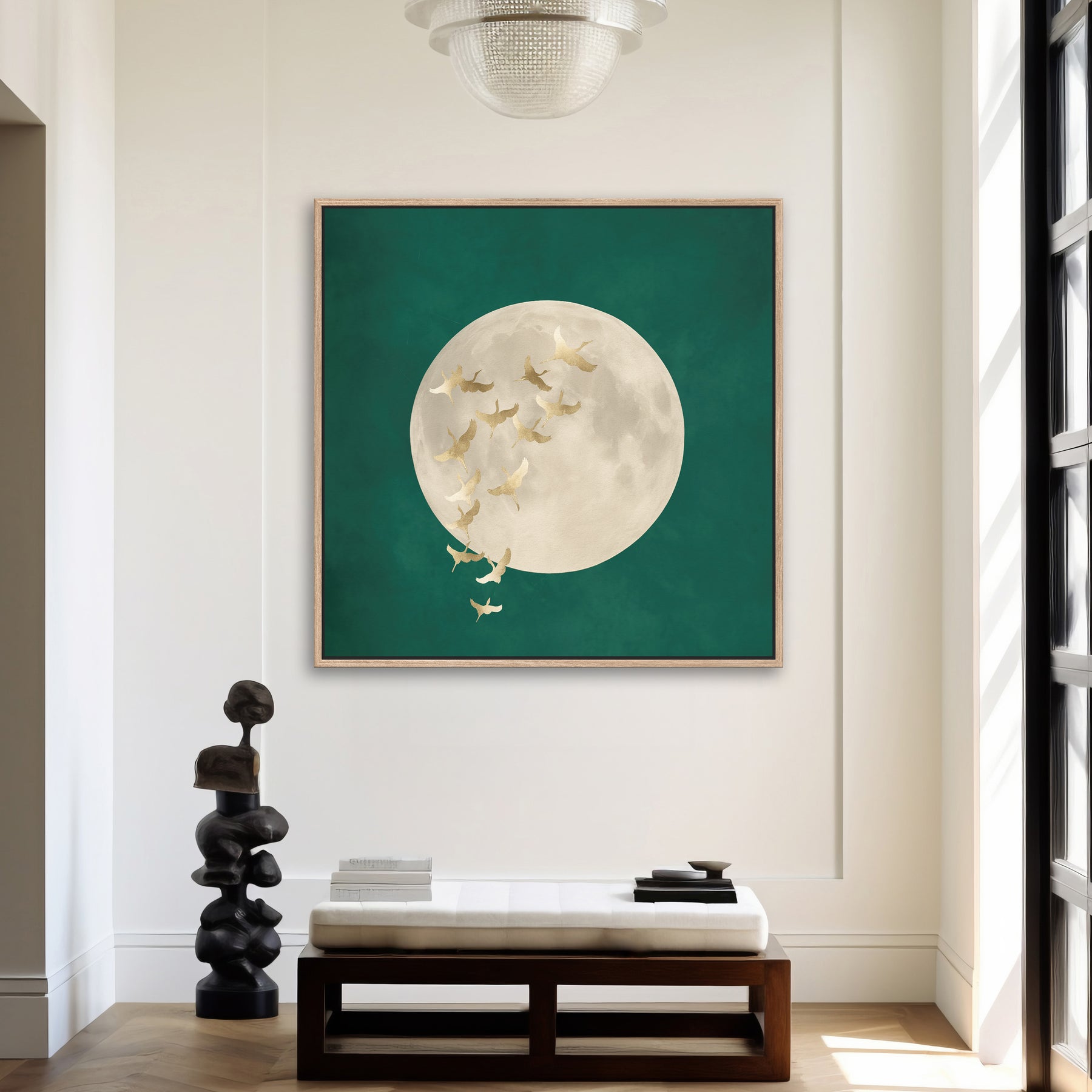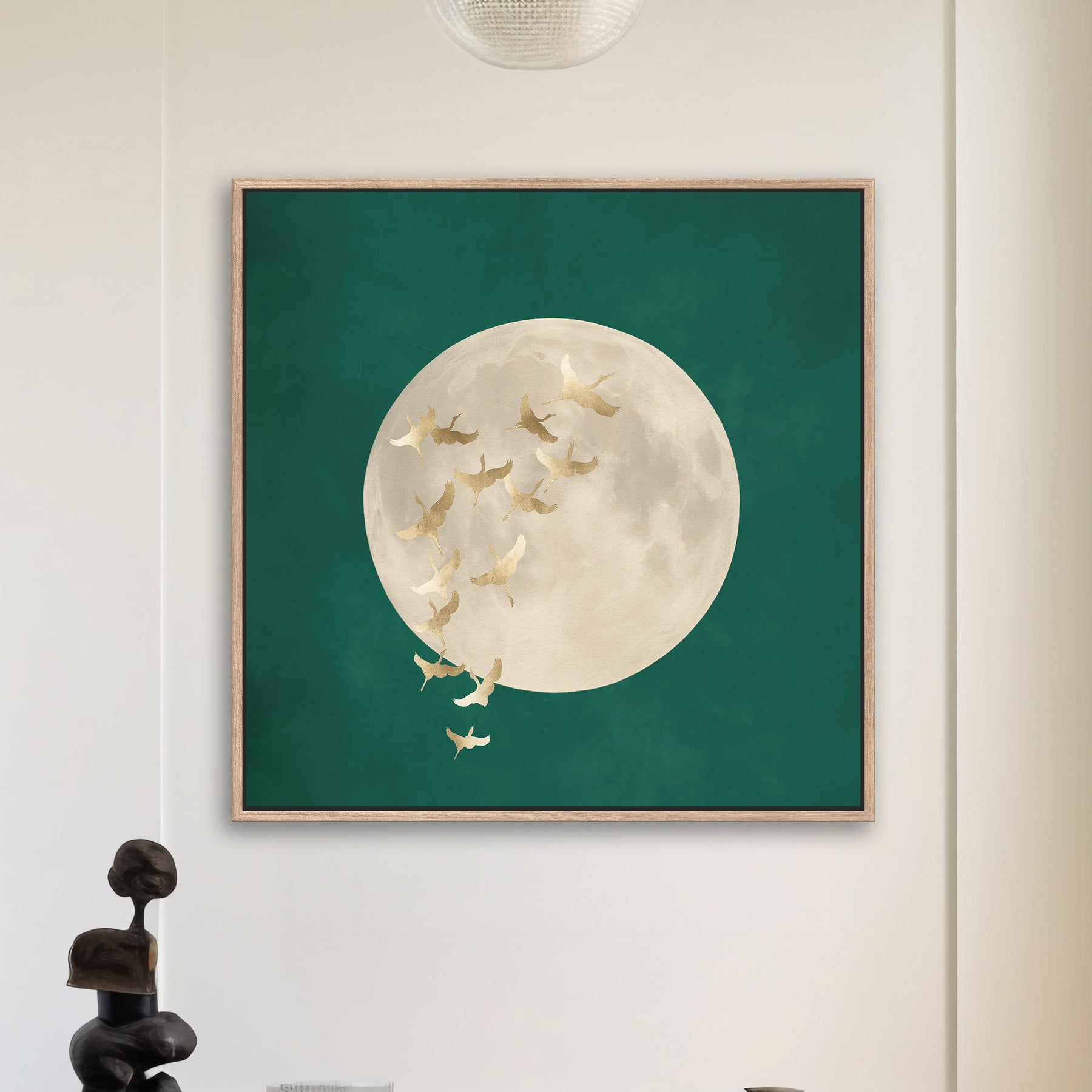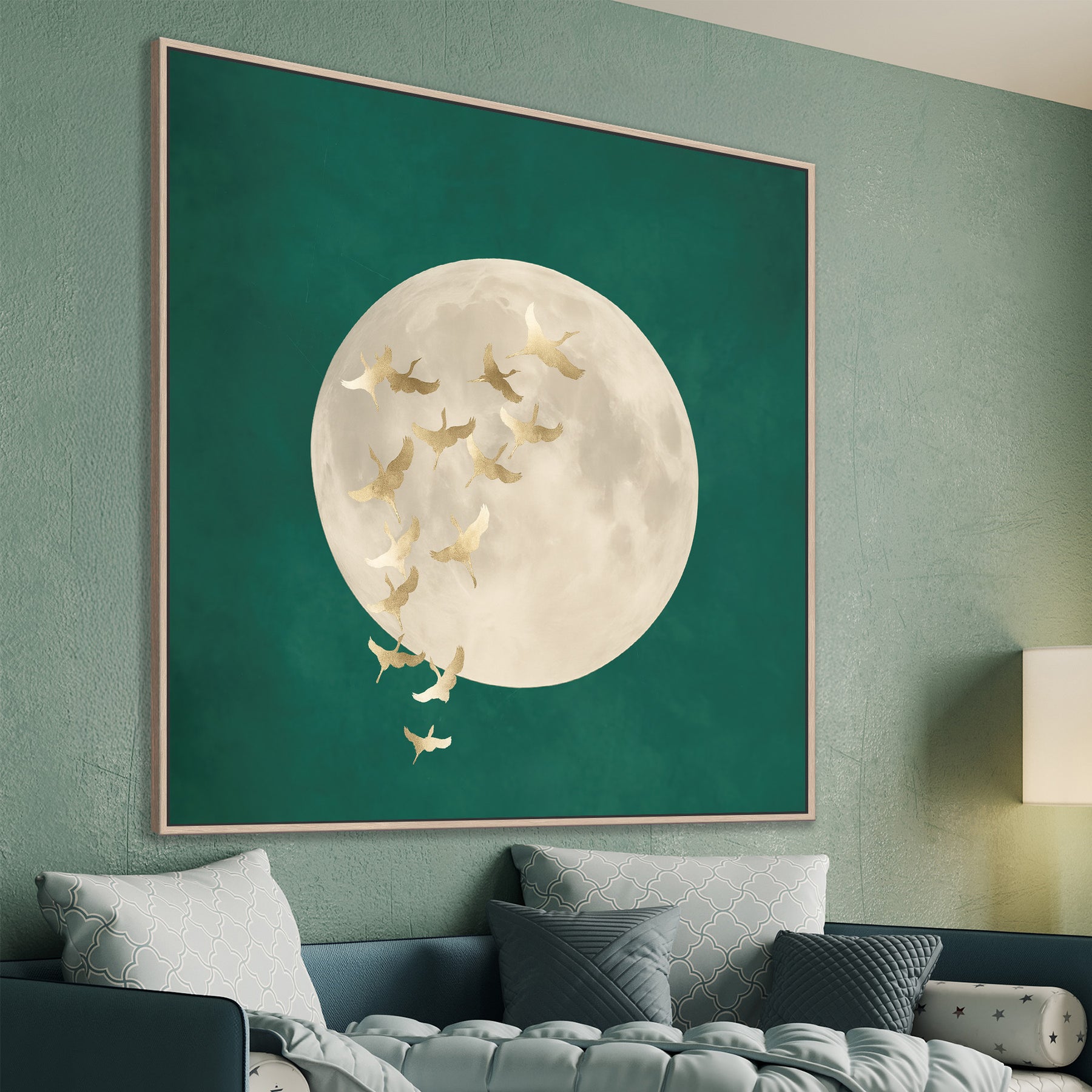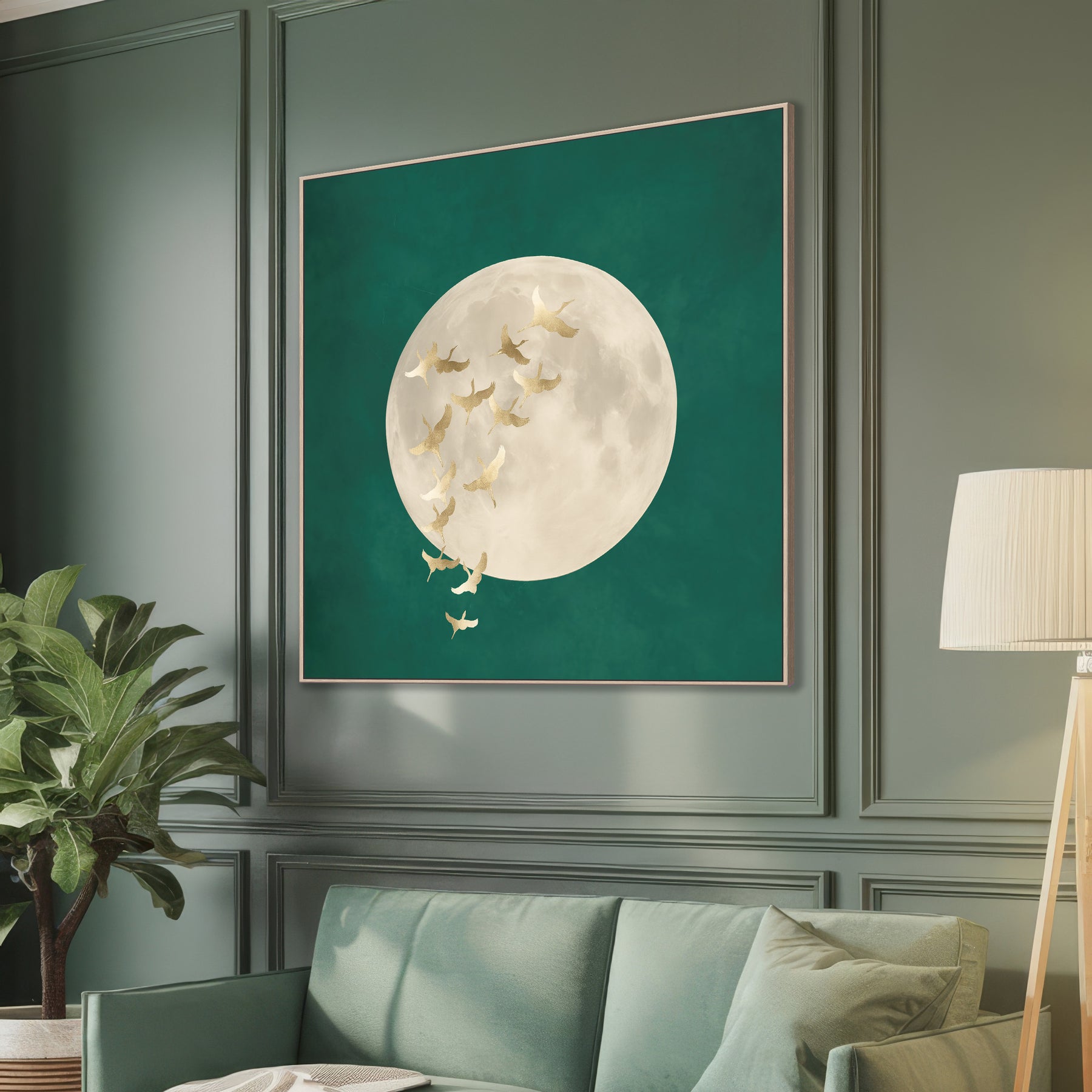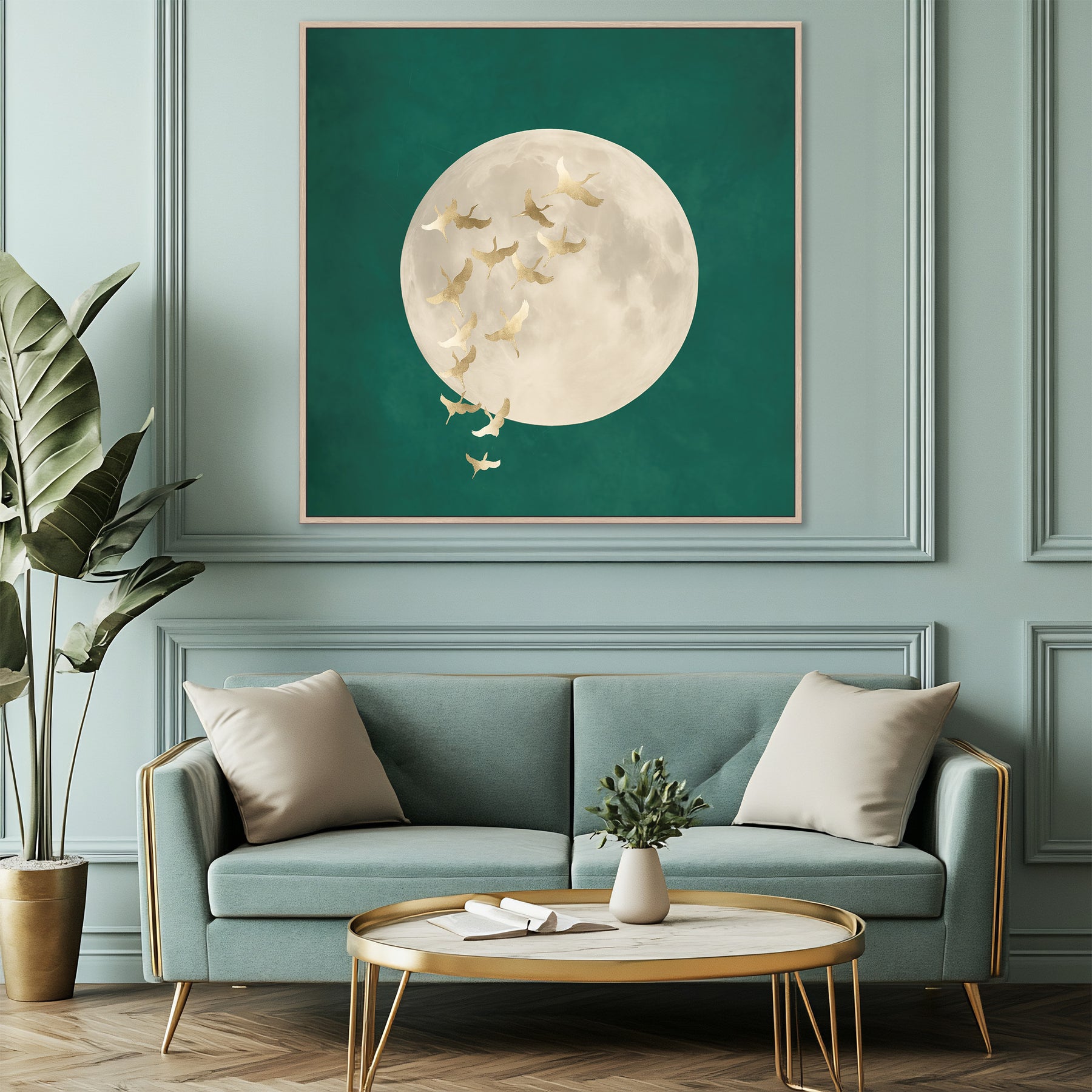 Canvas wall art featuring a large cream-colored moon with gold cranes in flight against a teal green background. This minimalist canvas art shows silhouettes of birds with gold accents flying across the lunar landscape. A simple composition combining nature imagery with a modern color palette of teal, cream, and gold, into a Japandi wall art feel. Perfect for bedrooms, living rooms, or office spaces. Ideal for lovers of sun and moon art, bird canvas art themes, and teal wall art decor.