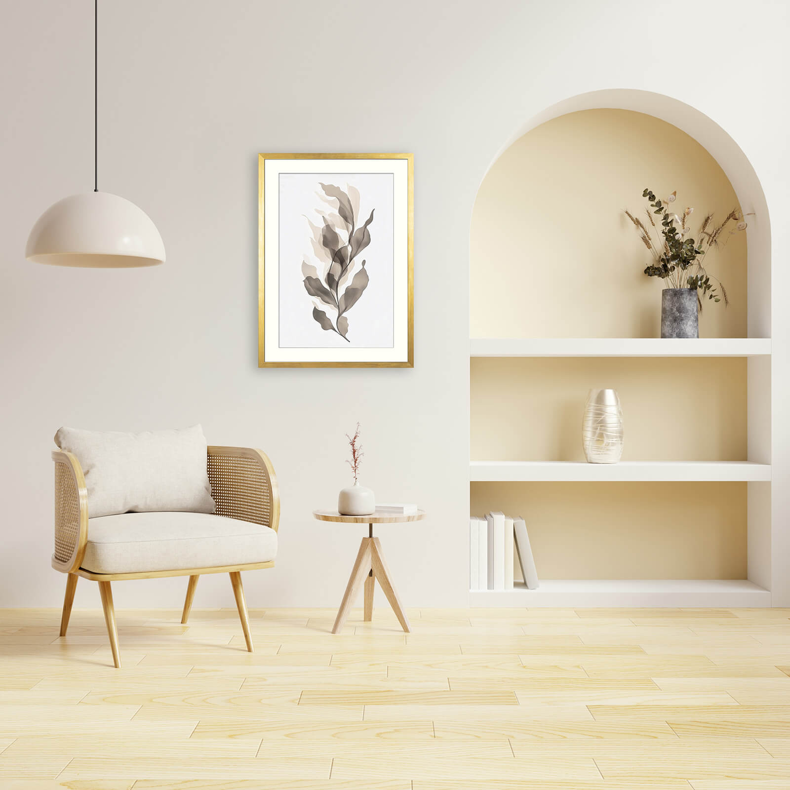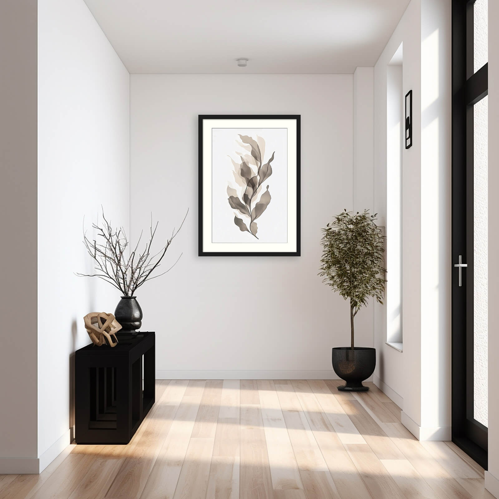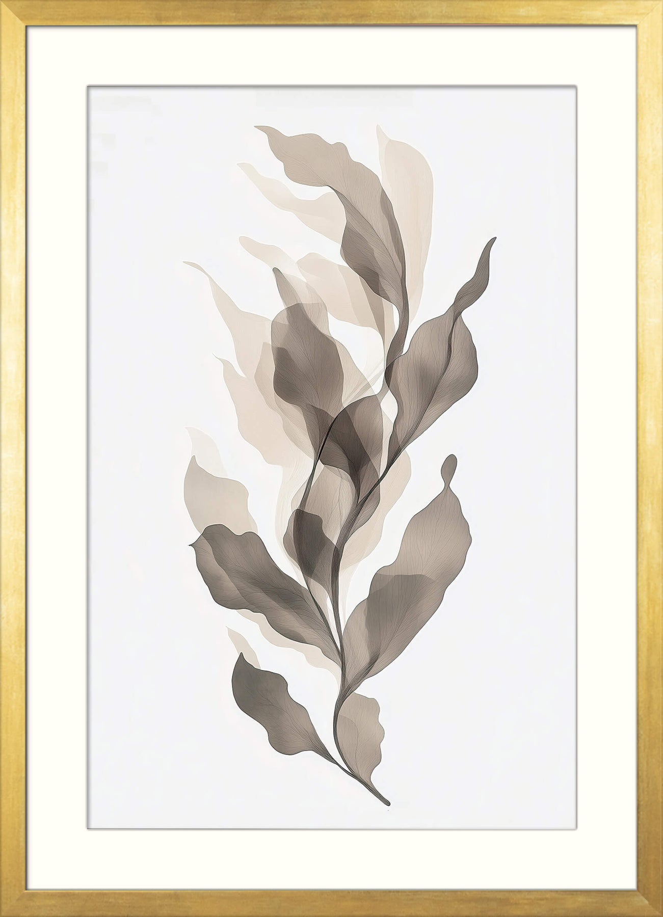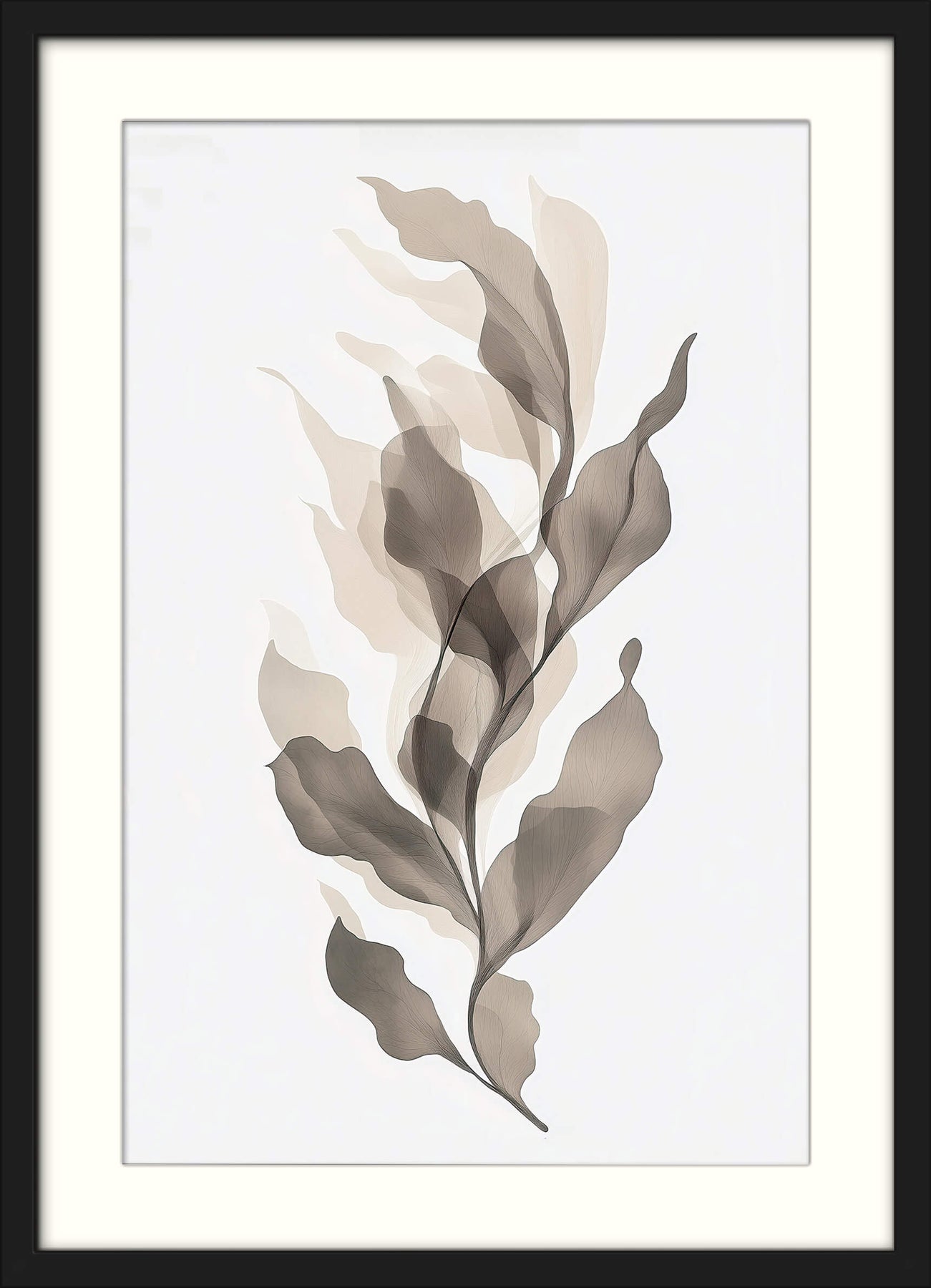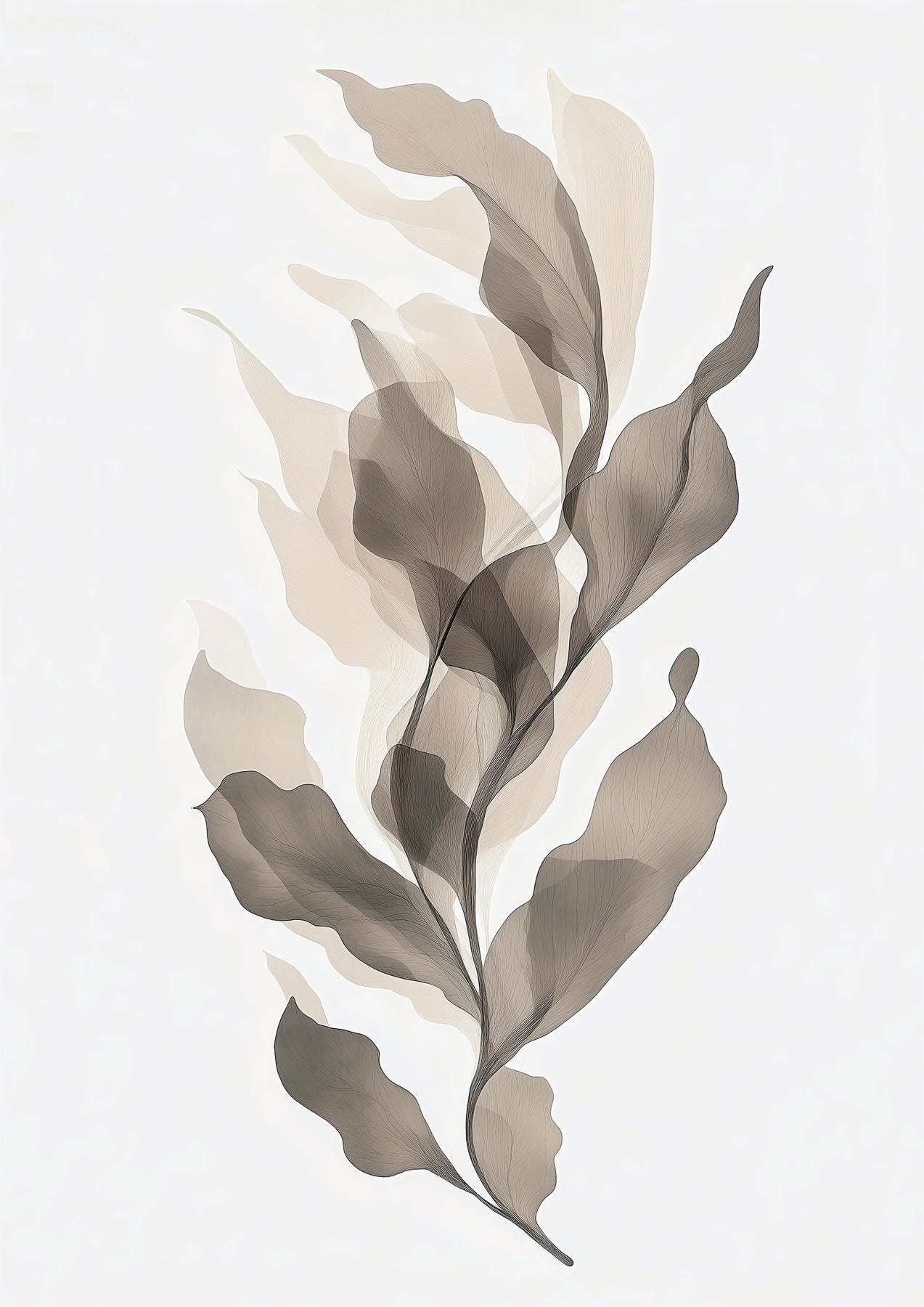This minimalist botanical print features a soft, layered composition of translucent leaves in calming neutral tones. Inspired by Japanese design principles, the artwork blends organic forms with gentle movement, creating a serene focal point for modern interiors. The muted palette and delicate detailing make it a perfect fit for Japandi, wabi-sabi, or Scandinavian-inspired spaces. Ideal for living rooms, bedrooms, or meditation areas seeking a peaceful, natural vibe.