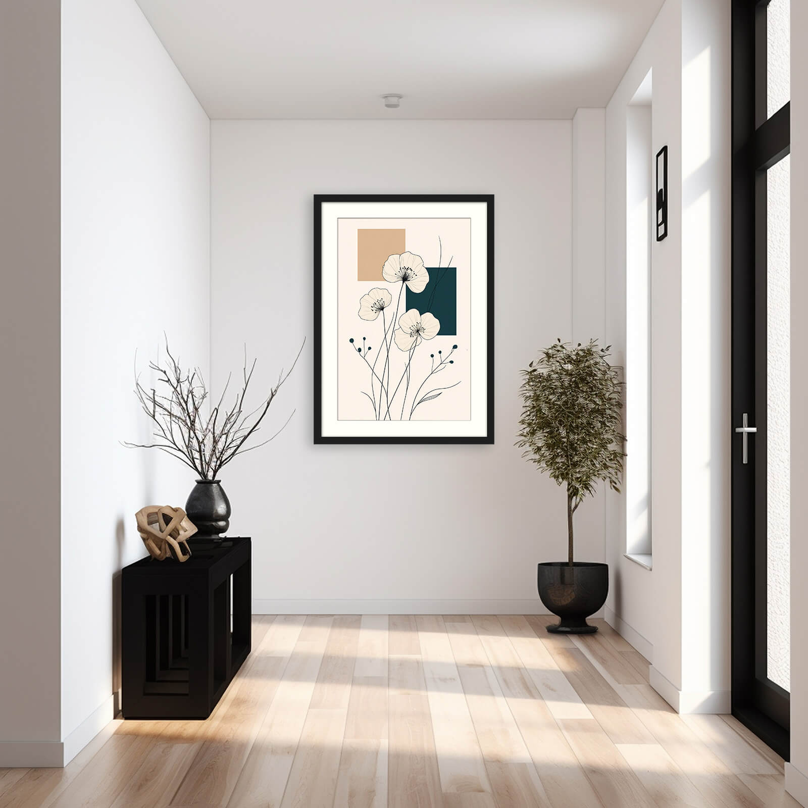 This minimalist floral line art print features delicate Japanese-inspired flowers drawn in fine black ink lines against a soft, neutral background. Simple geometric blocks in deep teal and warm beige add balance and structure, giving this piece a Japandi botanical wall art feel — calm, intentional, and beautifully clean.
