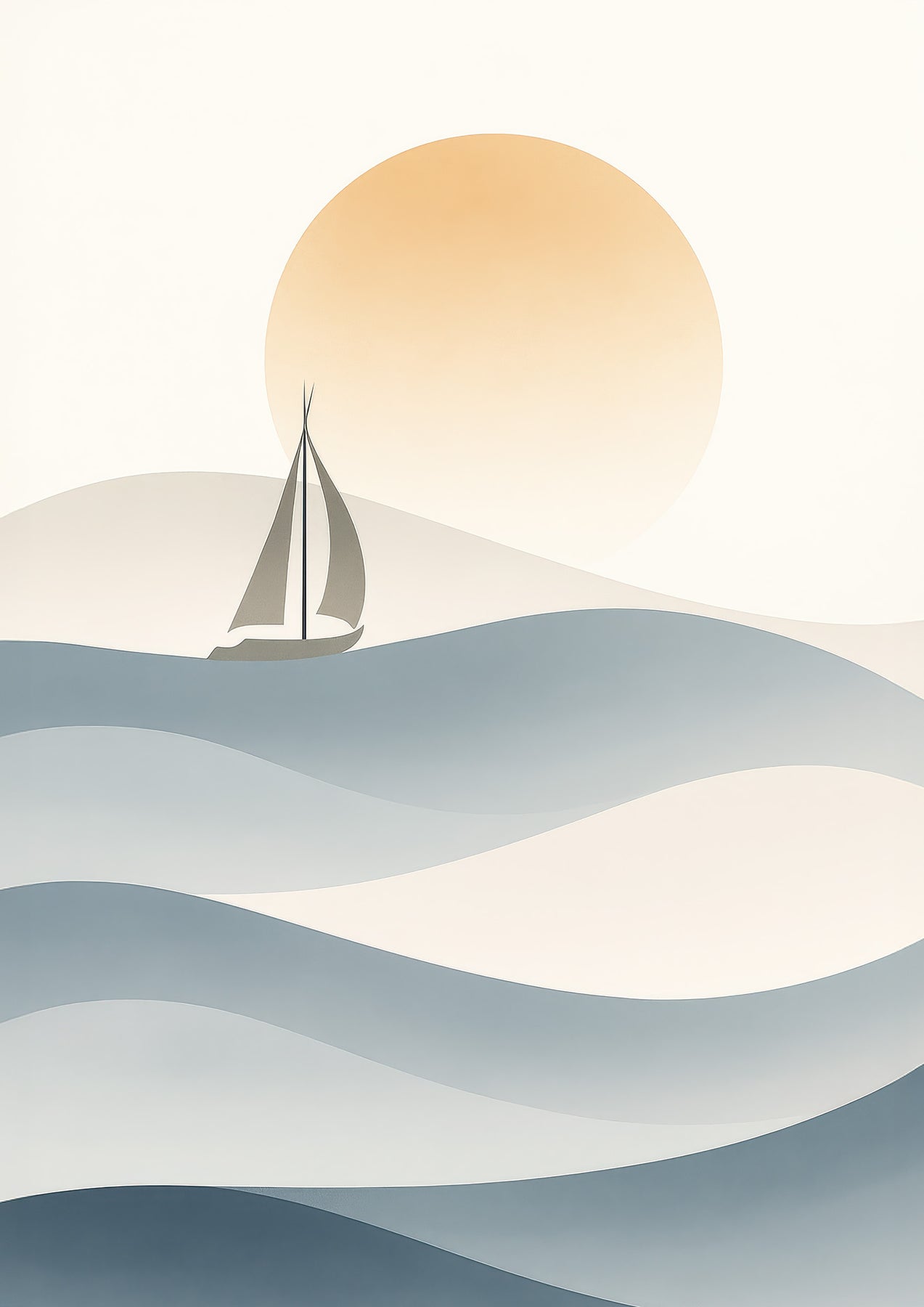 Minimalist sailboat wall art featuring a lone sailboat gliding across layered ocean waves beneath a muted sun. This ocean waves print offers calm, clean lines and simple colours that bring a peaceful marine feel to any space. The coastal decor poster aesthetic shines through in the soft curves and serene horizon.