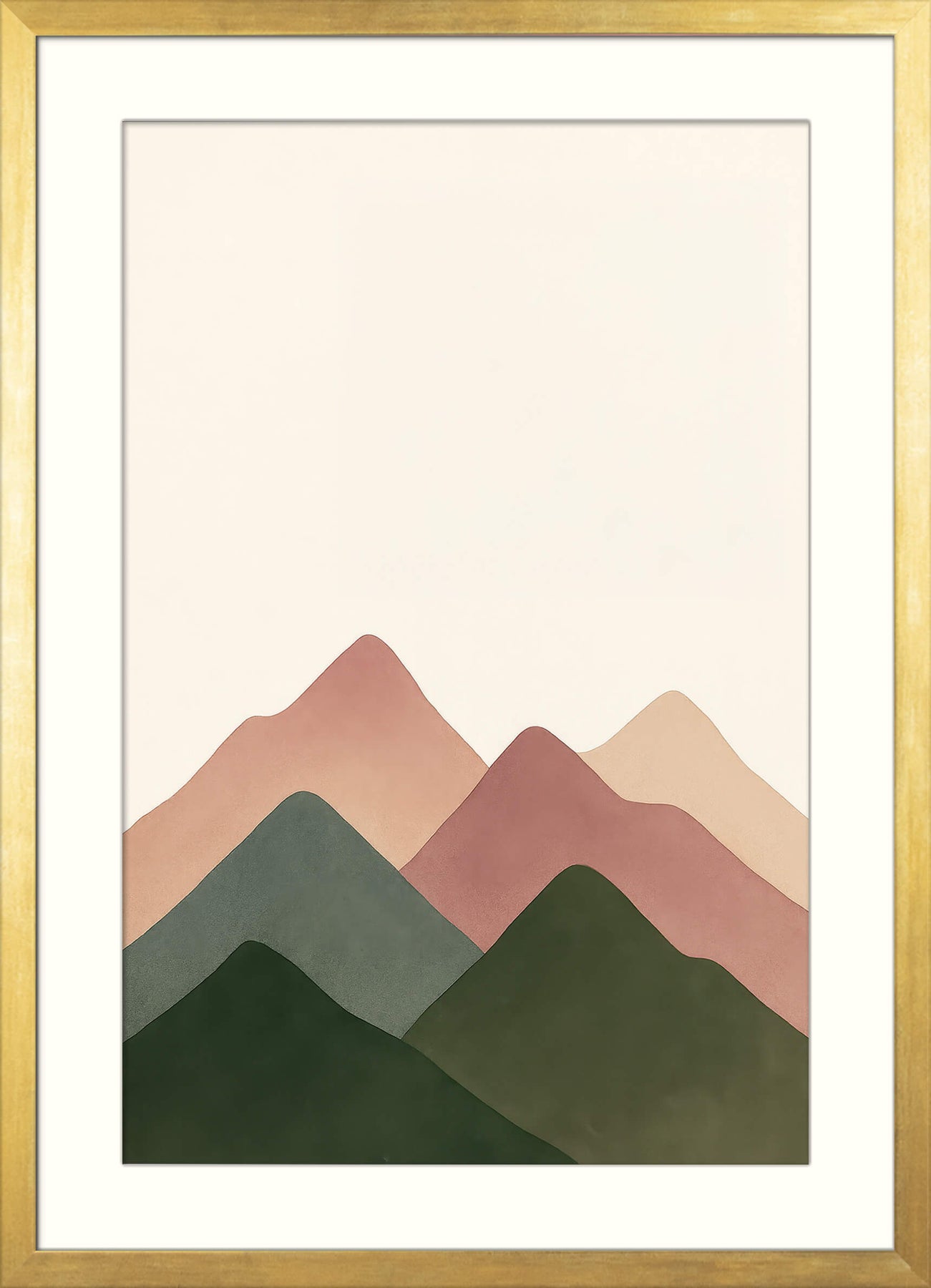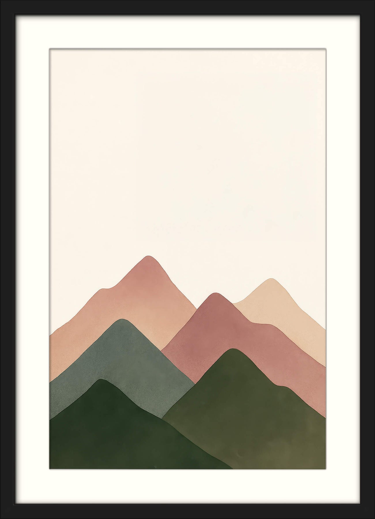 Minimalist mountain wall art presenting soft, layered hills in muted earthy and pastel tones. This mountain landscape print delivers a calm, serene feel that complements neutral décor. The neutral mountain decor styling makes it ideal for spaces seeking nature-inspired simplicity.