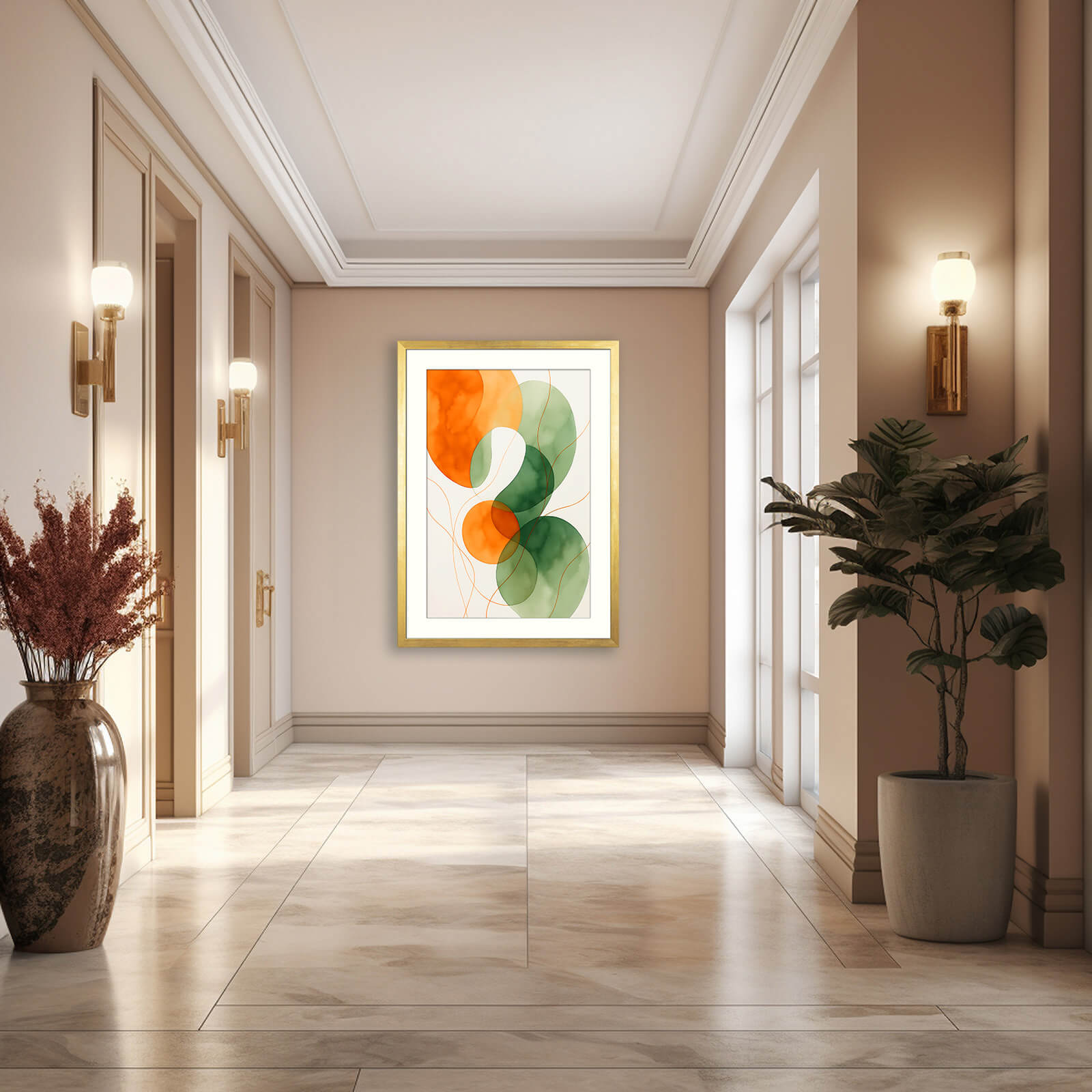 This modern abstract wall art features overlapping geometric circles in rich shades of green and orange, painted with soft watercolor textures and accented by elegant flowing lines. The balance of shape, transparency, and movement gives this piece a refined, minimalist aesthetic.