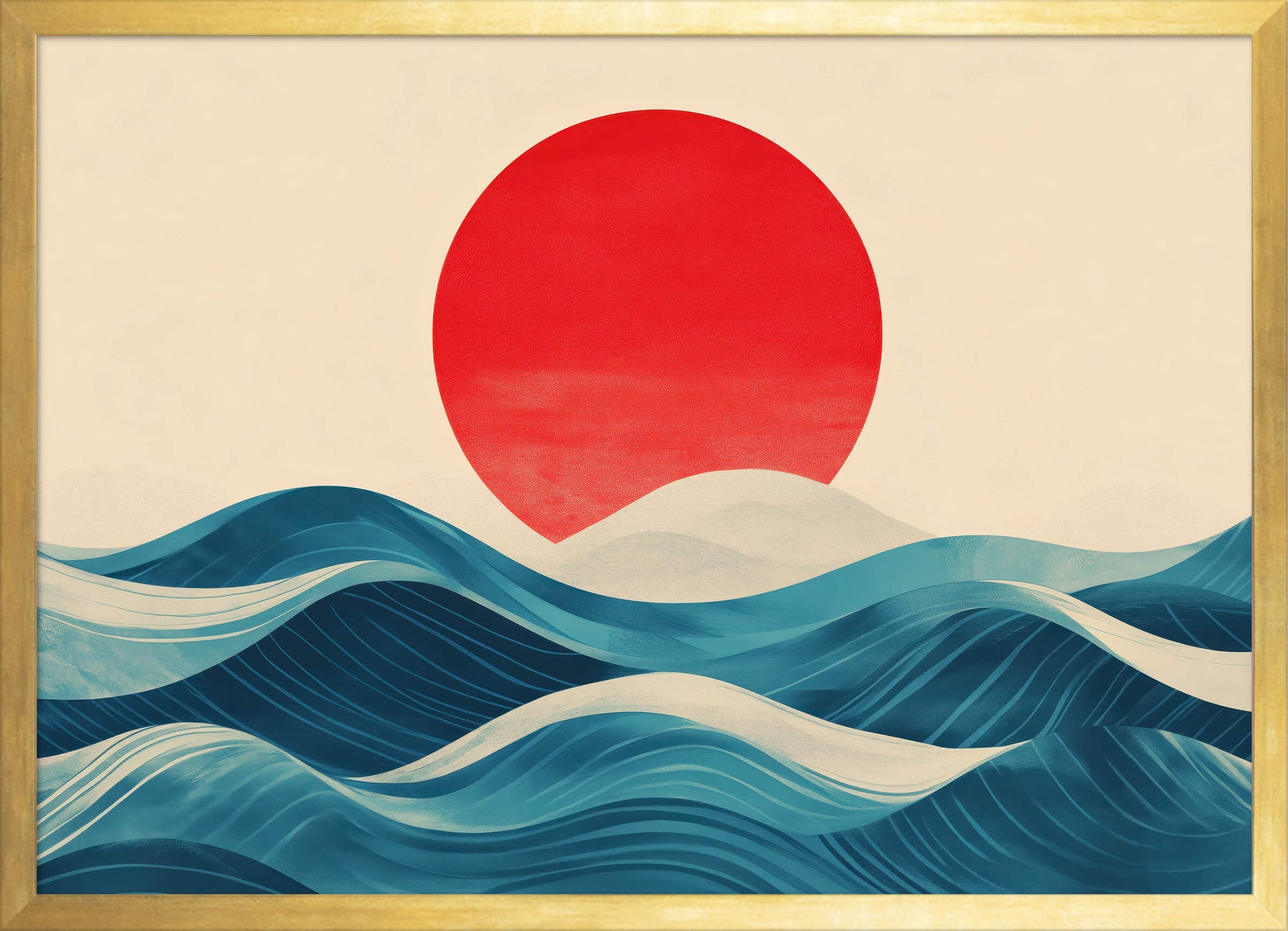 This bold Japanese inspired wall art print features a striking red sun rising above stylized, flowing blue waves. The composition balances simplicity with movement, evoking calm power and timeless design. Inspired by the minimalist elegance of the Rinpa decorative style, this artwork brings a serene, graphic touch to any interior.