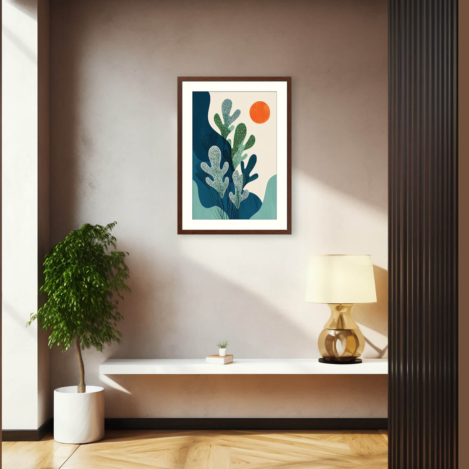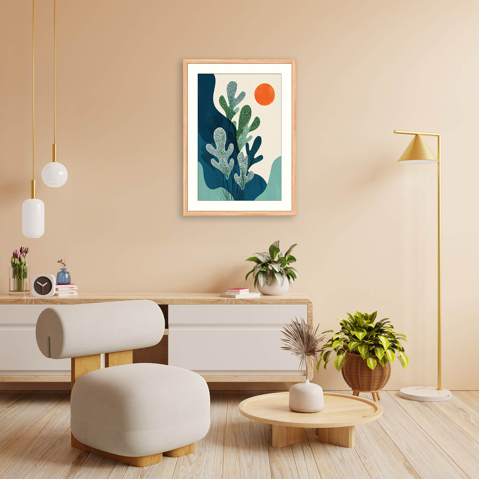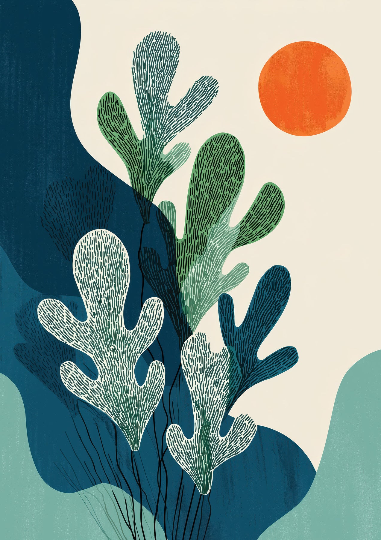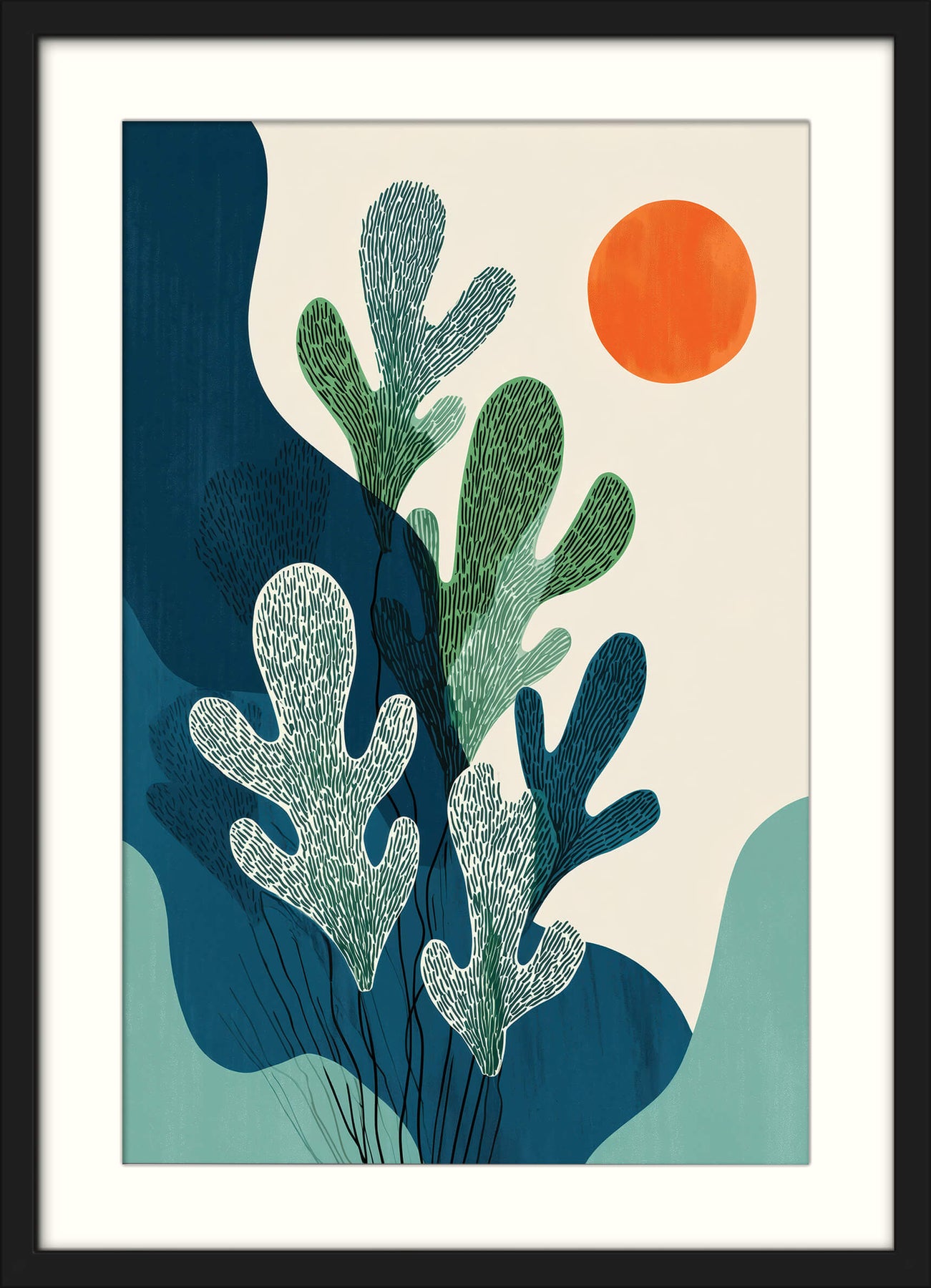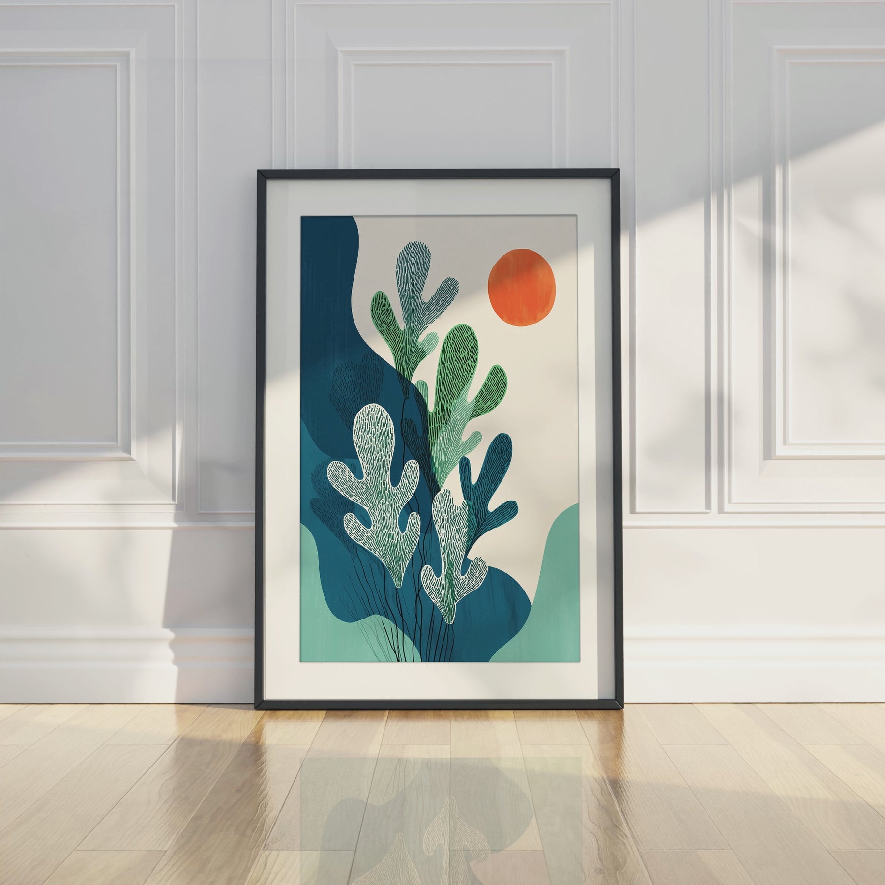 Organic leaf forms rise in deep shades of green, navy, and white against soft, undulating shapes and a warm orange sun. The composition is bold yet calming, with hand-drawn texture lines adding an earthy, tactile quality. This modern Abstract print channels a Japanese-inspired simplicity while embracing the grounded naturalism of Japandy style.