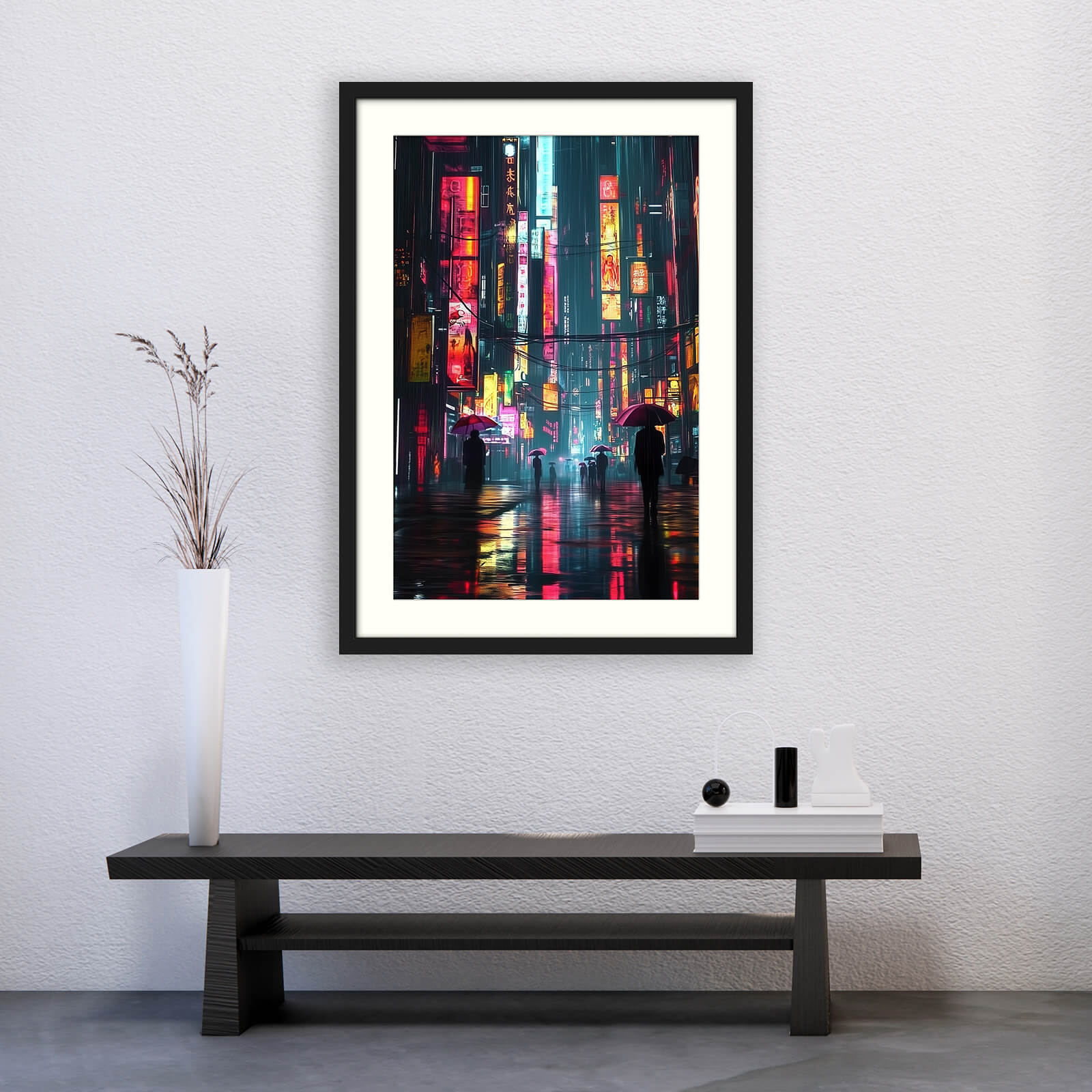 This bold and cinematic cyberpunk wall art depicts a glowing neon Japanese street scene, where silhouettes holding umbrellas walk through rain-soaked alleys lit by towering electric signs. The atmospheric lighting, rich reflections, and moody vibe evoke a futuristic Neo Tokyo.