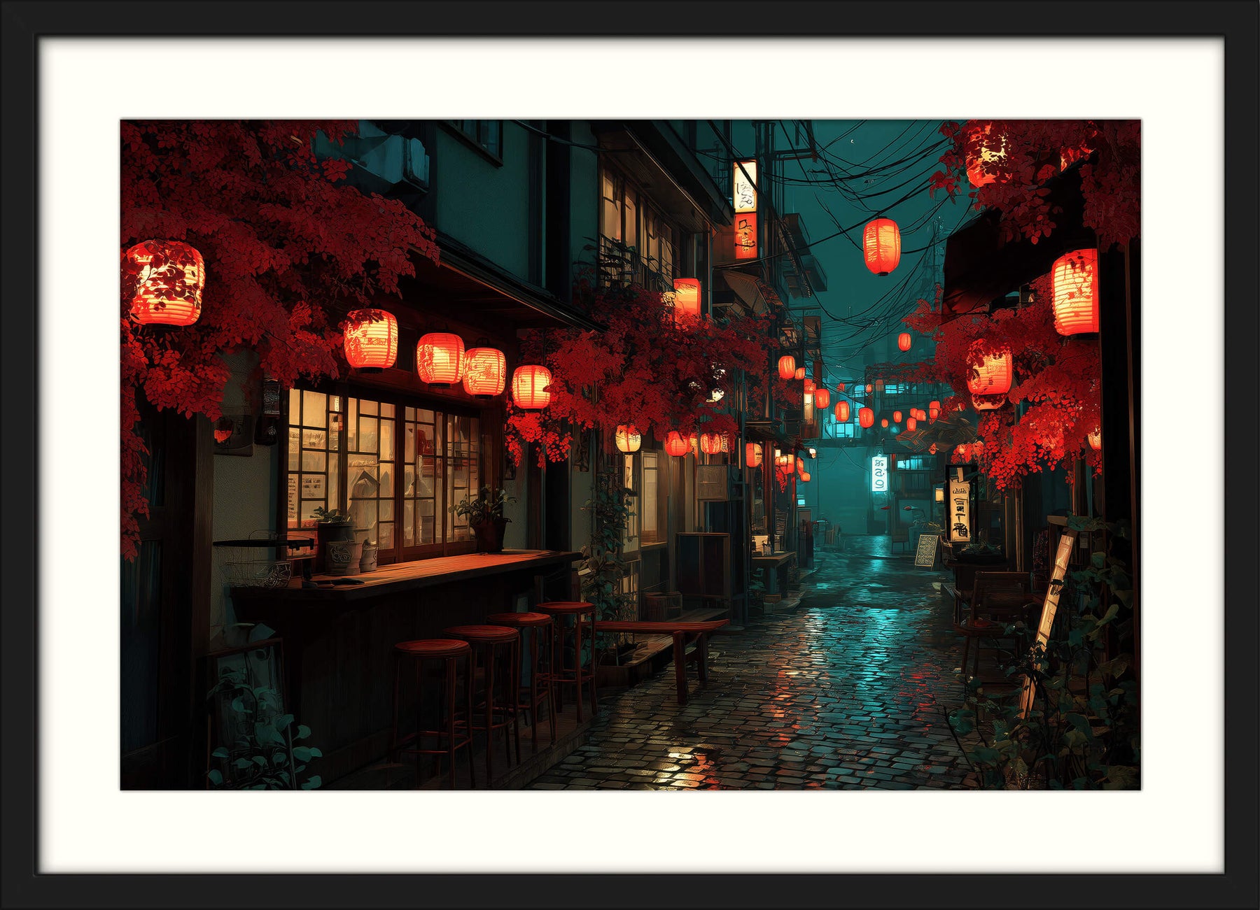Japanese lantern street wall art captures the glow of hanging lanterns and narrow alleyways in a moody night scene. This Japan street scene print emphasizes reflections, warm light, and urban textures to immerse the viewer in atmospheric elegance.