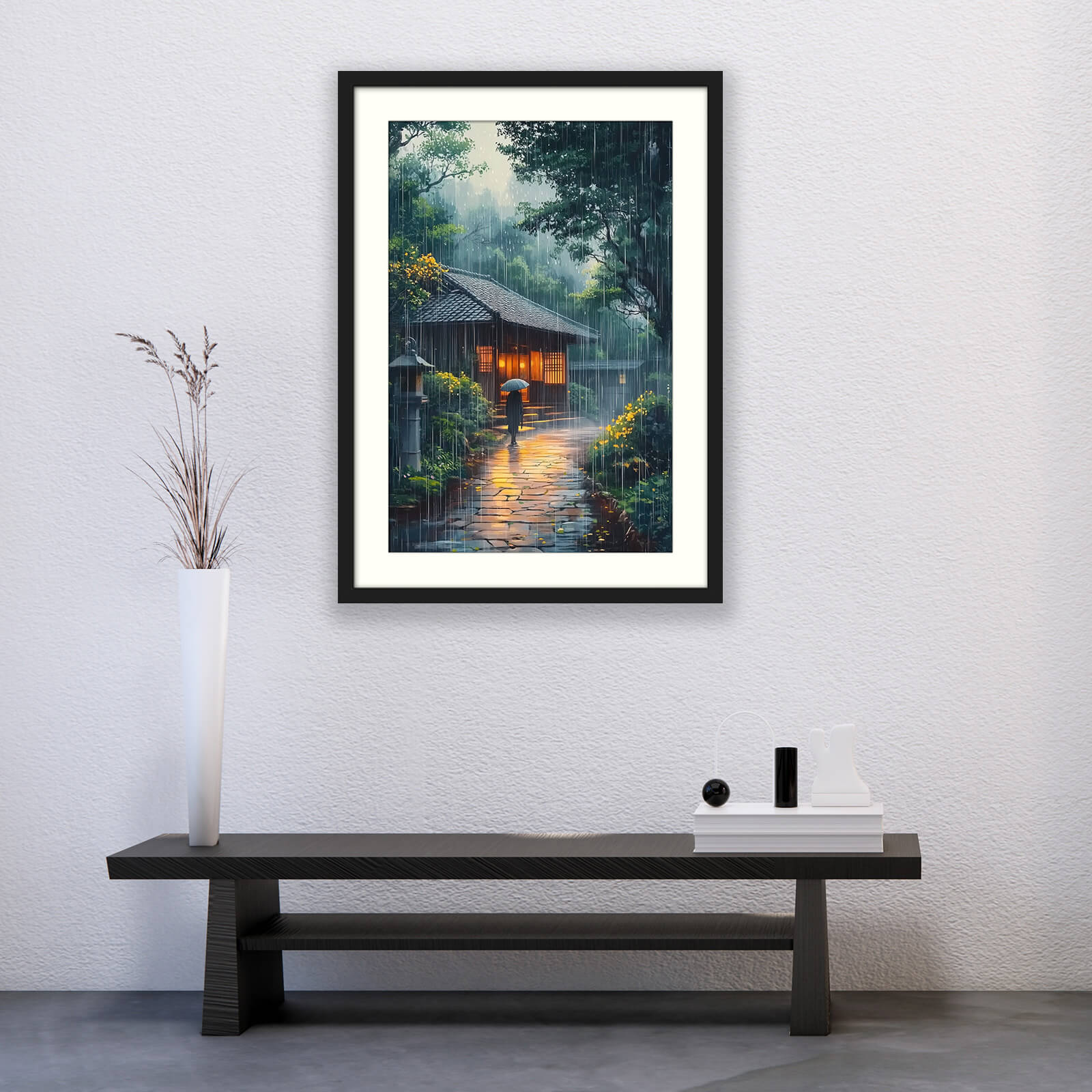 Japanese rain wall art depicting a glowing house set on a wet stone path, with rain softly falling through dark trees and warm light shining from windows. This rainy path print evokes a peaceful contrast of light and shadow, combining moodiness with the calm comfort of shelter. The image highlights lush foliage, reflective surfaces, and a traditional house that anchors the scene. Ideal for living rooms, hallways, or reading nooks where atmosphere matters. Fits beautifully with Ukiyo (woodblock), Stylised & Illustrative, or Japandi interiors.