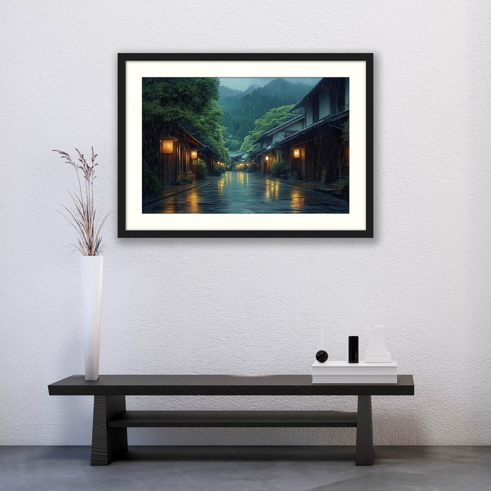 This Japanese rainy night wall art captures a quiet street scene under gentle rainfall: wooden houses lined up along a wet alley, glowing lanterns illuminating reflections on slick pavement, framed by lush foliage and distant hills. The rainy Japanese scene print conveys mood, tradition, and ambience, offering more than just decoration—it evokes memory and serenity.