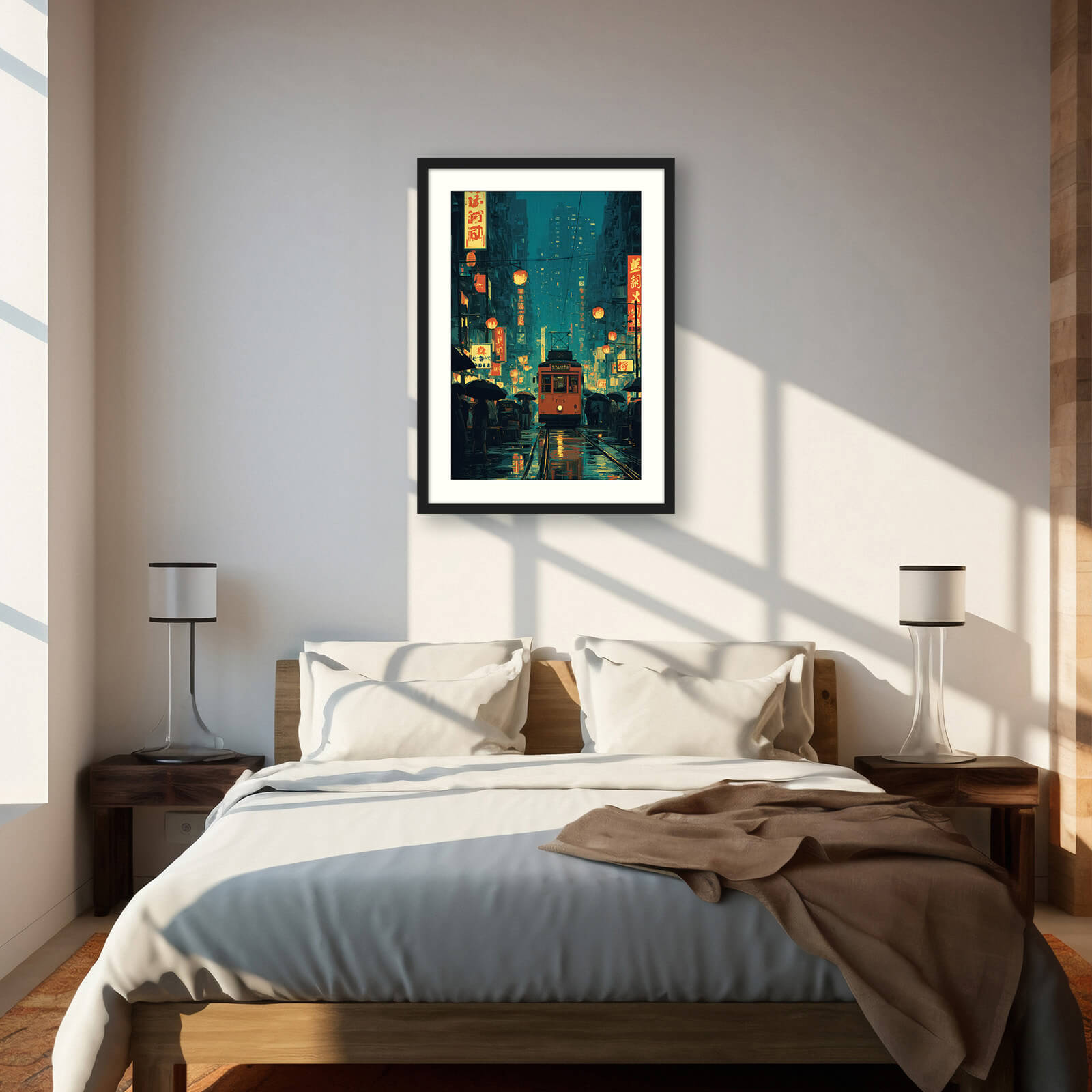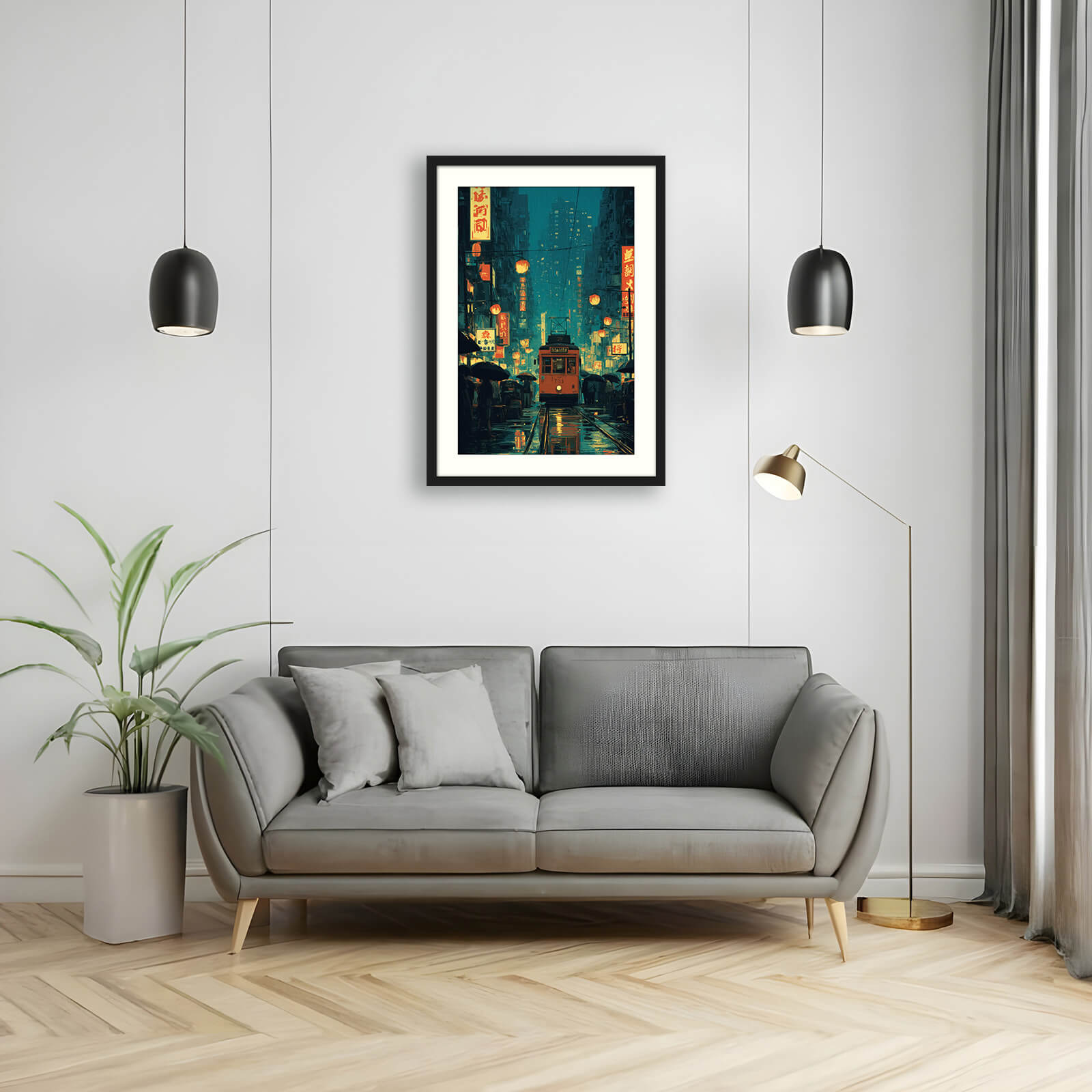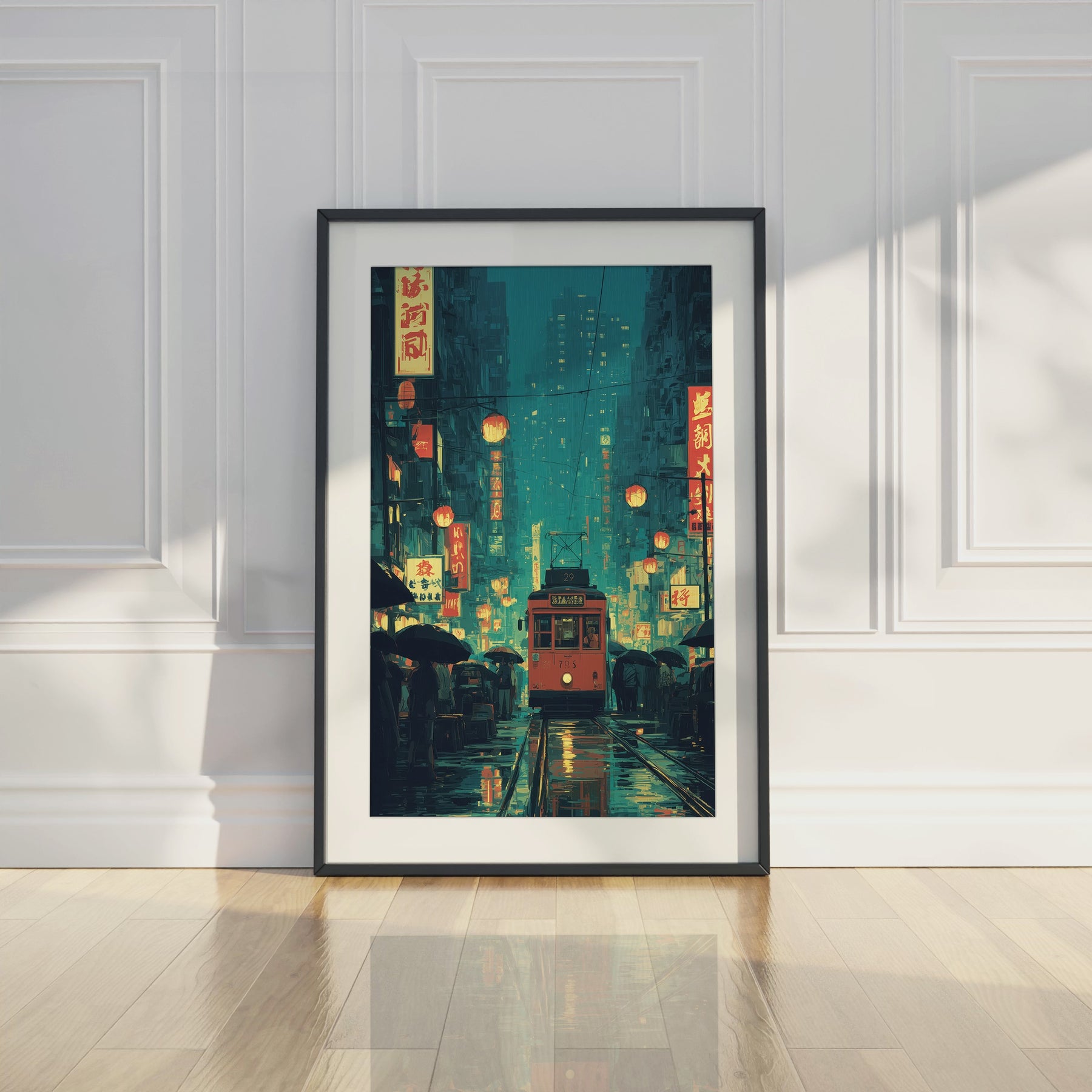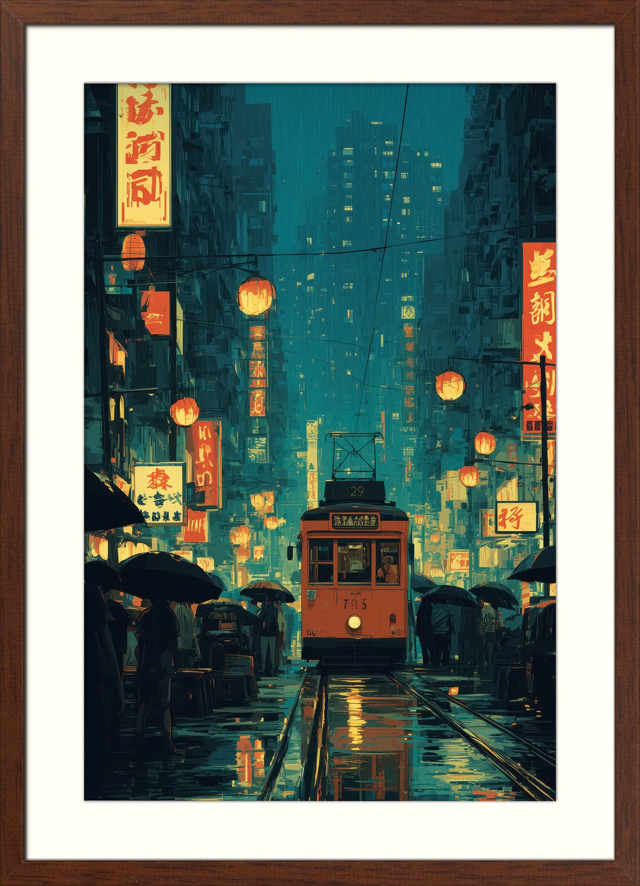 This moody cityscape captures a glowing orange streetcar making its way through a rain-soaked urban street, surrounded by umbrellas, glowing lanterns, and neon-lit signs in Japanese script. The reflection of city lights dances across the wet pavement, adding depth and atmosphere. The artwork blends a stylised illustrative look with cinematic detail, evoking a nostalgic yet futuristic vibe typical of Japanese-inspired street scene art.