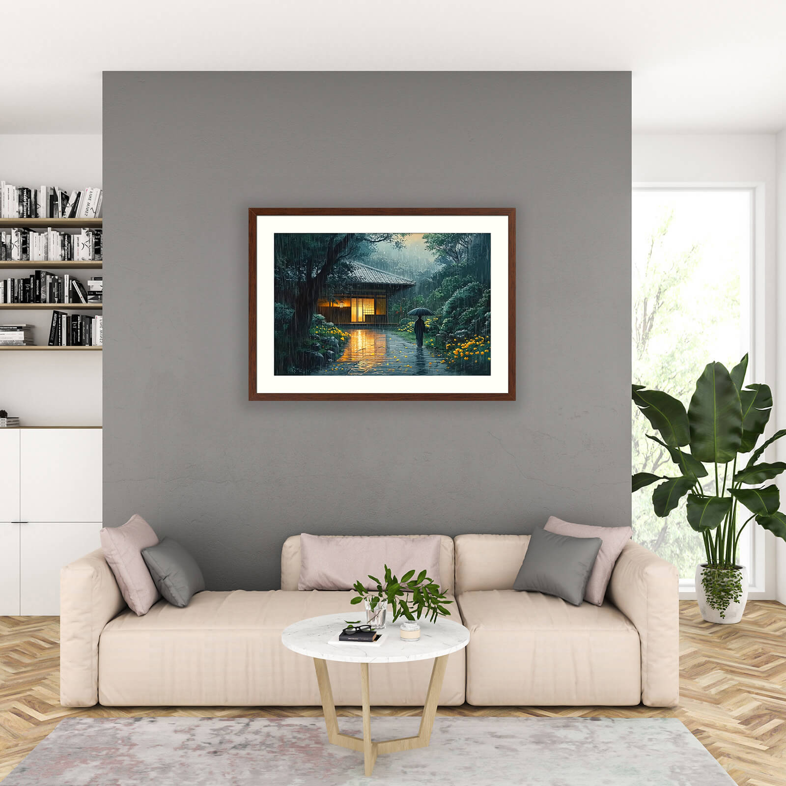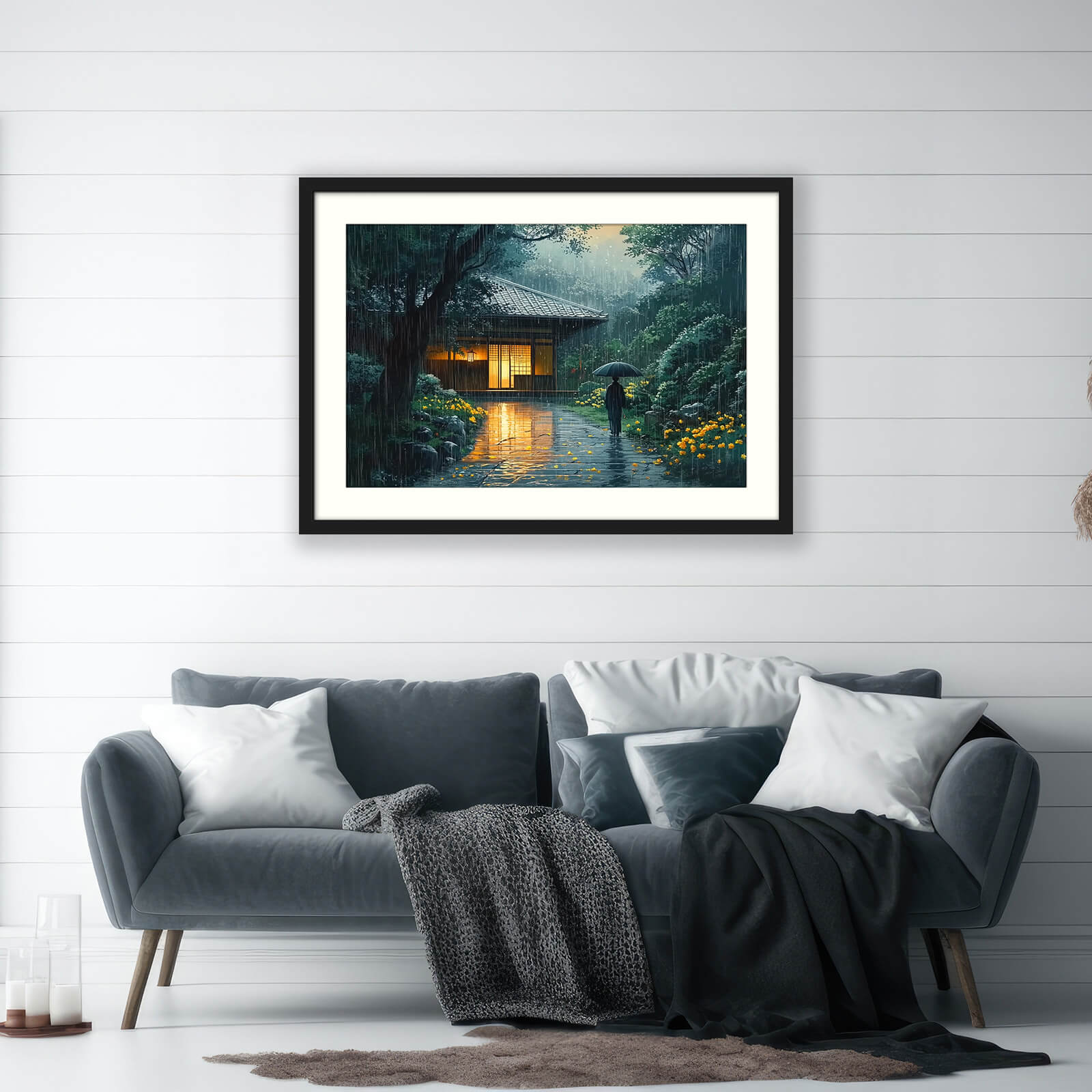 Japanese rain wall art capturing a rainy night Japan art scene, this print shows a solitary figure with umbrella walking along a wet path toward a warmly lit house set in lush greenery. The Japanese landscape print transports you into a quiet moment of nature, architecture, and reflection under soft rainfall. Featuring glowing light windows, reflections on slick stones, and dense foliage around a traditional house, it evokes both serenity and mystery. Perfect for bedrooms, studies or living rooms where a calming focal piece is desired. Works well as a statement in Zen, Japandi, or minimalist environments, or paired with natural wood and neutral tones to enhance its warmth.