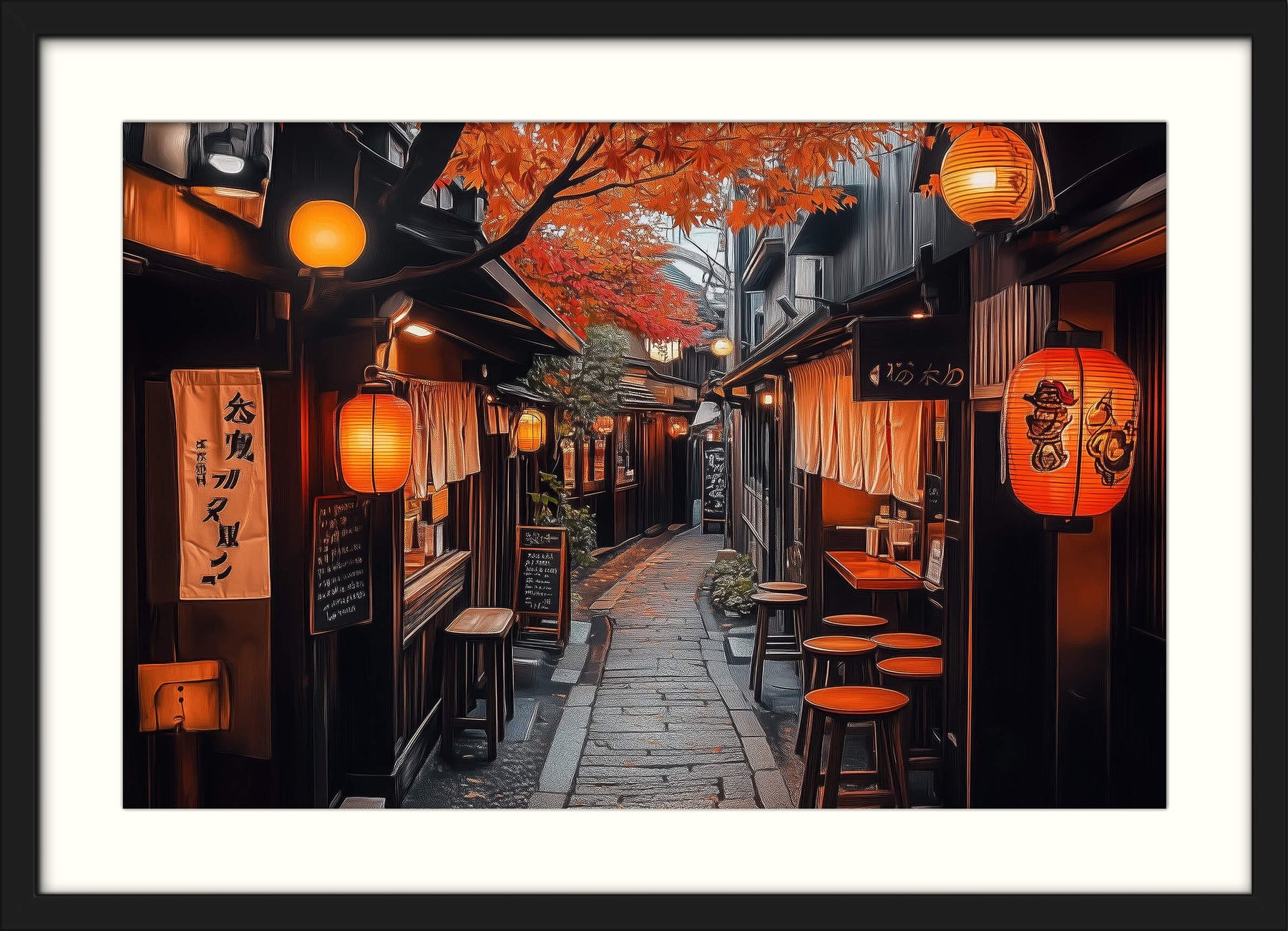 This atmospheric Japanese wall art print captures a narrow alleyway lined with traditional izakayas (Japanese bars), softly lit by glowing paper lanterns and cozy window lights. The scene is framed by red and orange autumn maple leaves overhead, evoking a calm evening ambiance in an old Tokyo neighborhood. The dark wood buildings, noren curtains, and hand-written chalkboards add an authentic local charm.