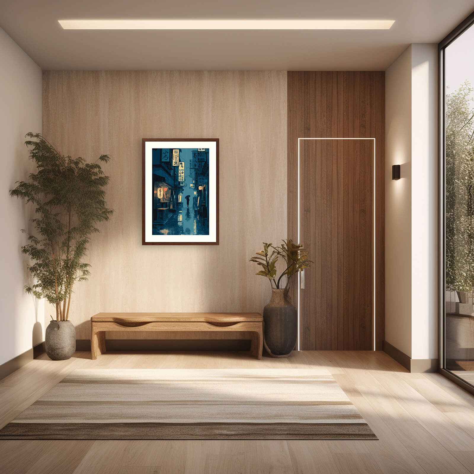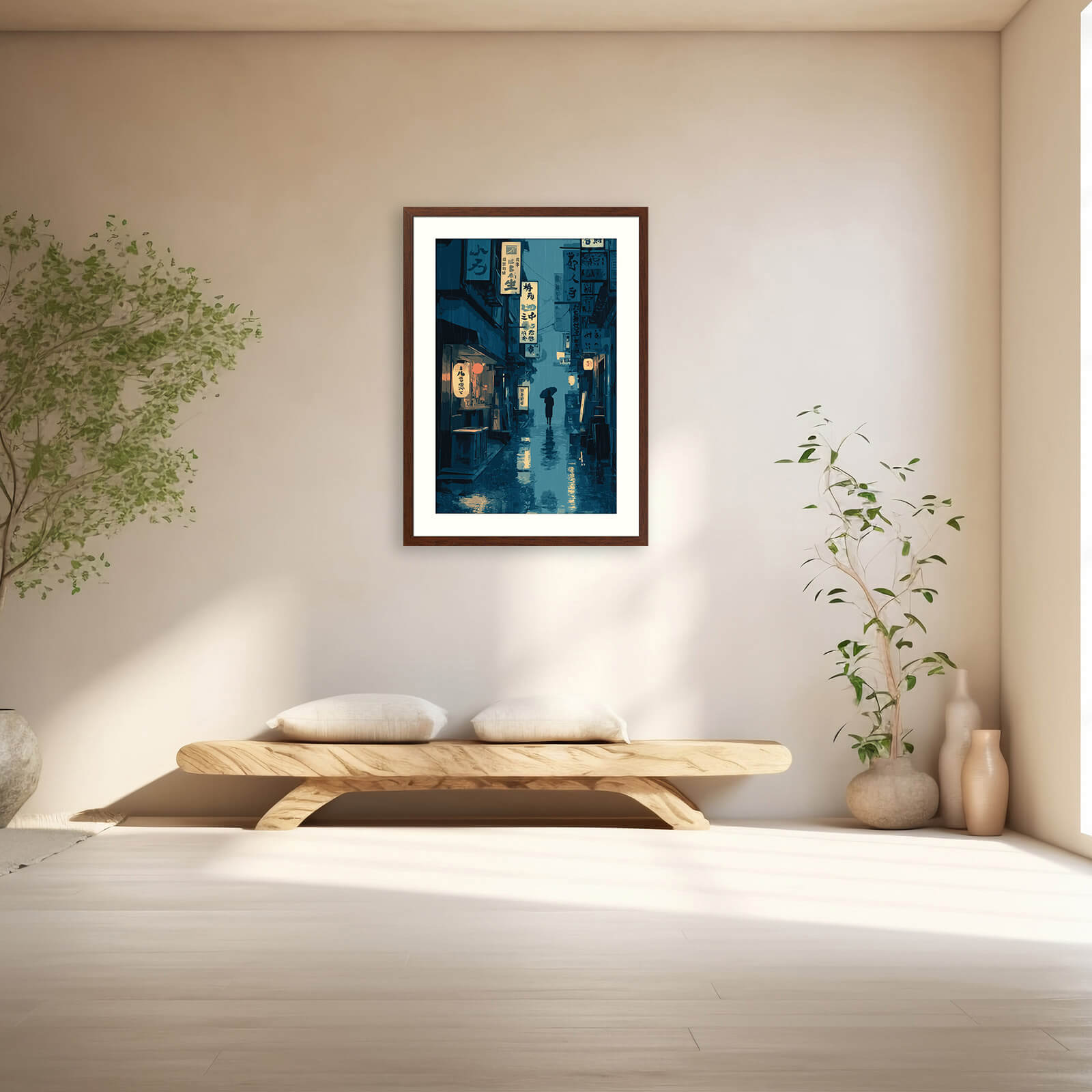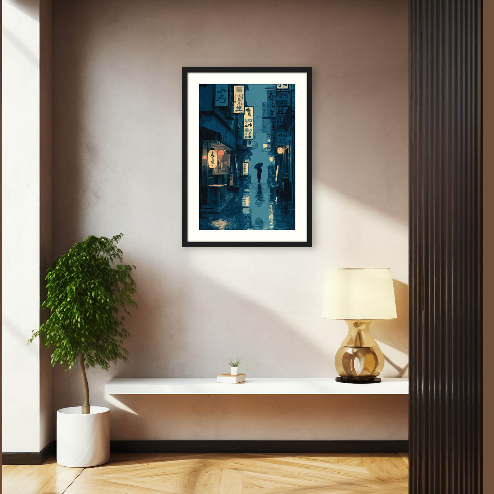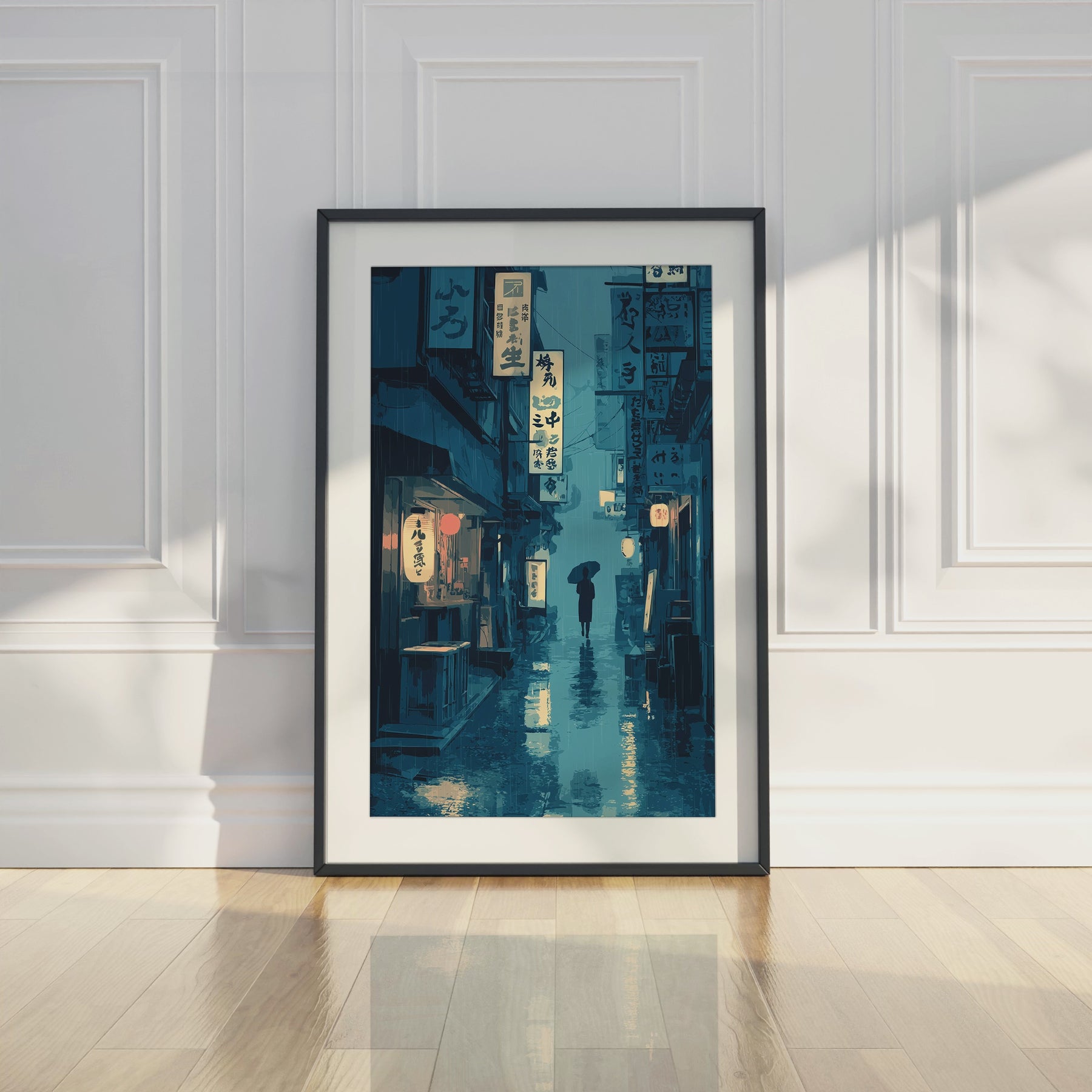 A lone figure with an umbrella walks through a dimly lit Tokyo alley, where glowing lanterns and vertical signs flicker against the steady rain. The wet pavement mirrors the blue-toned atmosphere, creating a cinematic sense of stillness and solitude. This evocative artwork blends Street Scene realism with a Stylised & Illustrative approach, capturing the quiet poetry of a rainy night in Japan.