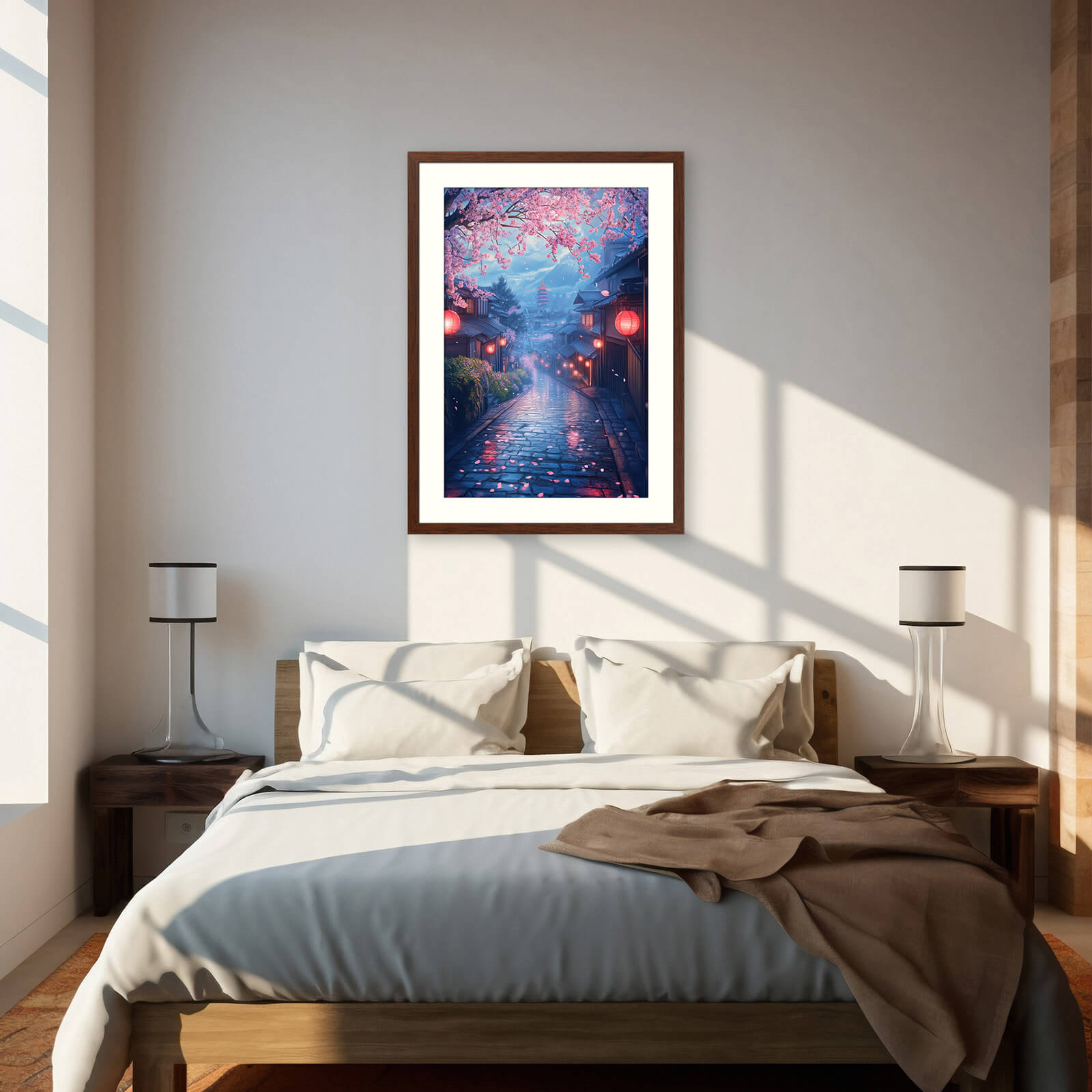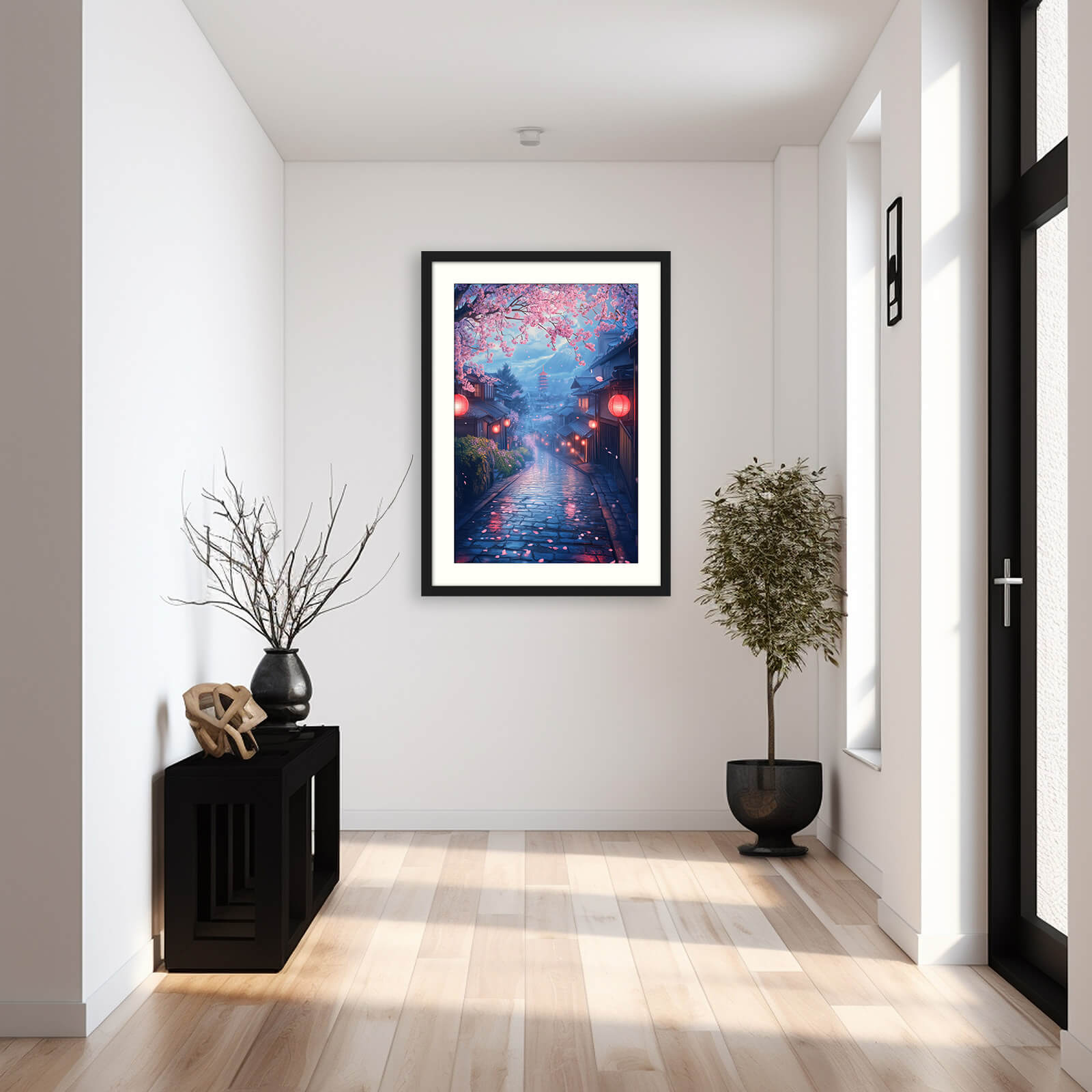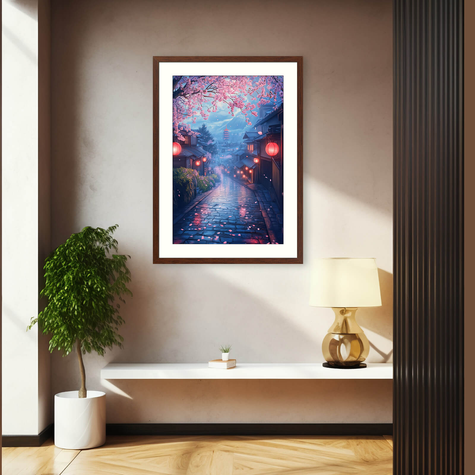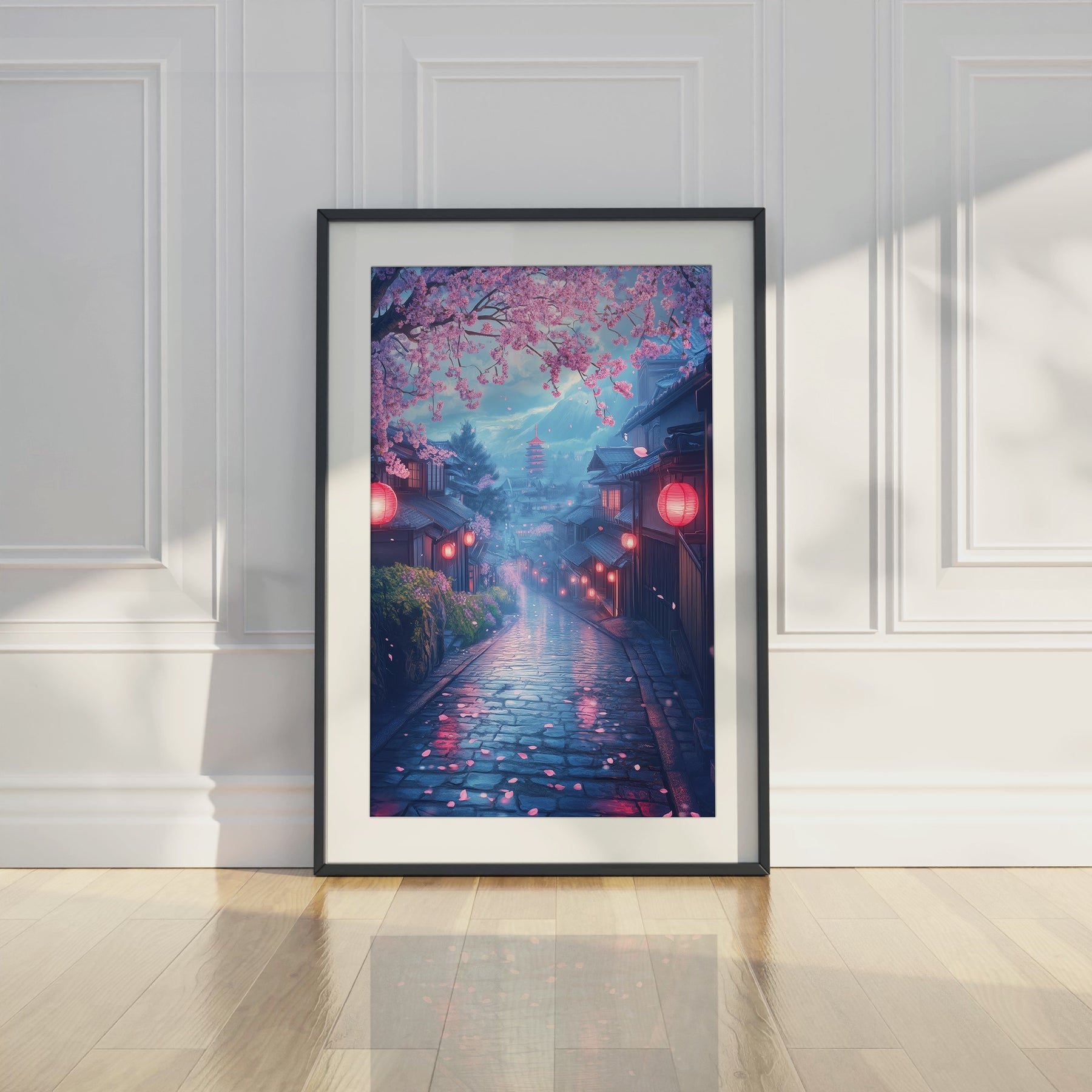 Japanese inspired wall art print with sakura, lanterns, and a twilight street