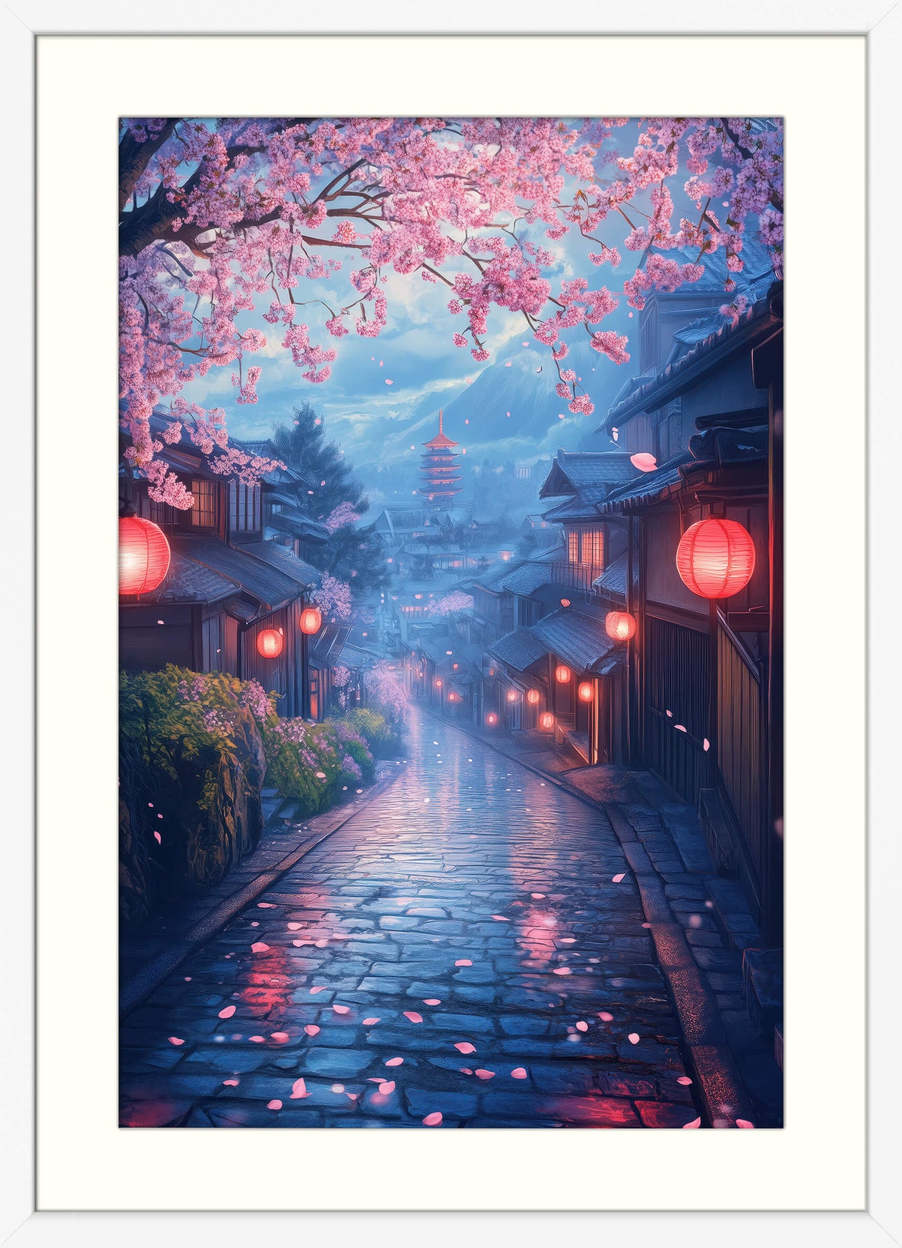 This wall art print captures a magical evening scene beneath blooming cherry blossoms. Glowing lanterns line a cobbled Kyoto street, leading the eye toward a distant pagoda and the silhouette of Mt. Fuji beneath a lavender sky. Petals fall gently through the air, reflecting light across the wet pavement. Rich in detail and atmosphere, this stylised & illustrative piece evokes the beauty of hanami at dusk.