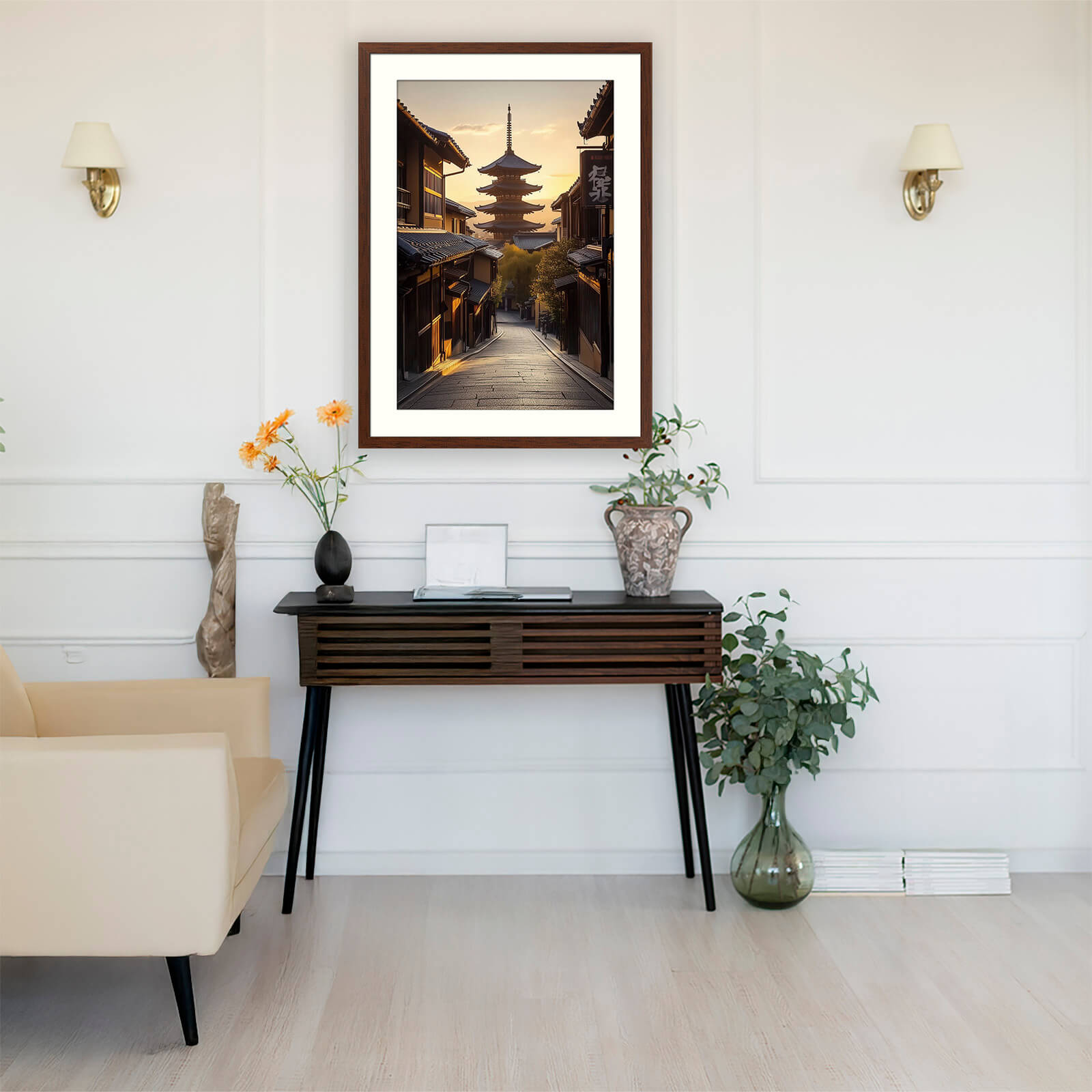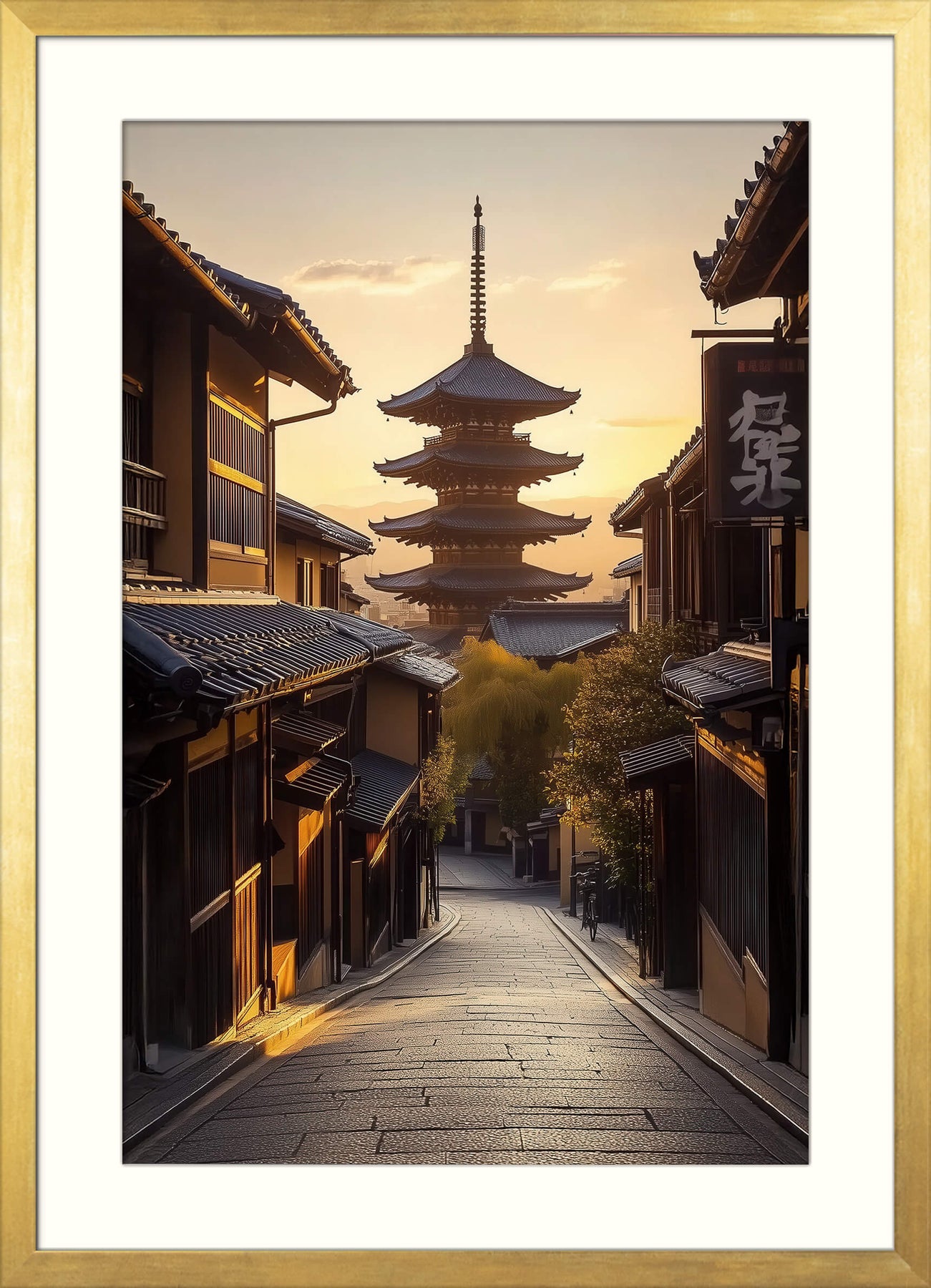 This captivating Kyoto wall art features the iconic Yasaka Pagoda bathed in warm sunset light, viewed from a traditional street in the historic Higashiyama district. The soft glow, quiet architecture, and detailed textures evoke a deep sense of place and stillness.