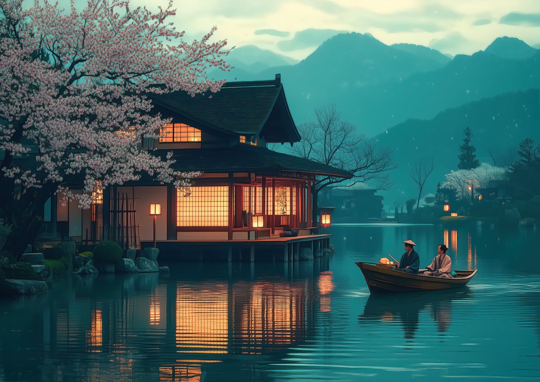 This Japanese lake house print shows a traditional house on a calm lake at dusk, illuminated warmly and framed by blossom trees and distant mountains in soft teal tones. The reflection in the water and gentle lighting evoke a peaceful scene that blends traditional Japanese and Ukiyo-e aesthetics. It’s ideal for a living room, bedroom, study, or any space where calm and culture enhance the atmosphere. The composition with the house, boat (if present), blossom accents, and muted yet rich colour palette complements Japandi, Minimalist, or Wabi Sabi interiors. Detailed architecture and delicate trees add layers of interest without overwhelming the room.