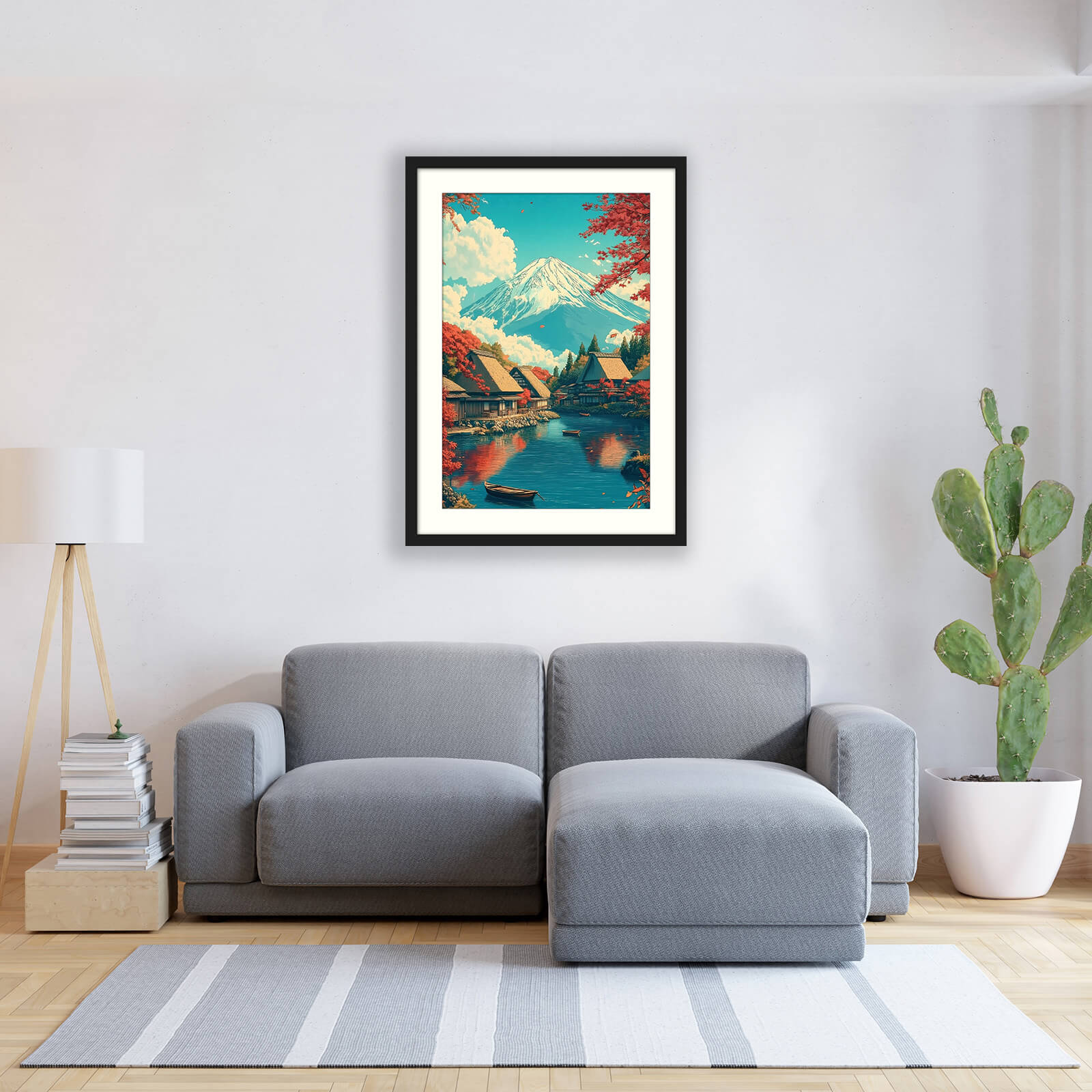 Japanese landscape print showing a vibrant scene of a lakeside Japanese village with mountains rising in the distance in the style of Mount Fuji wall art. This Japanese lake print captures lush foliage, traditional houses, calm water reflections and dramatic sky colour. The composition frames a peaceful path by the lake, serene water, bold trees, and majestic peak — bringing a sense of calm and beauty. Ideal for living rooms, studies, or hallways where nature and traditional Japanese aesthetics can anchor the décor. Works especially well in Japandi, Ukiyo (woodblock), or stylised & illustrative interiors.