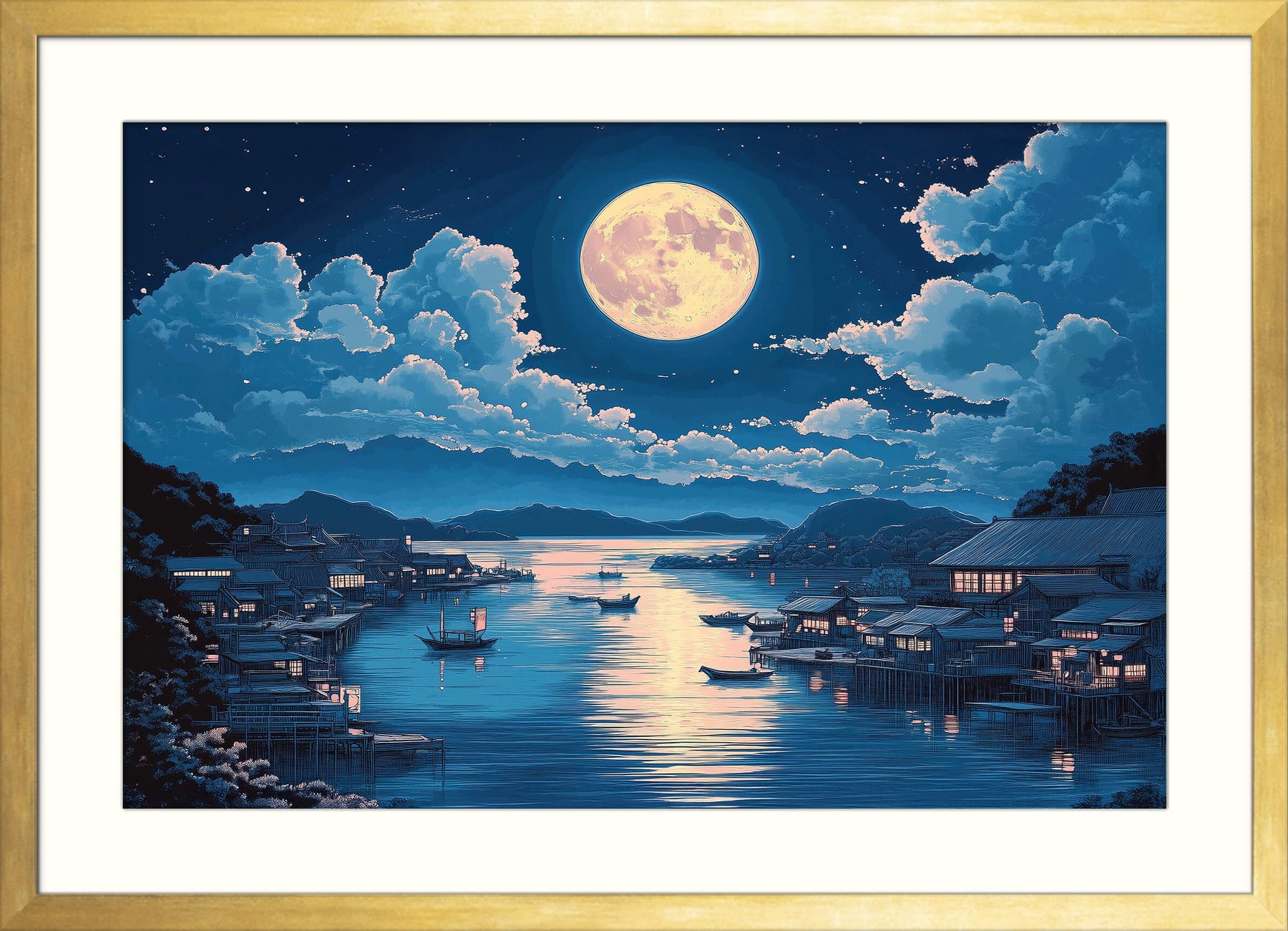 Japanese moon landscape wall art featuring a tranquil moonlit view of houses by the water with boats and glowing reflections. This Ukiyo‑e style Japanese moon print captures moonlight Japanese wall art aesthetics with calm skies, soft moon glow, and traditional architecture.