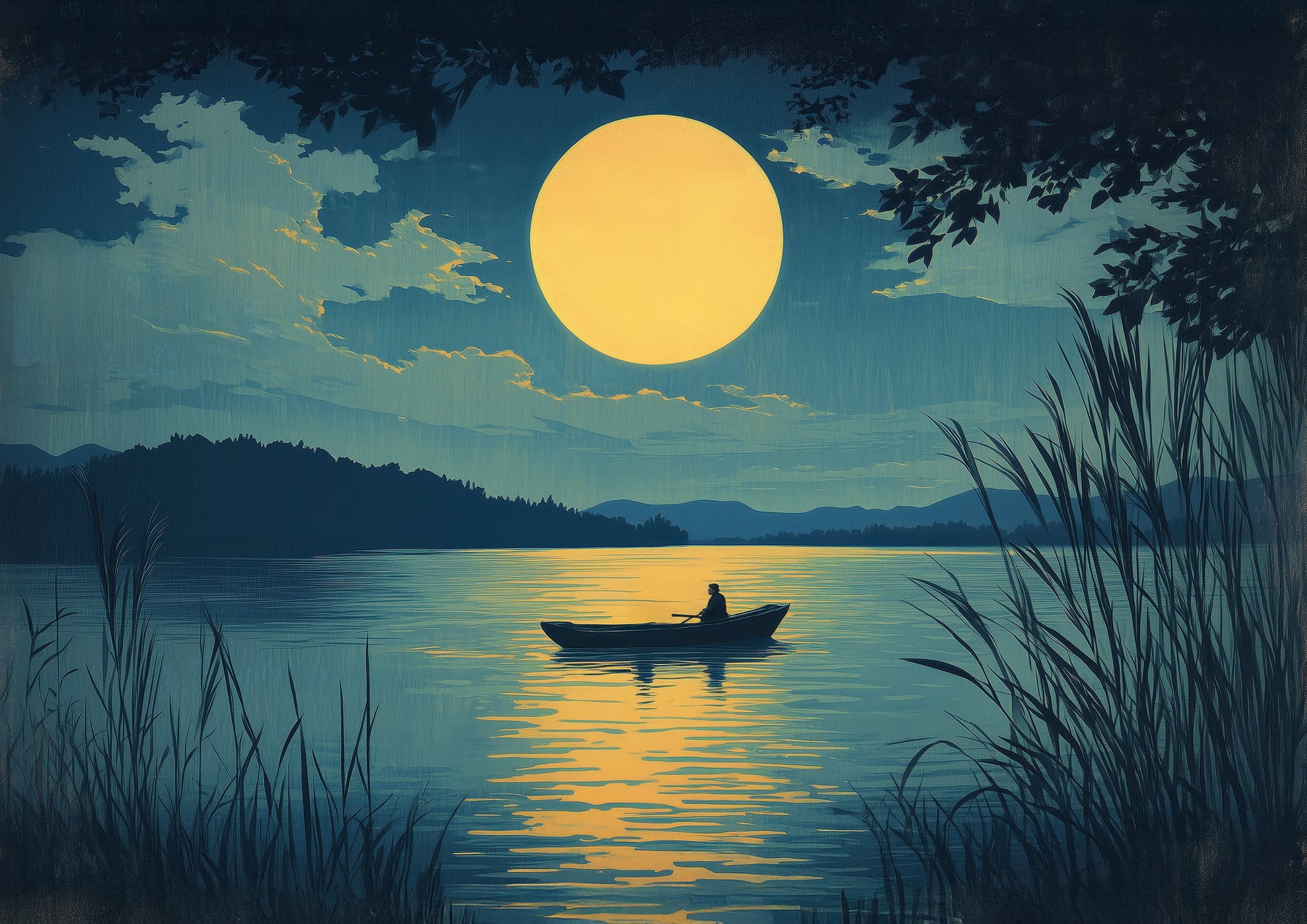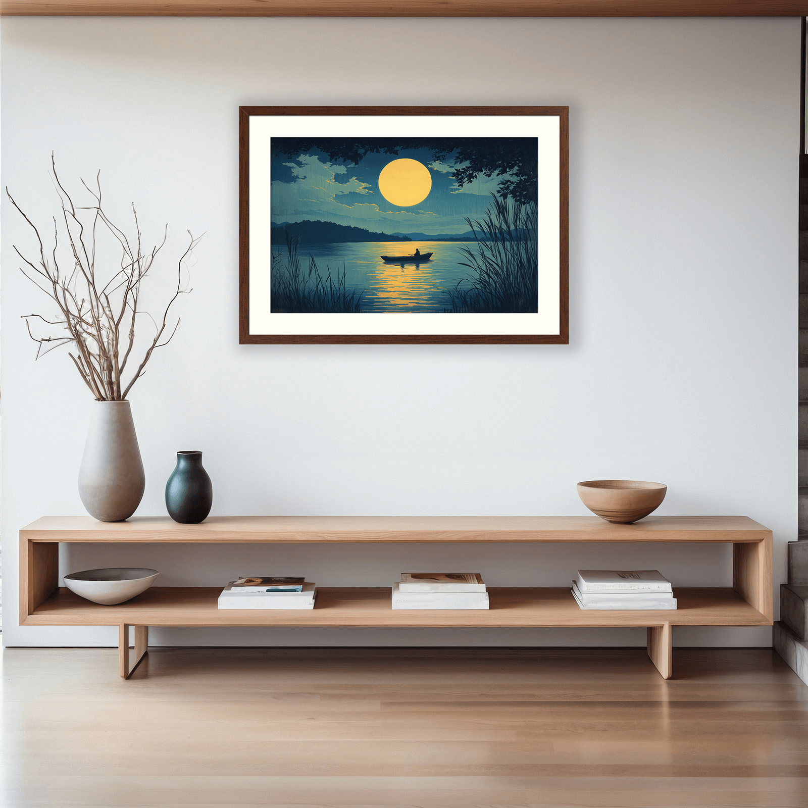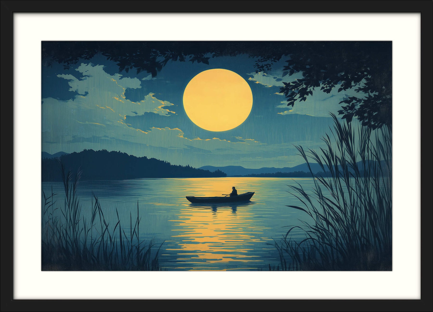 Japanese moonlight lake print captures a solitary boat drifting on calm water under a full moon, in a style that draws on traditional Japanese woodblock (Ukiyo-e) art. The soft glow of moonlight reflecting across the lake and the dark silhouette of trees and grasses create a peaceful, meditative scene. This print works beautifully in bedrooms, living rooms, hallways, or any space where you want a serene focal point. The minimal composition with a bold moon and reflective water draws the eye, while the cool blues and gold tones make it easy to pair with Japandi or Zen décor. A great choice for lovers of nature, moonlight, and Japanese style art.