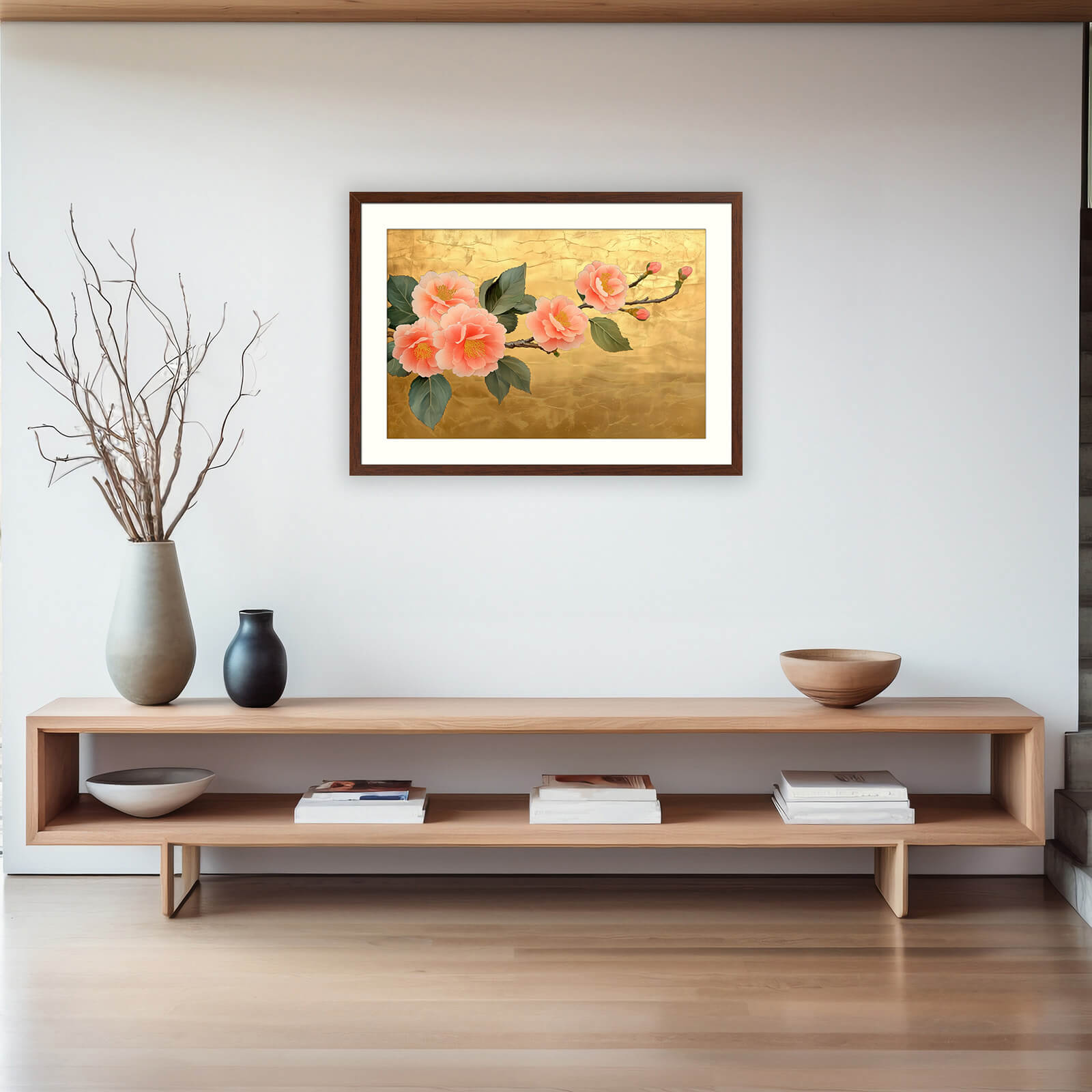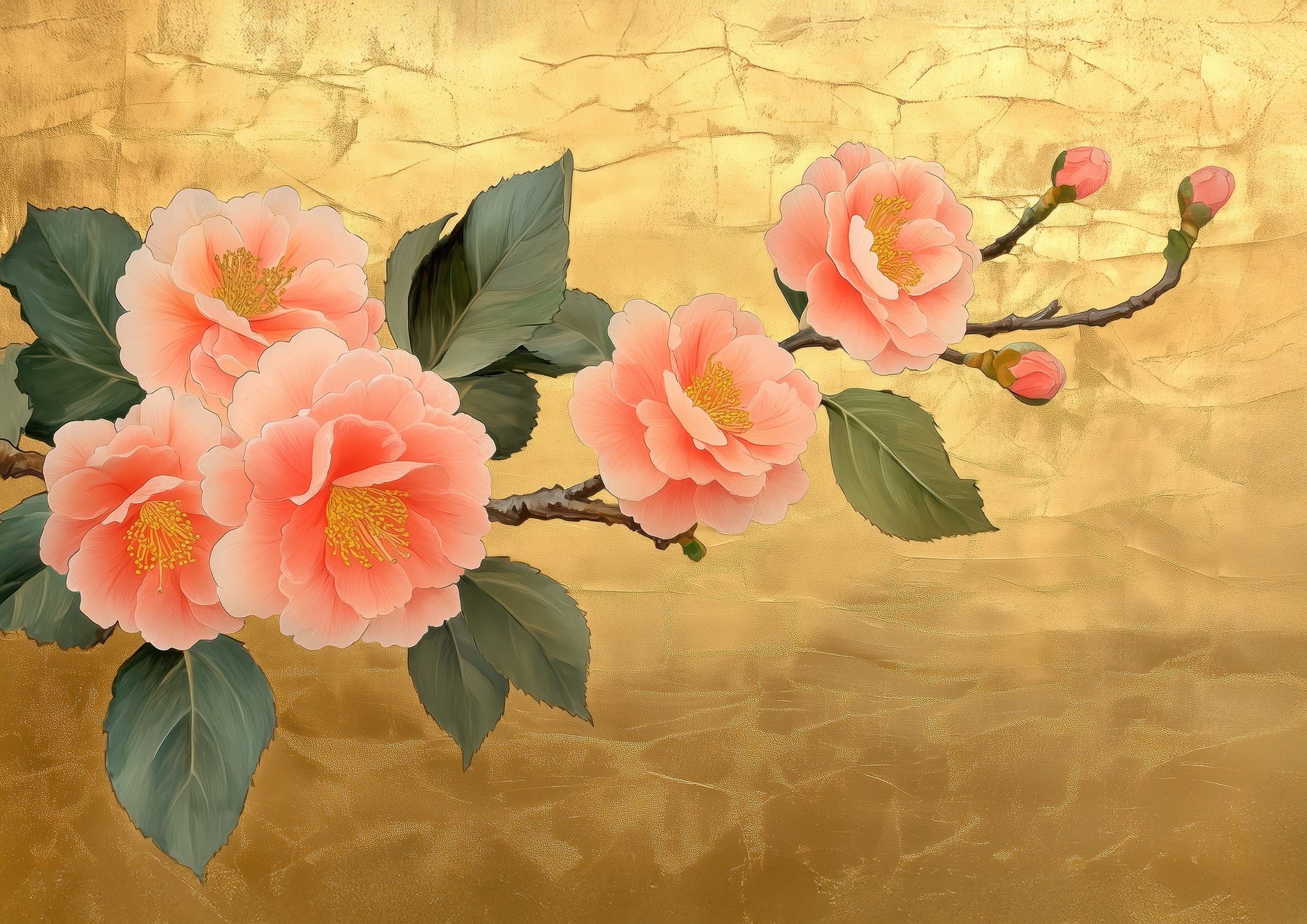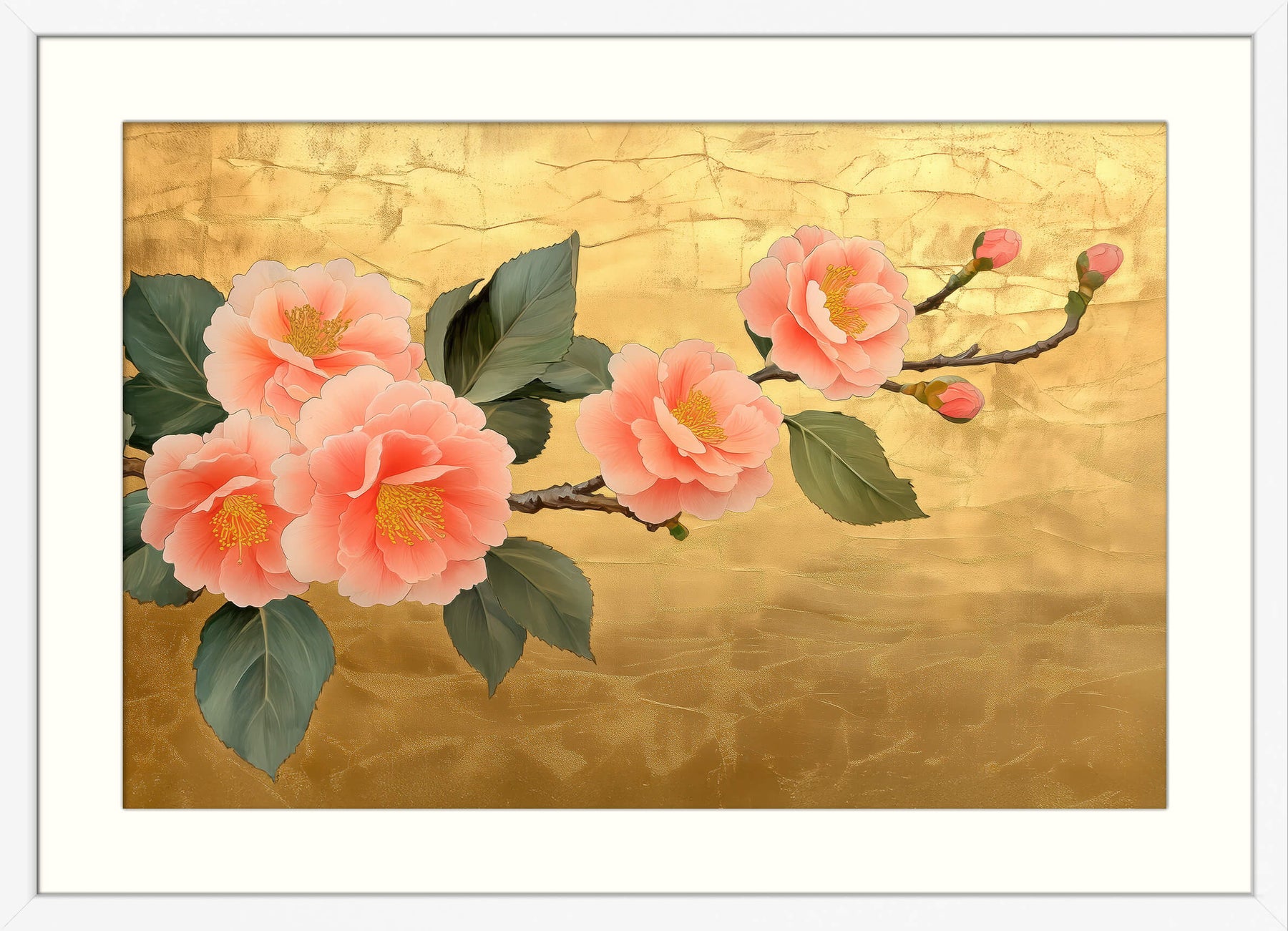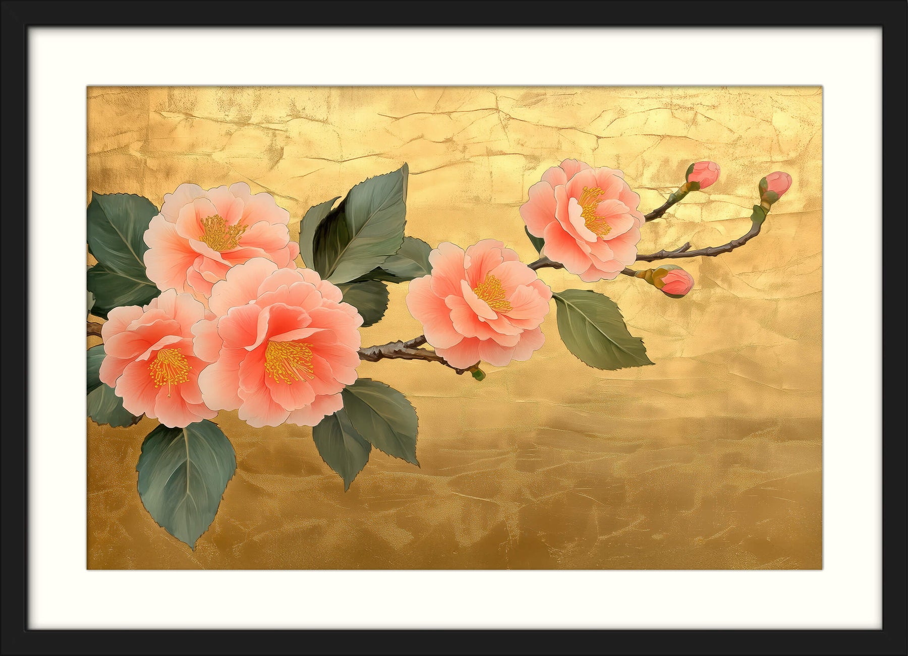 Gold cherry blossom wall art showcases blooming sakura or cherry blossoms set against a shimmering gold background, blending elegance with Japanese floral gold art style. This piece presents soft peach-pink petals and rich green foliage contrasted with metallic gold tones for a luxurious and serene effect.