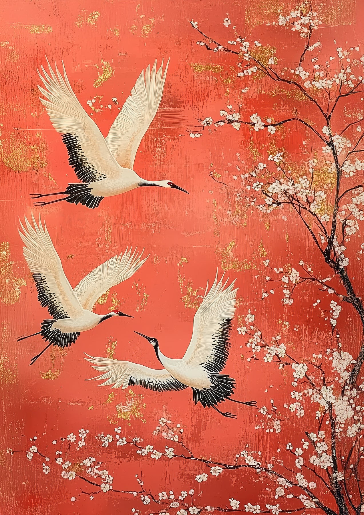 Japanese crane wall art captures three graceful cranes in flight soaring past blossoms on a vibrant red-orange sky. This traditional Japanese bird art print brings dynamic energy and cultural elegance to your home. The scene features soft white plumage contrasting against warm, saturated background tones, delicate floral branches, and elegant composition. Ideal for a living room, bedroom, or hallway where artwork can draw the eye. Especially fitting among Japandi, Ukiyo, or stylised & illustrative interior styles.