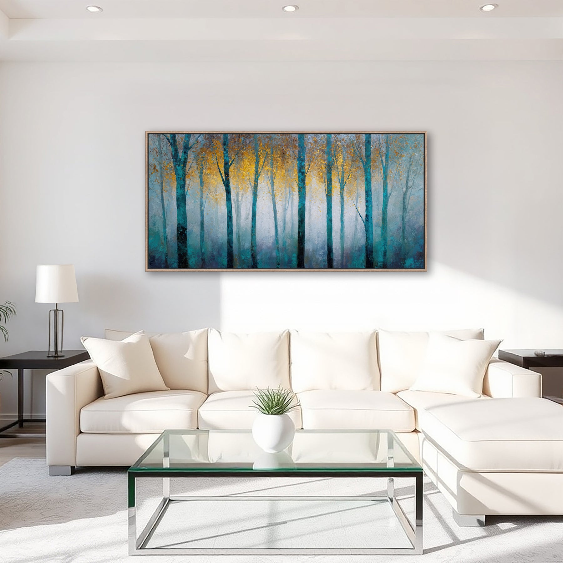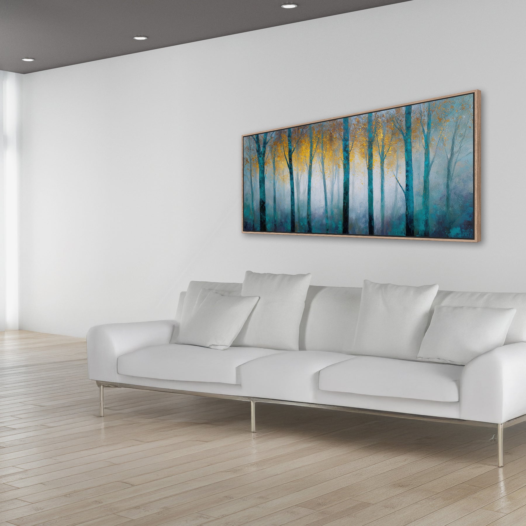 Wide format canvas art print featuring an abstract forest, with golden foliage against a blue and teal backdrop. This blue and gold wall decor creates an atmospheric focal point with its dreamy woodland scene and soft, luminous palette. The tranquil composition makes it perfect for living spaces and offices. Ideal for lovers of panoramic decor, forest landscapes, and gold and teal wall art themes.