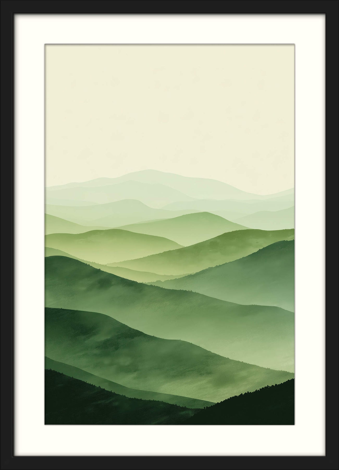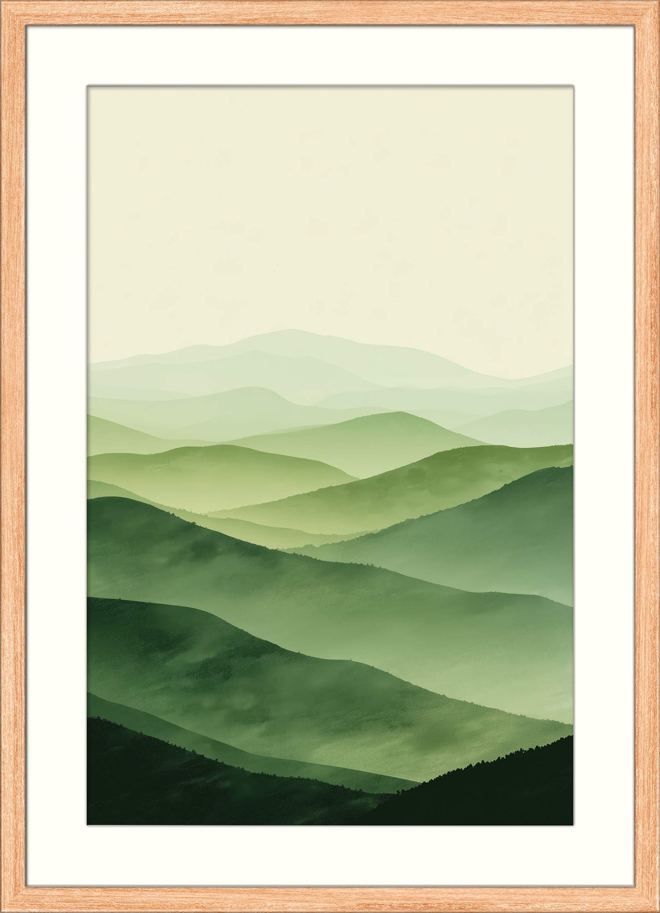 Abstract wall art print featuring layered mountain ridges in graduated shades of green from deep forest to soft sage, creating an atmospheric landscape with a minimalist aesthetic.