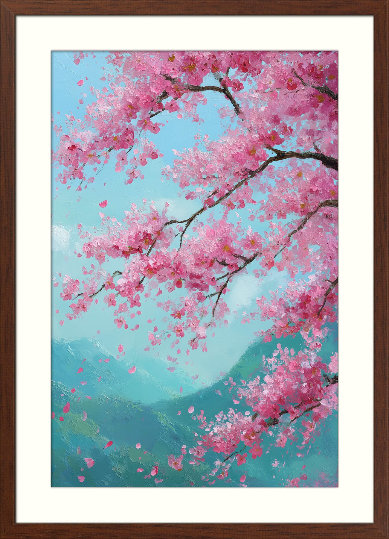 Japanese inspired wall art print capturing the fleeting beauty of cherry blossoms drifting through the spring air over soft green mountains. Painted in expressive brushstrokes with vibrant pink petals and a serene blue sky, the piece radiates freshness and gentle movement. Deeply rooted in Stylised & Illustrative traditions with Ukiyo-e (Woodblock) and Sumi-e (Ink Wash) influences, this artwork celebrates nature’s transient charm and brings seasonal elegance into your home.