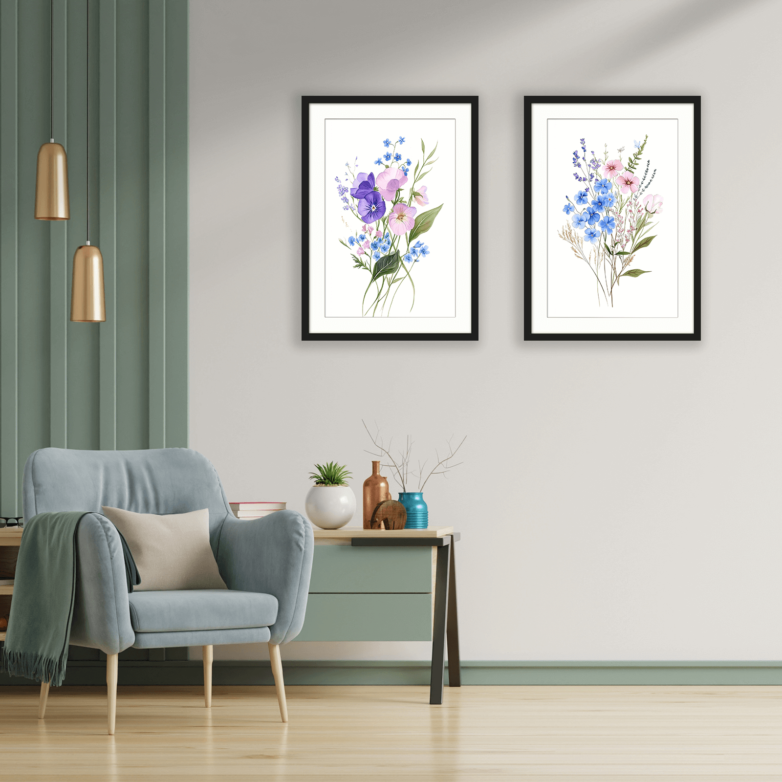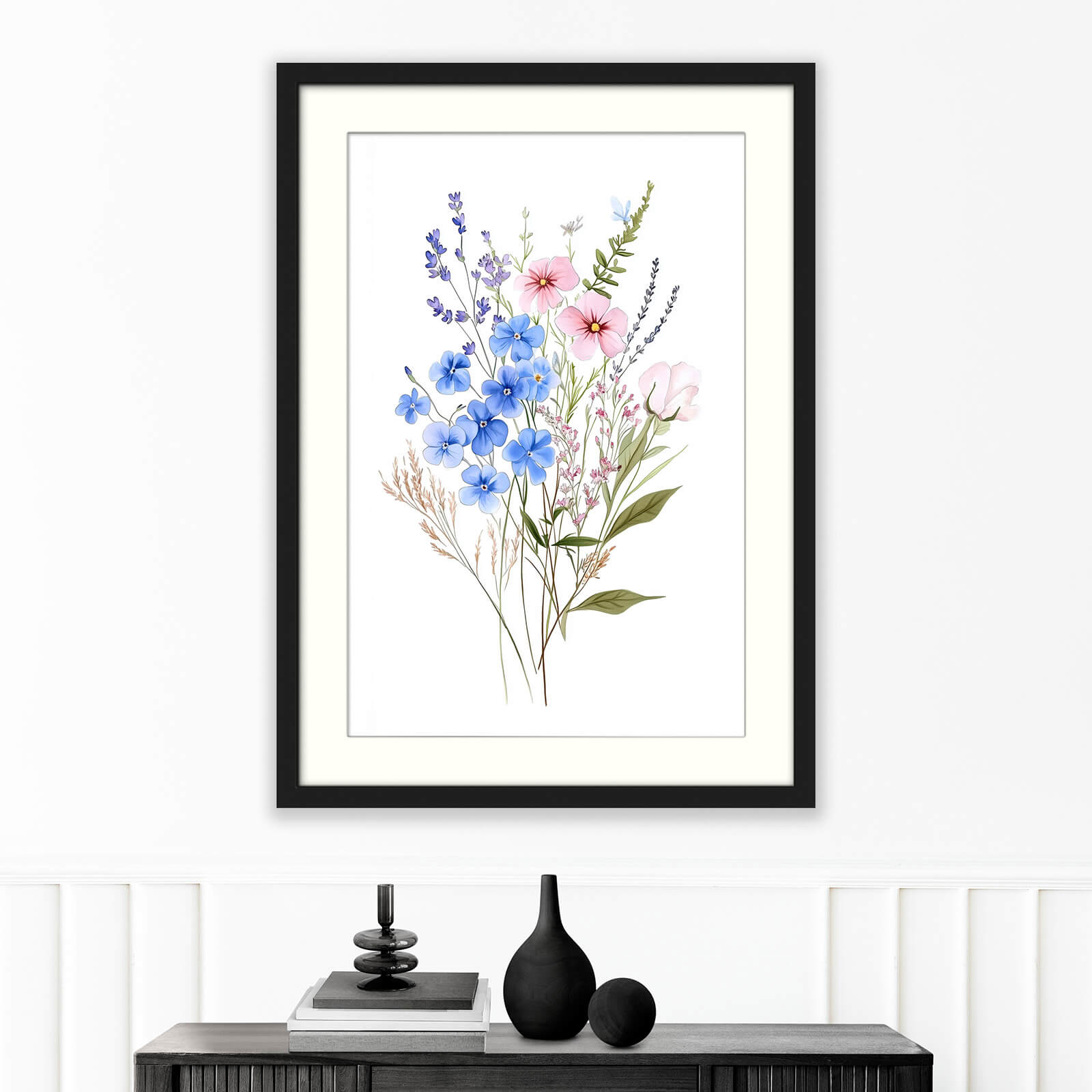 Each flower, leaf, and stem is finely detailed against a clean white background to keep the focus on the natural forms. The gentle colour palette means it pairs beautifully with neutral or pastel interiors. Ideal for bedrooms, living rooms, home offices, or bathroom walls where you want a touch of botanical charm without overwhelming the space.