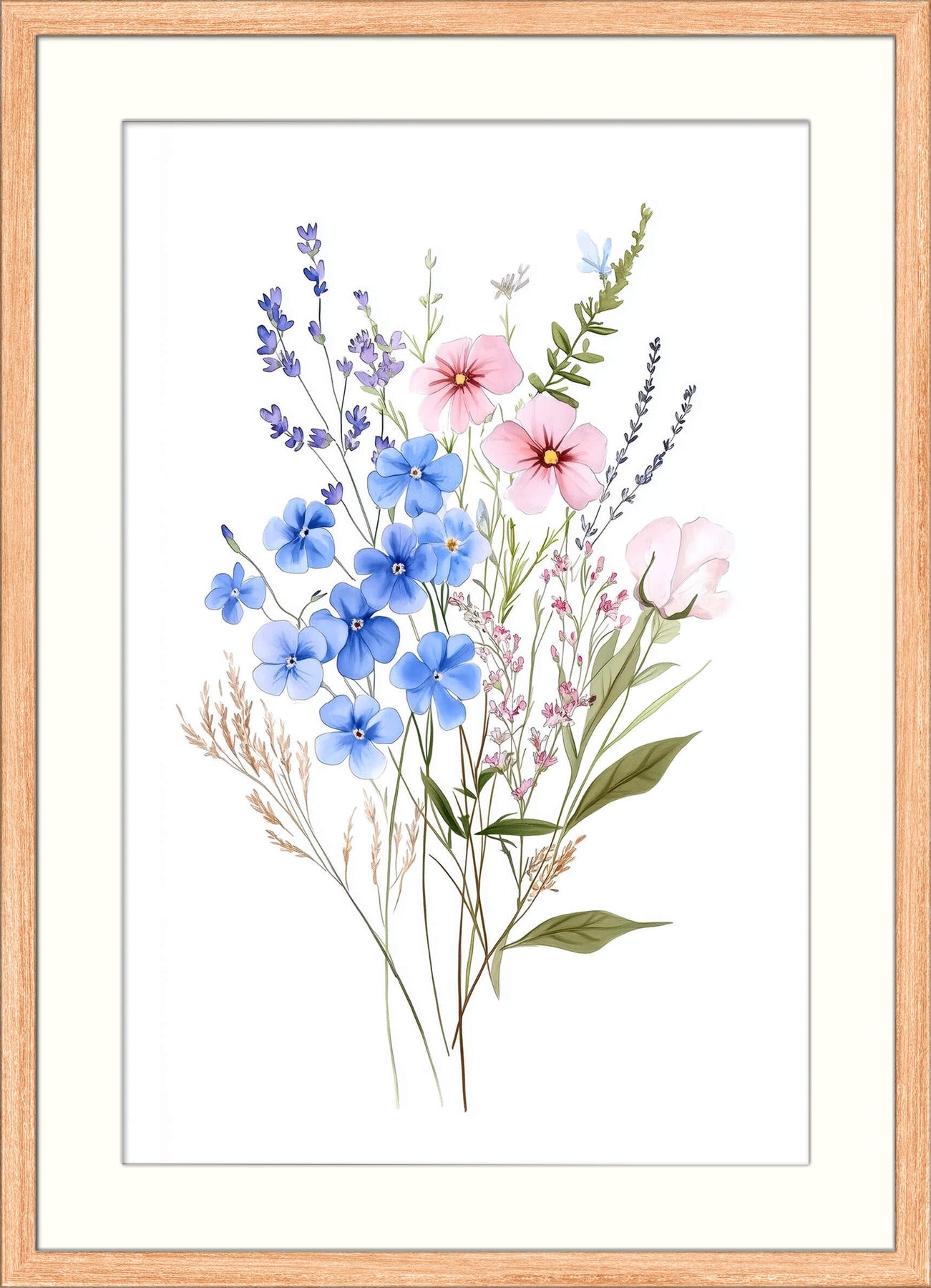 Botanical flower wall art print featuring a bouquet of pastel blue, soft lavender, and airy white blooms in a delicate illustration style. This floral illustration wall art brings calm elegance and natural beauty into any room, while still maintaining a minimalist look and light visual texture.