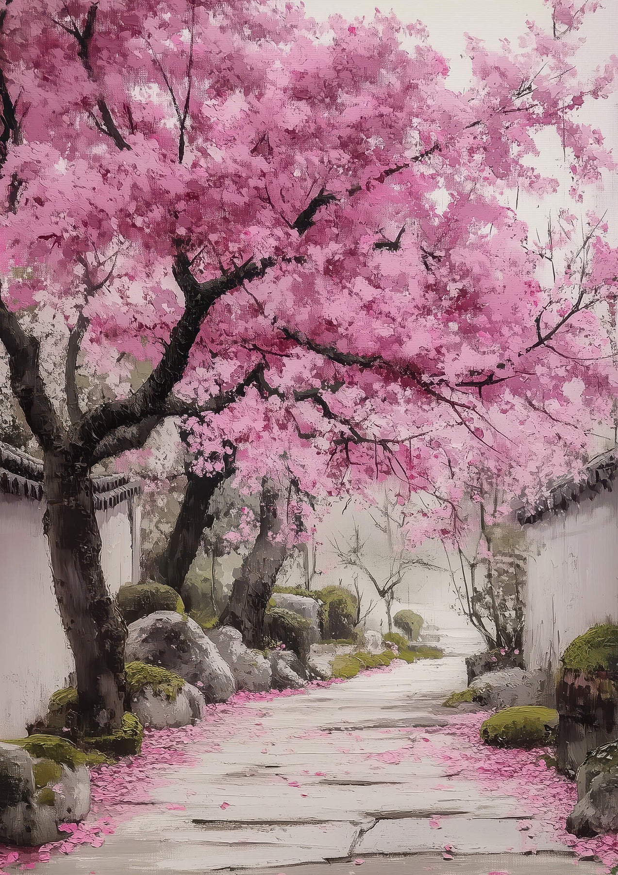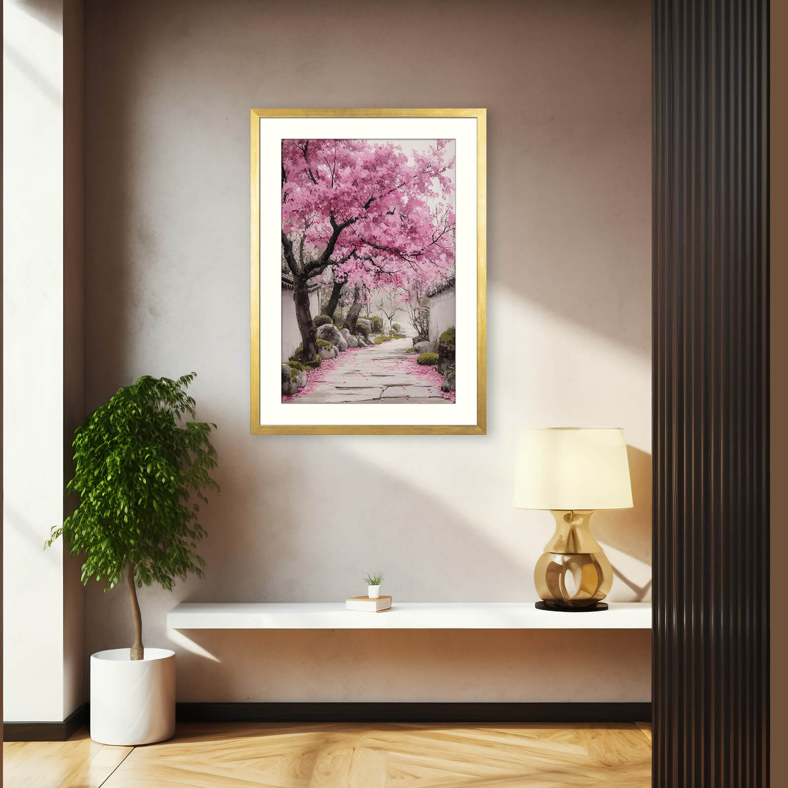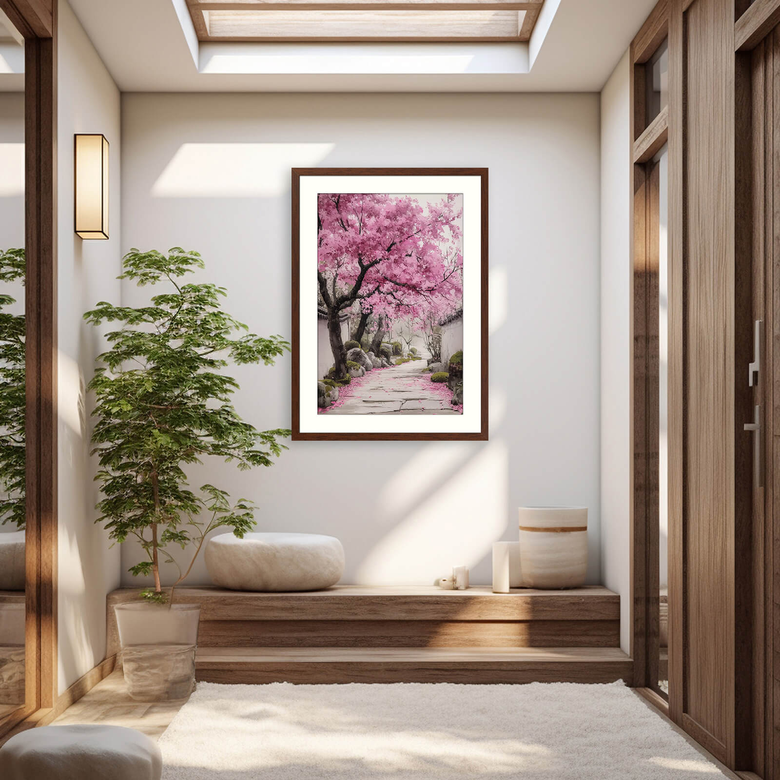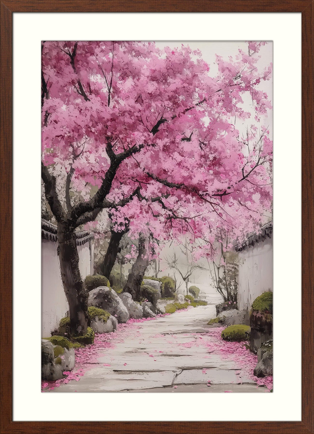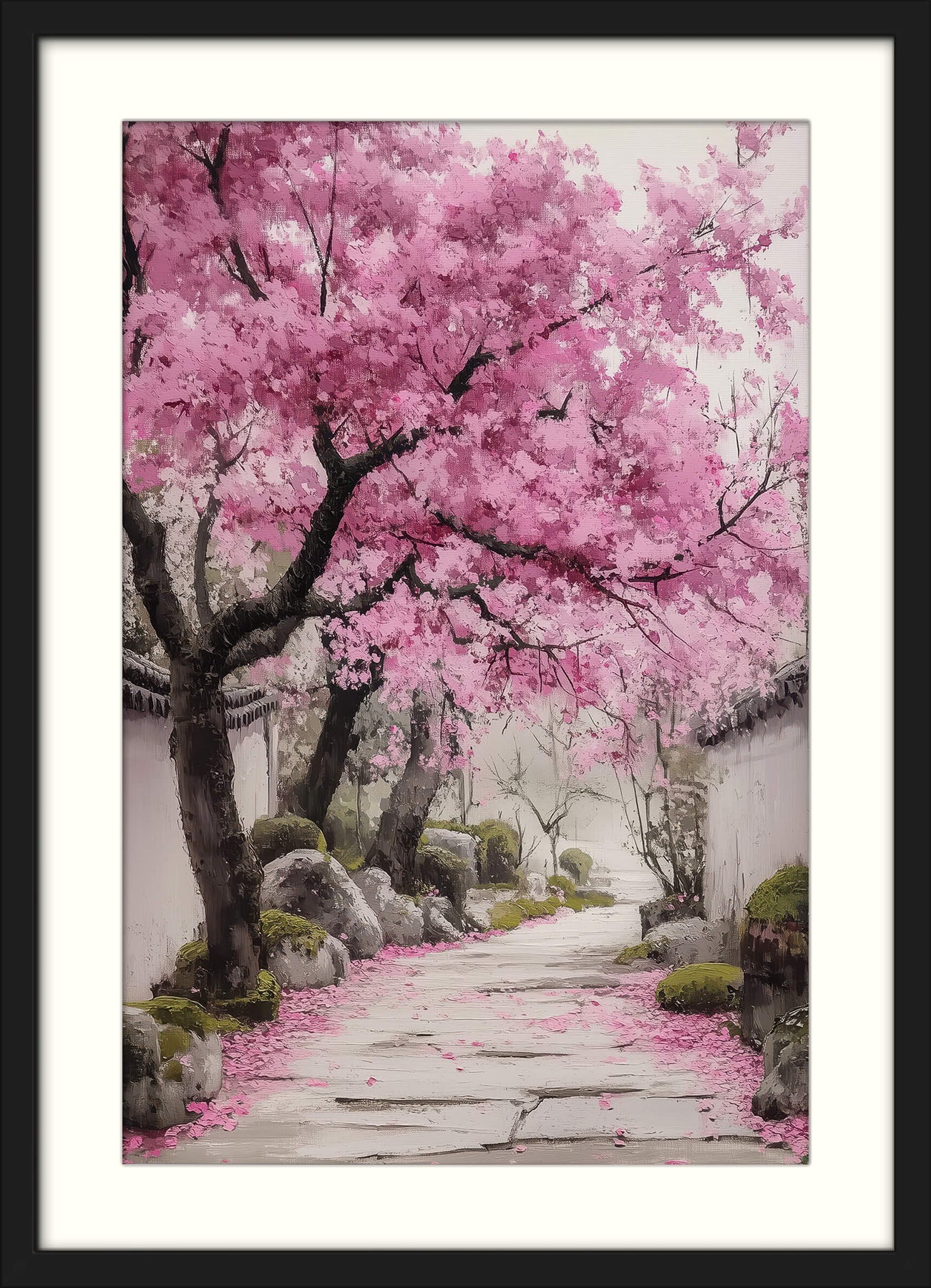 Japanese wall art print capturing the peaceful charm of a stone path beneath blooming sakura trees. Soft pink petals drift to the ground, forming a delicate carpet along the walkway, while traditional white walls and mossy stones complete the scene. This stylised street scene evokes the fleeting beauty of hanami season — perfect for adding calm and colour to any space.