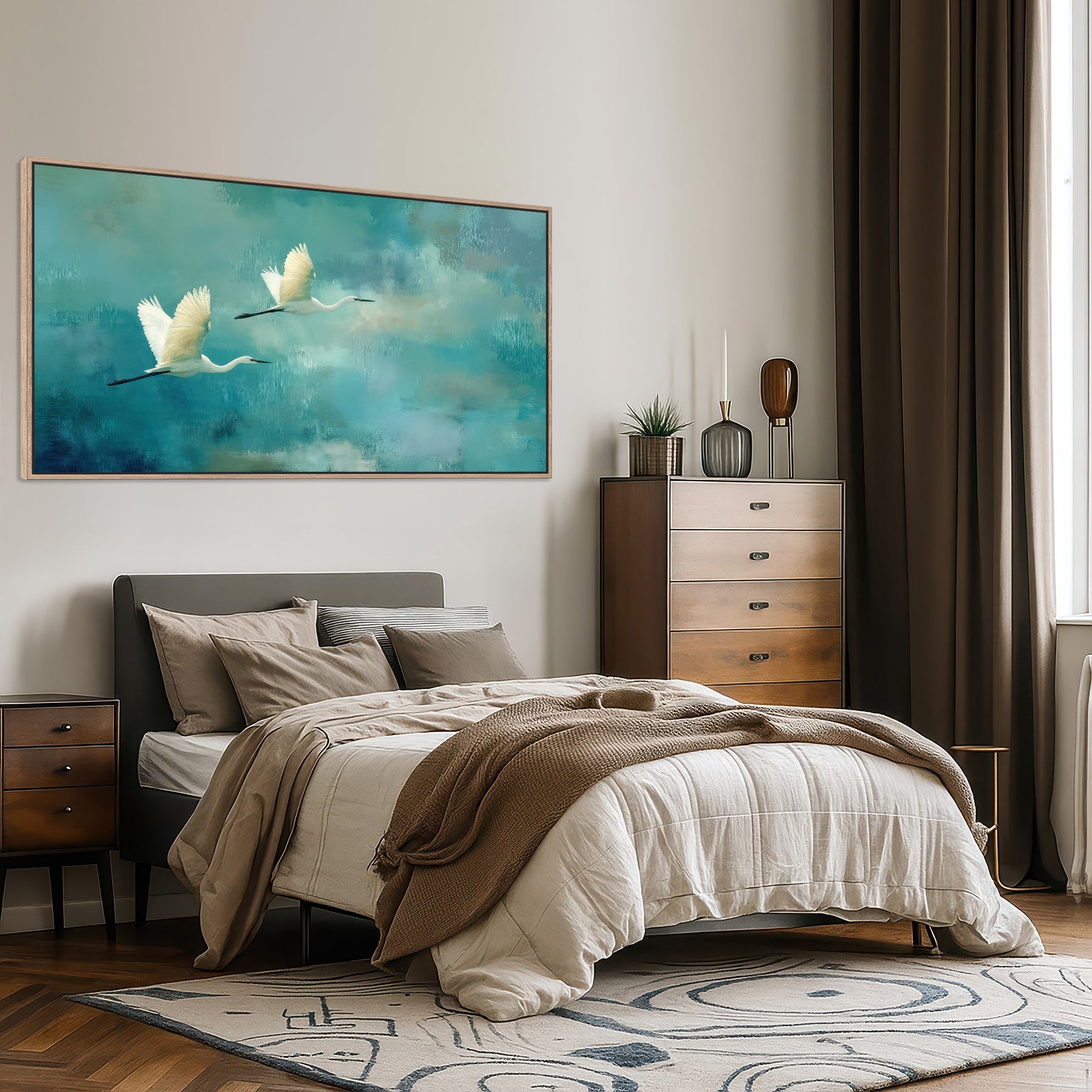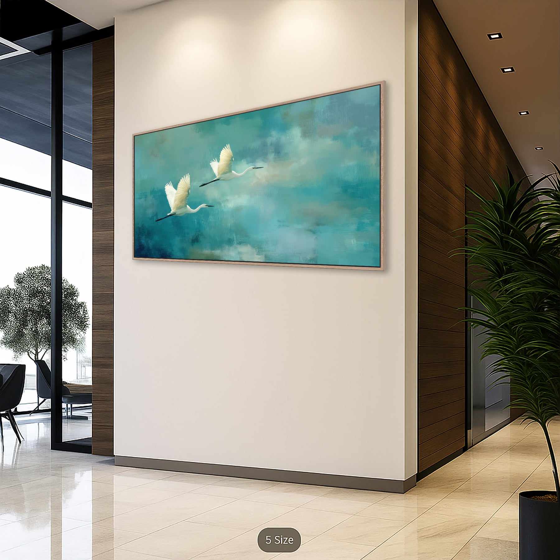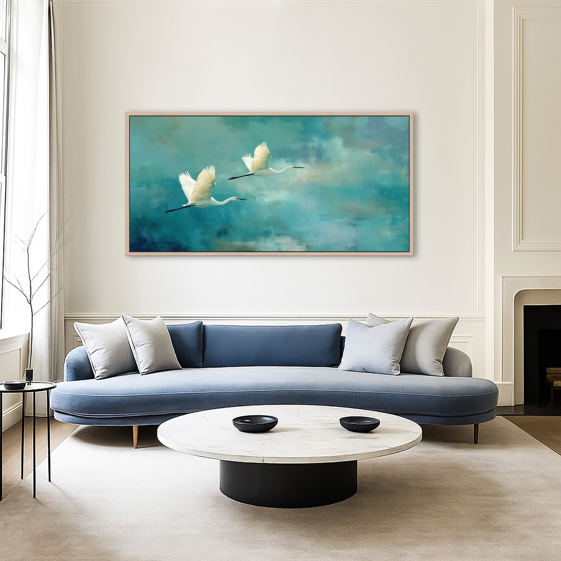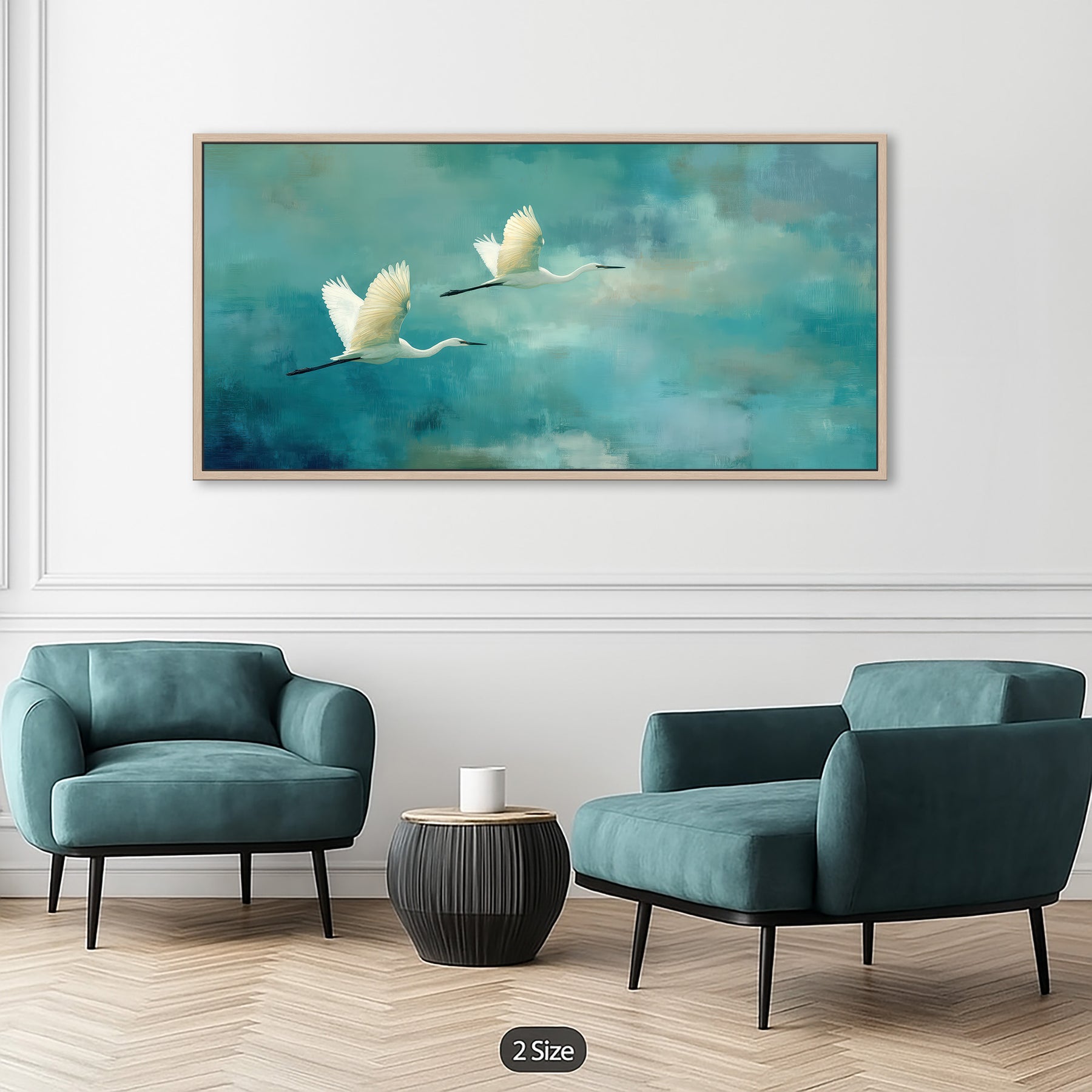 Large canvas art featuring two elegant white cranes in flight against a soft teal and turquoise sky. Rendered in calming shades of teal, cream, and gentle blue, this crane wall art captures a peaceful moment with outstretched wings and flowing movement. Perfect for living rooms, bedrooms, or nature-inspired spaces. Ideal for lovers of blue canvas decor, cloudscape themes, and bird wall art.