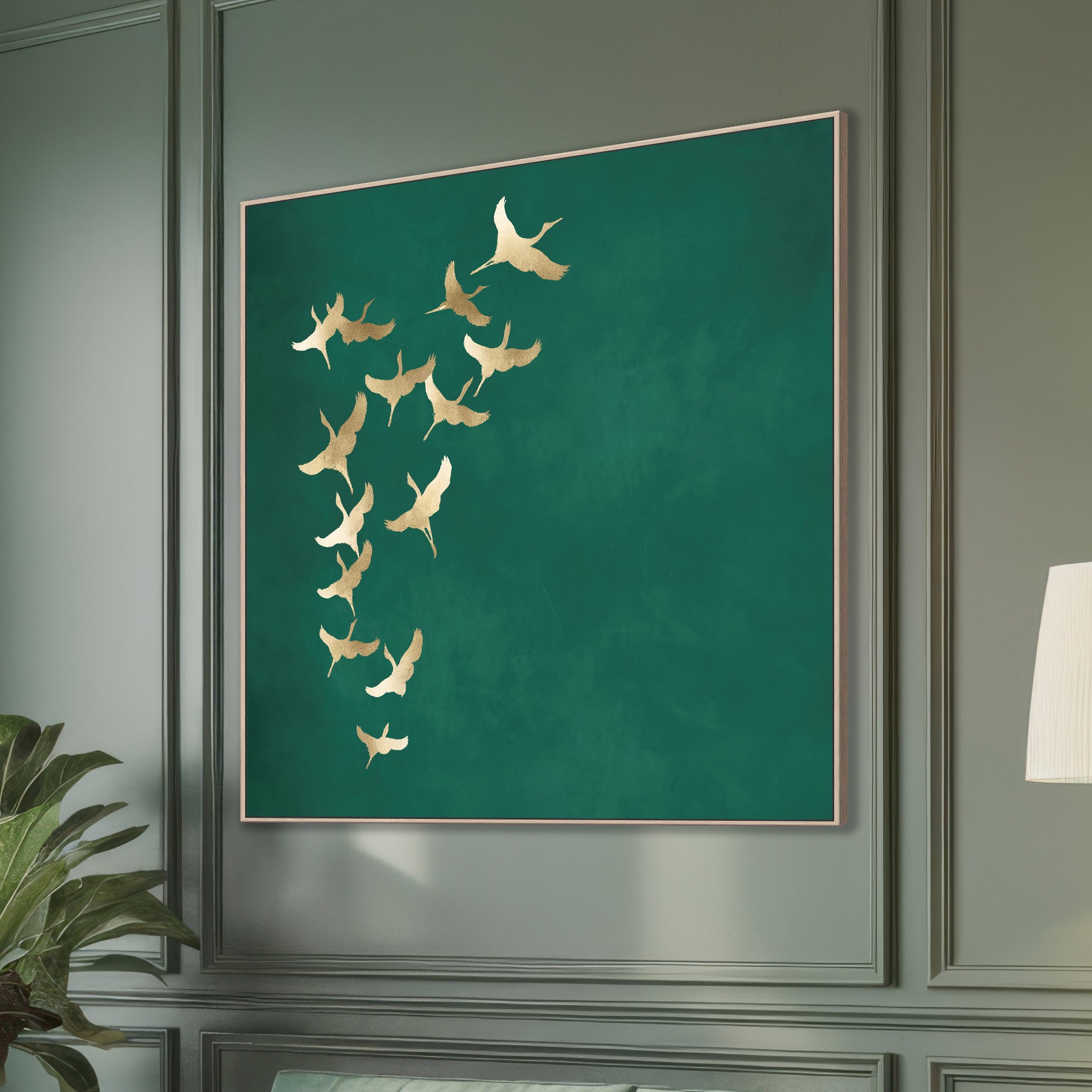 Canvas wall art featuring a flock of gold cranes in flight against a deep teal green background. This minimalist canvas piece shows bird silhouettes with gold accents arranged in a flowing diagonal pattern across the canvas. Perfect for classical and contemporary interiors. Ideal for lovers of crane wall art themes, teal canvas decor, and bird flock nature wall art.